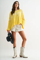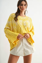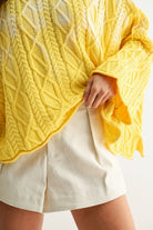 This yellow cable knit oversized sweater features a relaxed fit and a geometric cable pattern throughout the fabric. The wide sleeves and slightly scalloped hemline add to its loose and comfortable design. The crew neckline and dropped shoulders contribute to the casual, effortless look. The sweater is lightweight and suitable for layering over other garments.