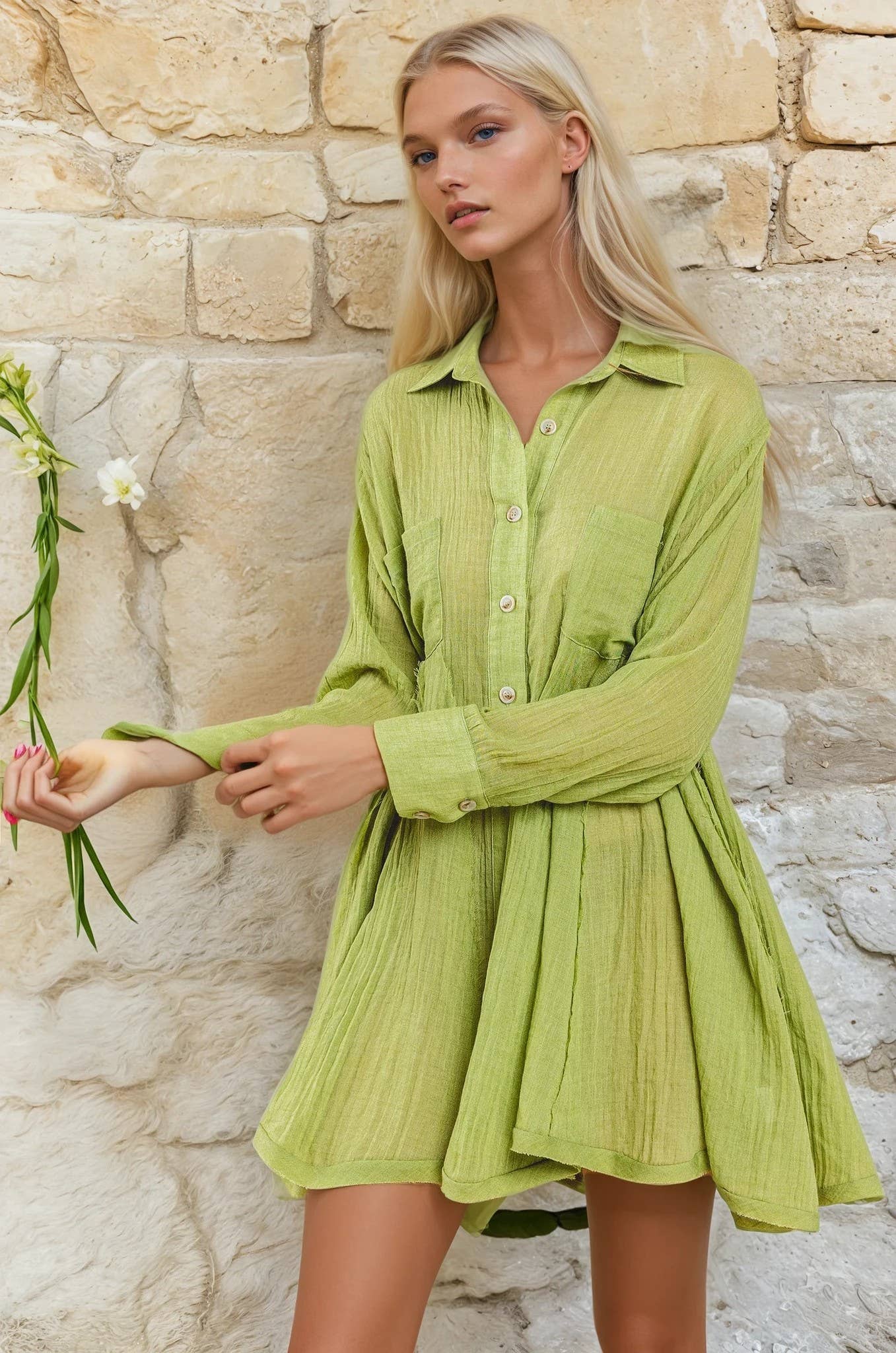 Float through your day in effortless style with the Wisteria Lane Lime Gauze Wide Sweep Paneled Shirt Dress. Crafted from lightweight, breathable gauze fabric, this easygoing piece features a relaxed button-front design with dramatic wide sweep paneling that creates beautiful movement with every step.