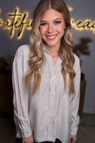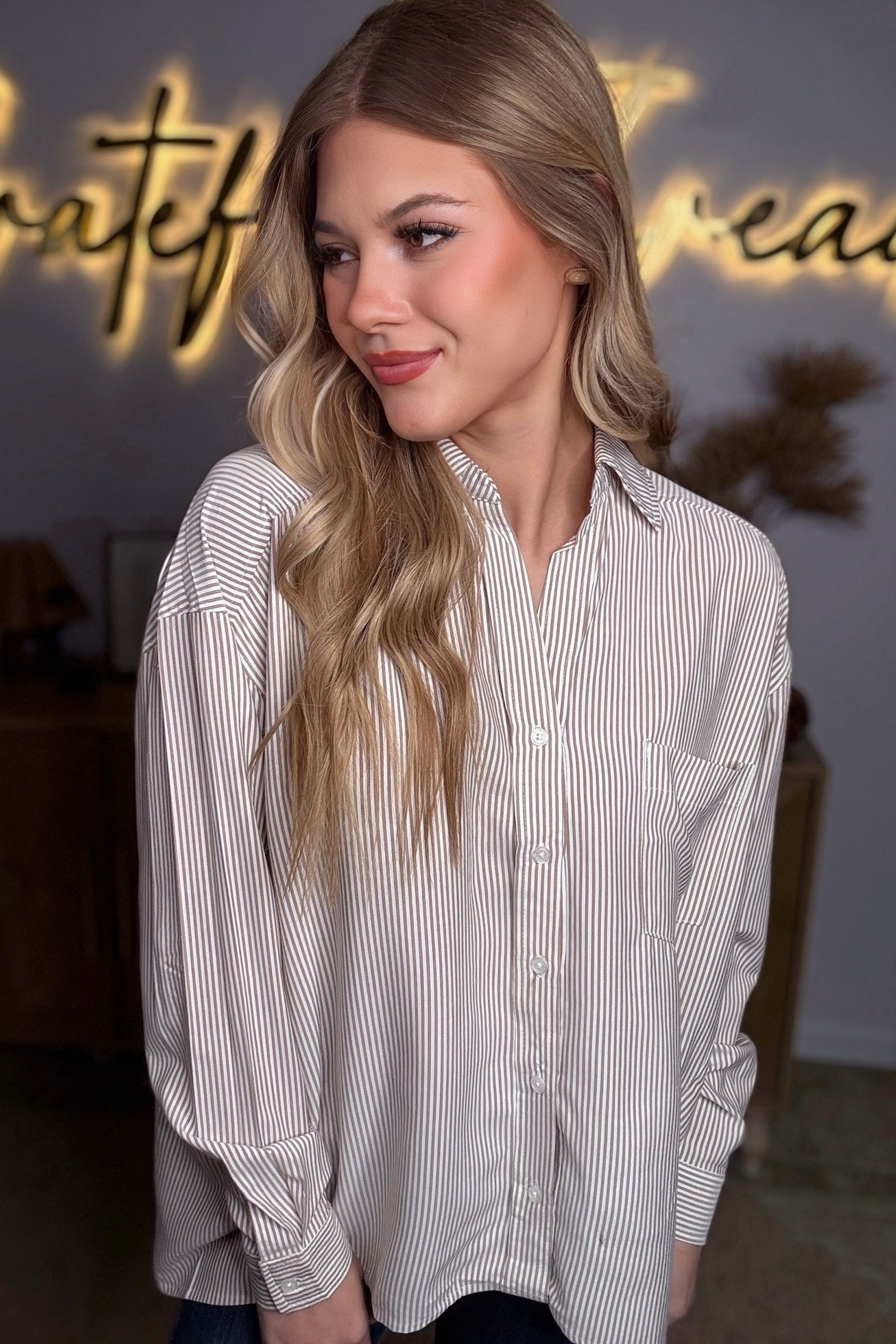 Active Basic | Active USA - Long Dolman Sleeve Oversized Stripe Button Up Collared Shirt: Khaki/Off White