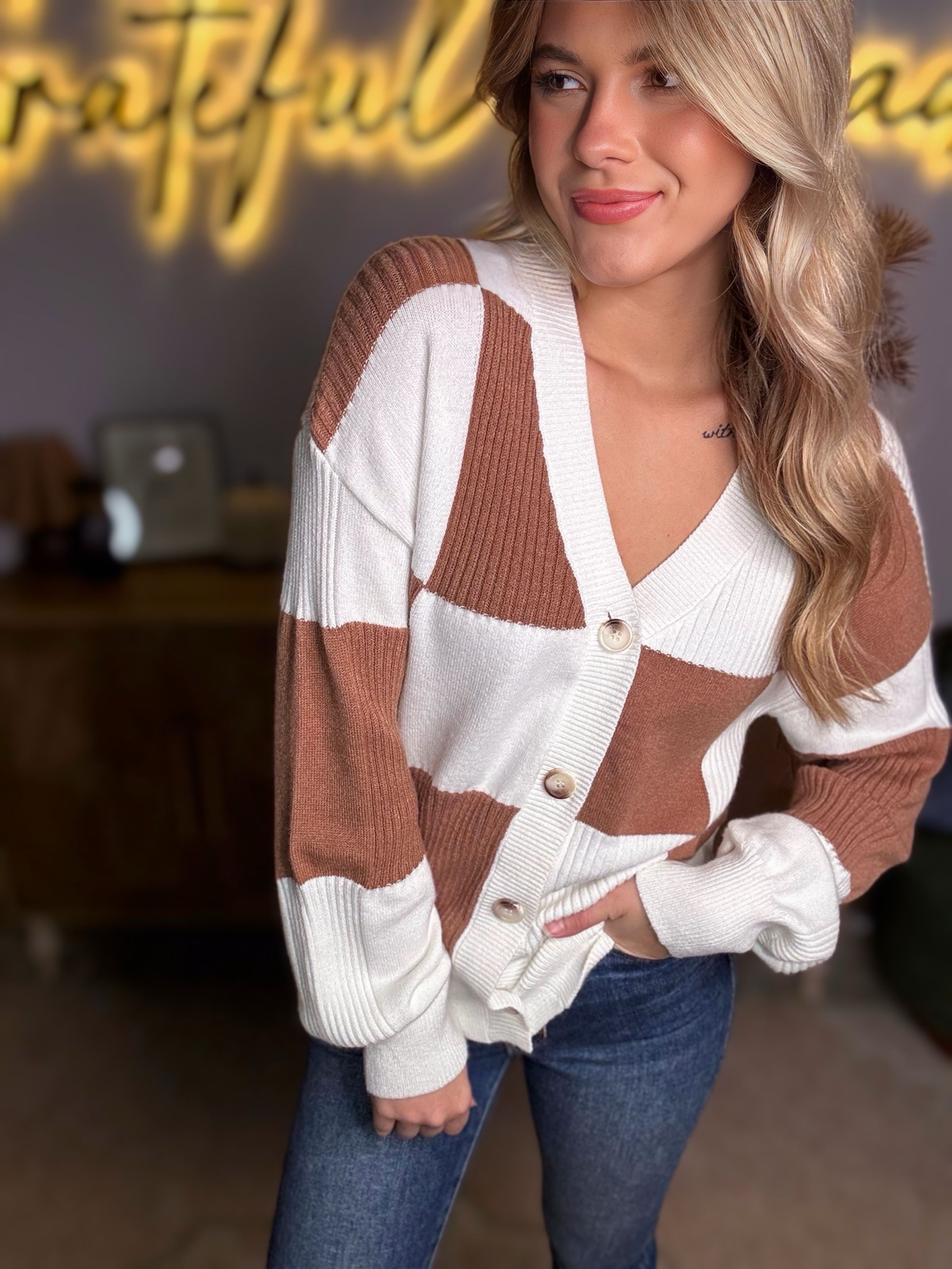 Mocha Checkered Pattern Ribbed Detail Button V-Neck Sweater Cardigan