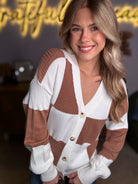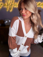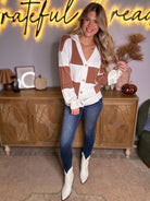 Step into cozy-chic style with this Mocha Checkered Pattern Ribbed Detail Button V-Neck Sweater Cardigan by Grateful Threads. Featuring a bold checkered design in warm khaki and crisp white, this cardigan is the perfect balance of classic and trendy. The ribbed detailing adds texture, while the oversized buttons bring a polished touch. With its relaxed fit and soft knit fabric, it’s ideal for layering over tanks, tees, or even dresses. Whether you’re headed to brunch, lounging at home, or running errands in style, this cardigan has you covered.