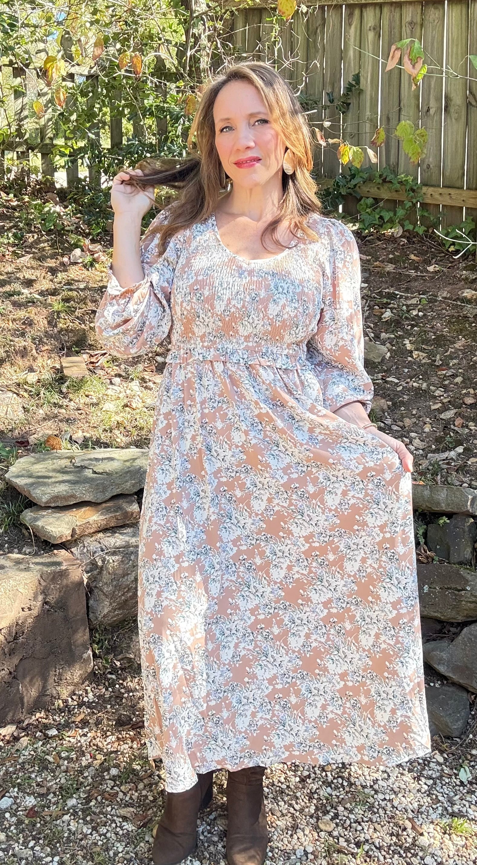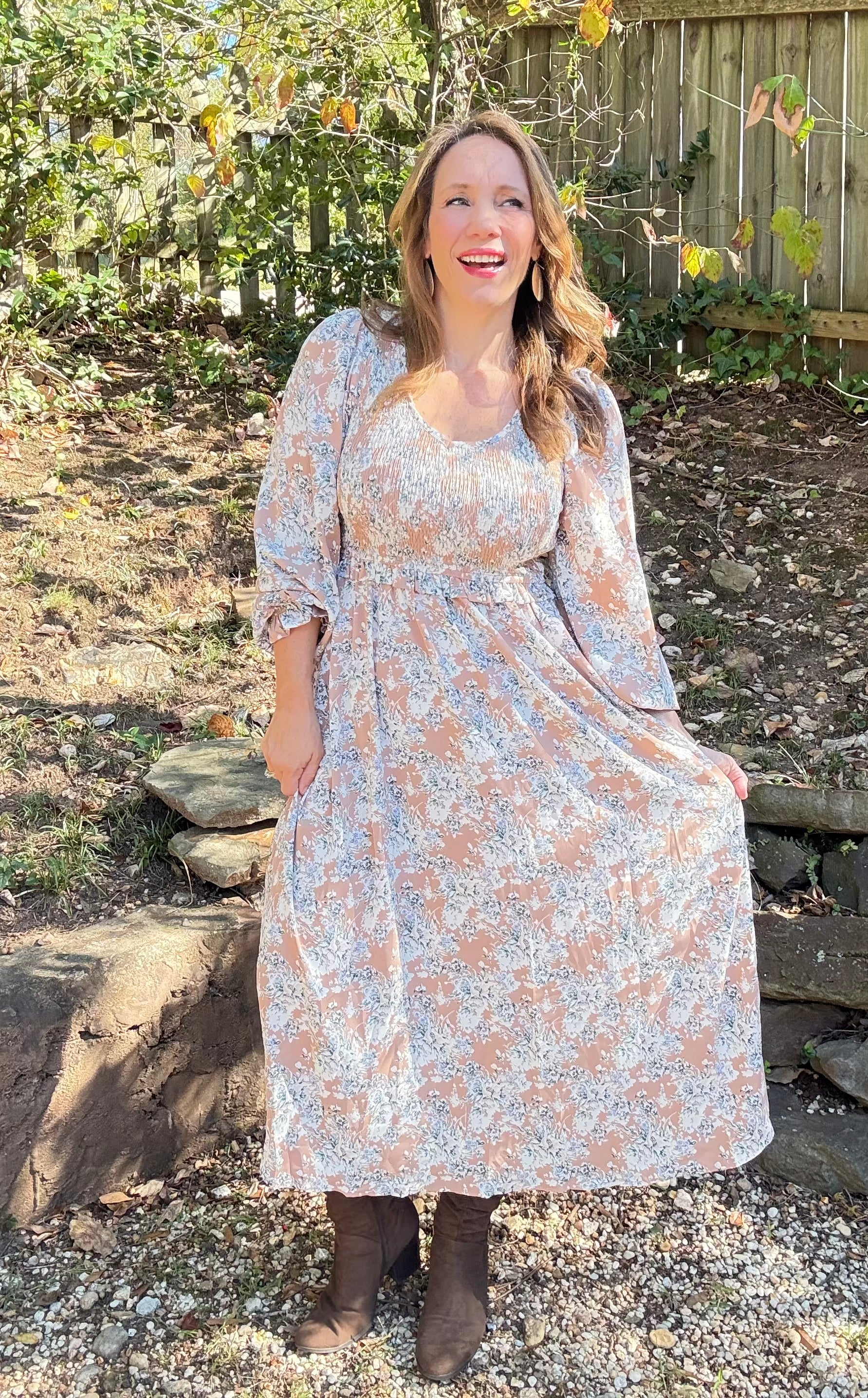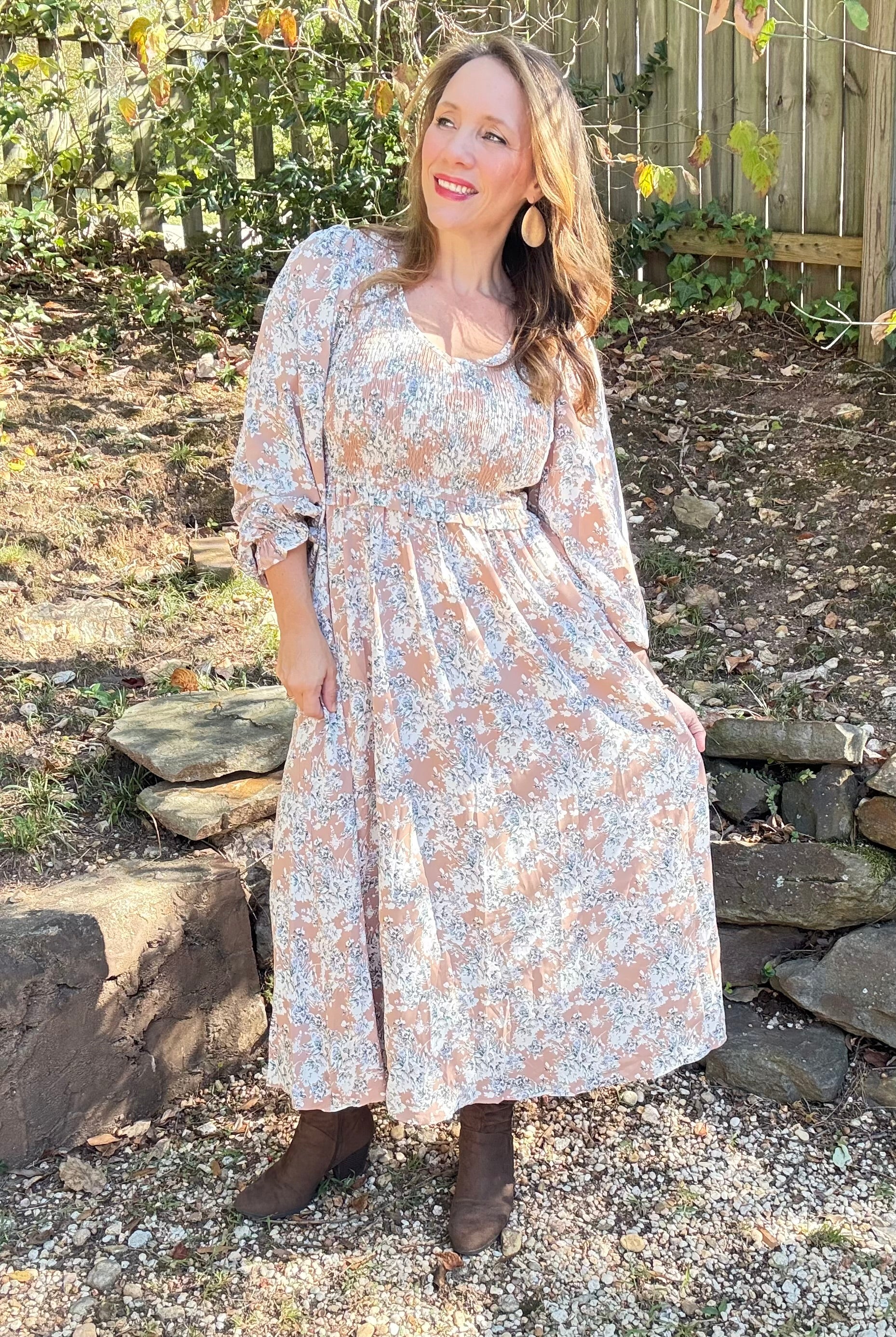 Khaki Maple Grove Floral Smocked Puff Sleeve Long Dress