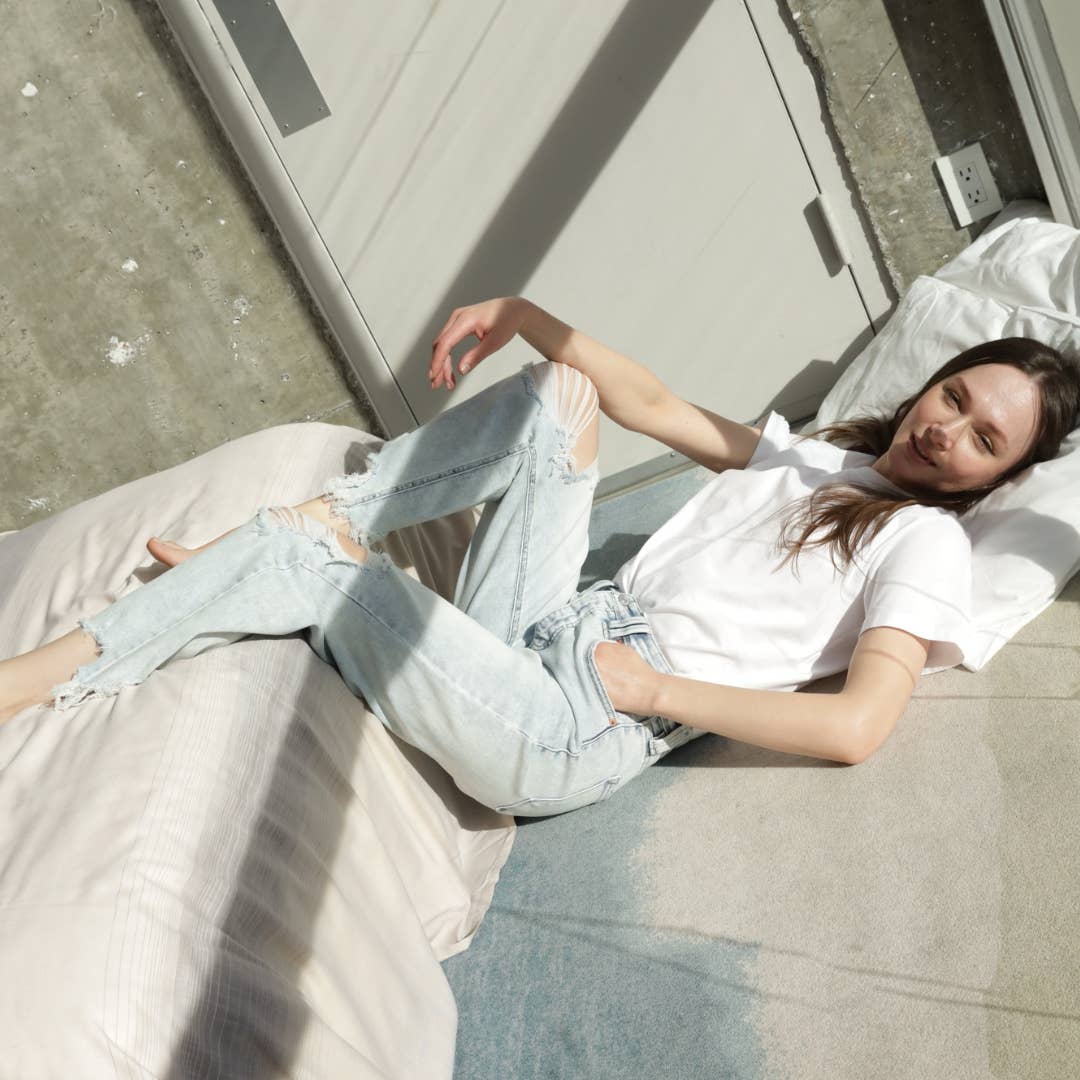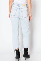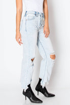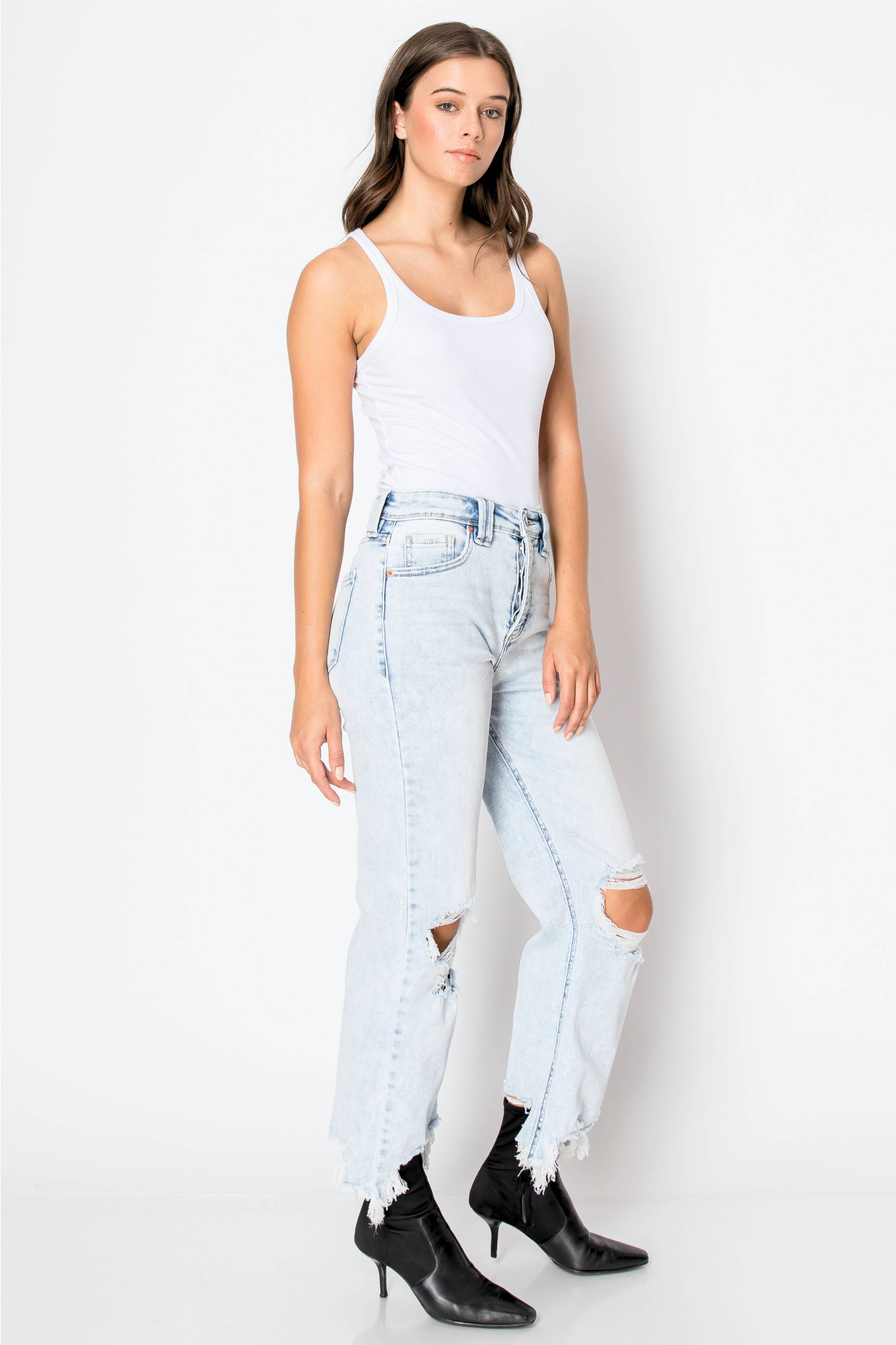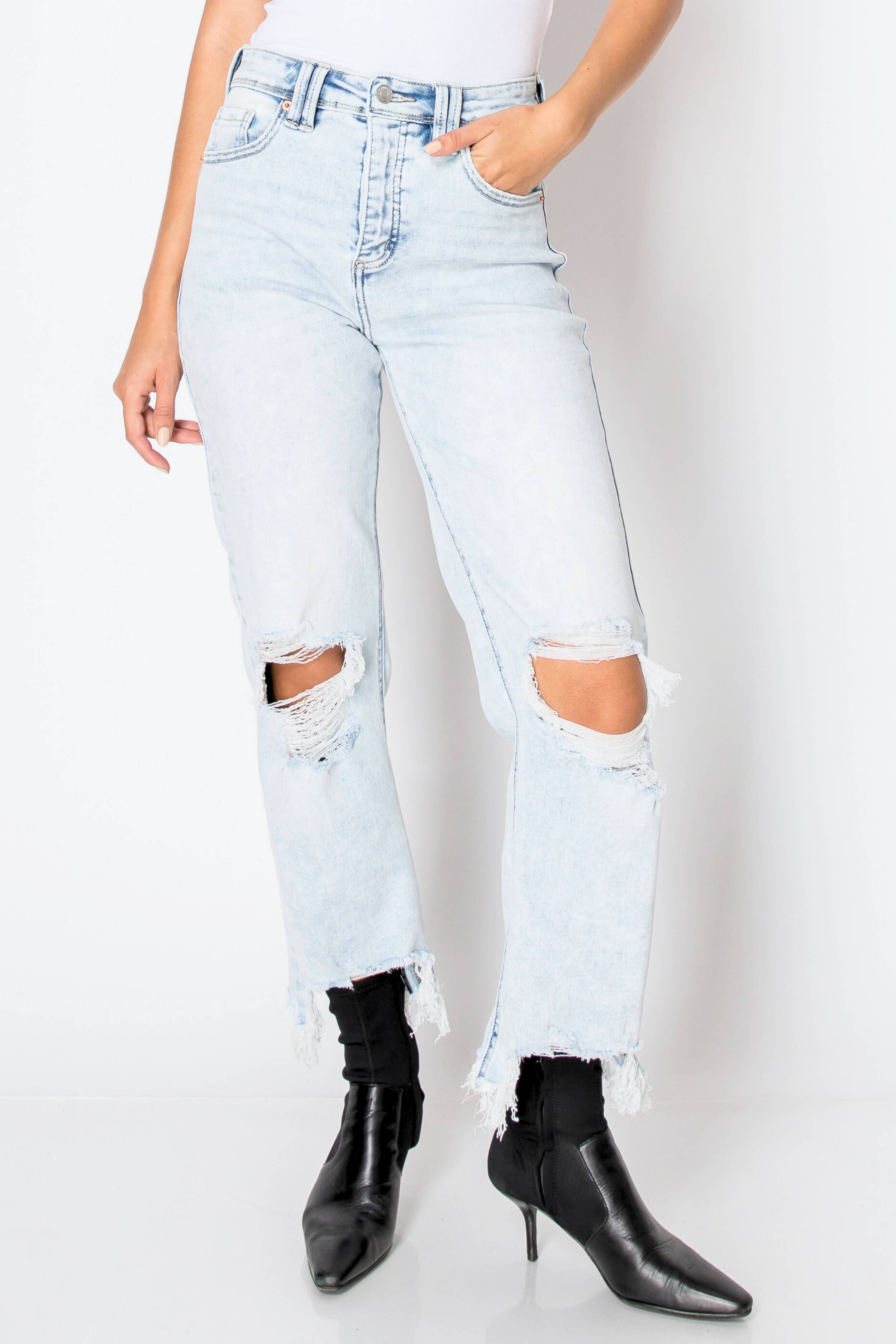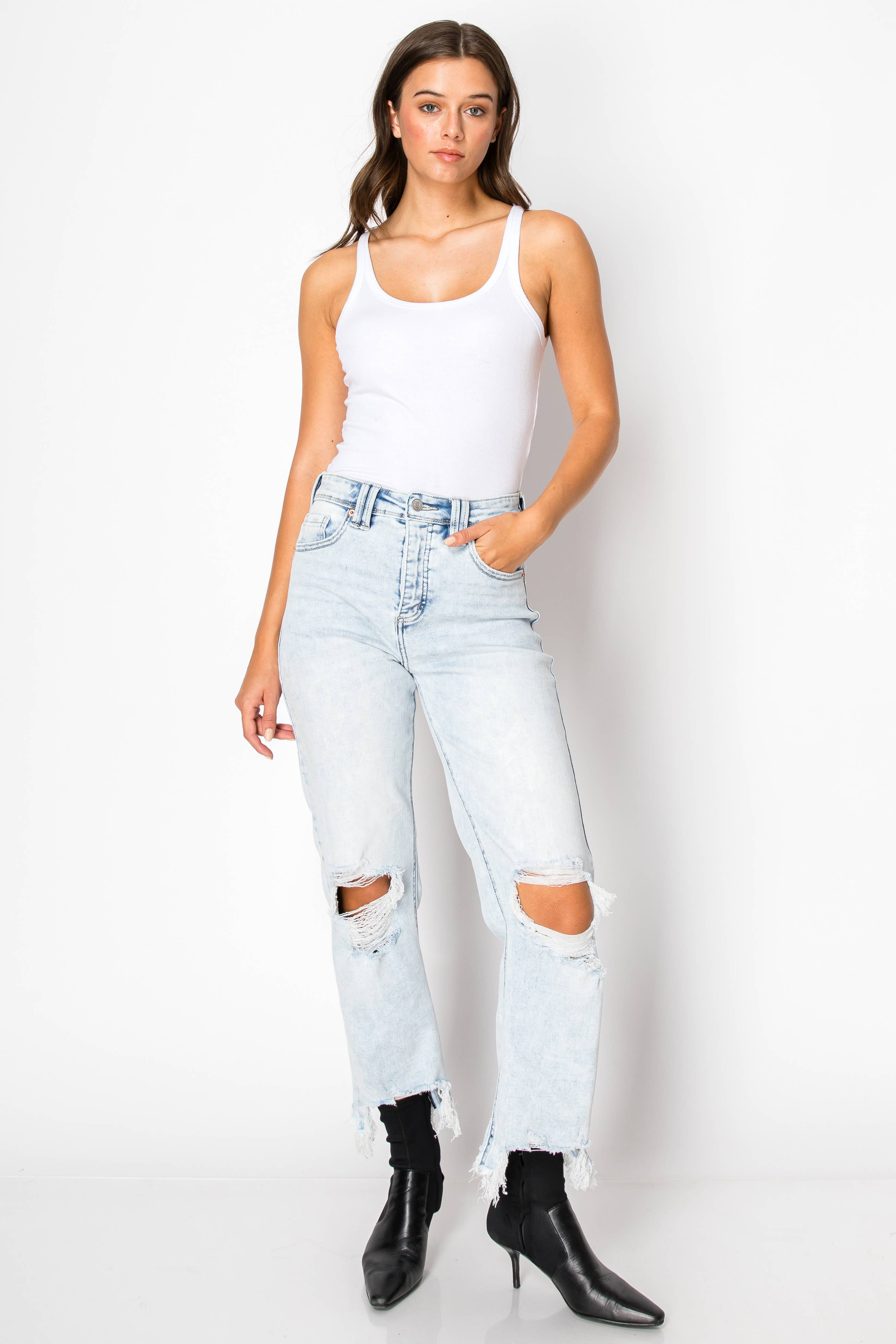 Crafted from super stretch denim, these jeans move with you for all-day wear, making them perfect for busy days, casual outings, and elevated everyday looks. The high-rise waistband with double belt loops enhances waist definition, while the hidden button fly keeps the front sleek and streamlined. A trendy light acid wash paired with knee distress detailing adds just the right amount of vintage edge.
