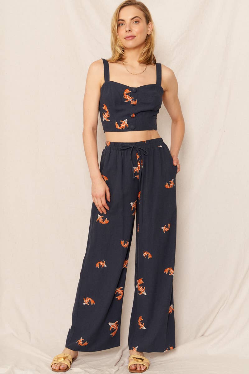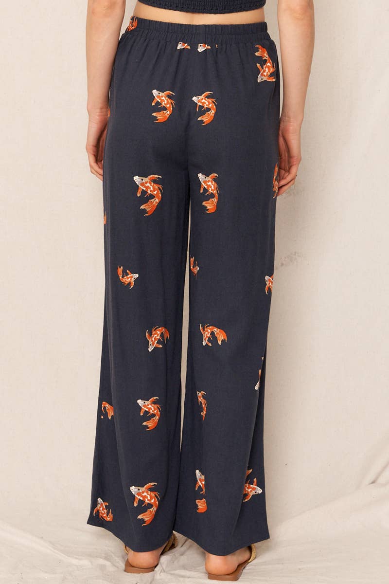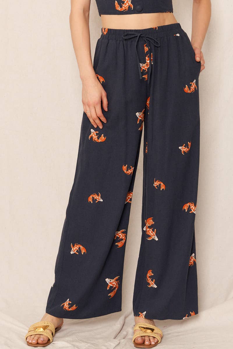 En Crème Koi Fish Print Wide Leg Pants – Navy/Orange
