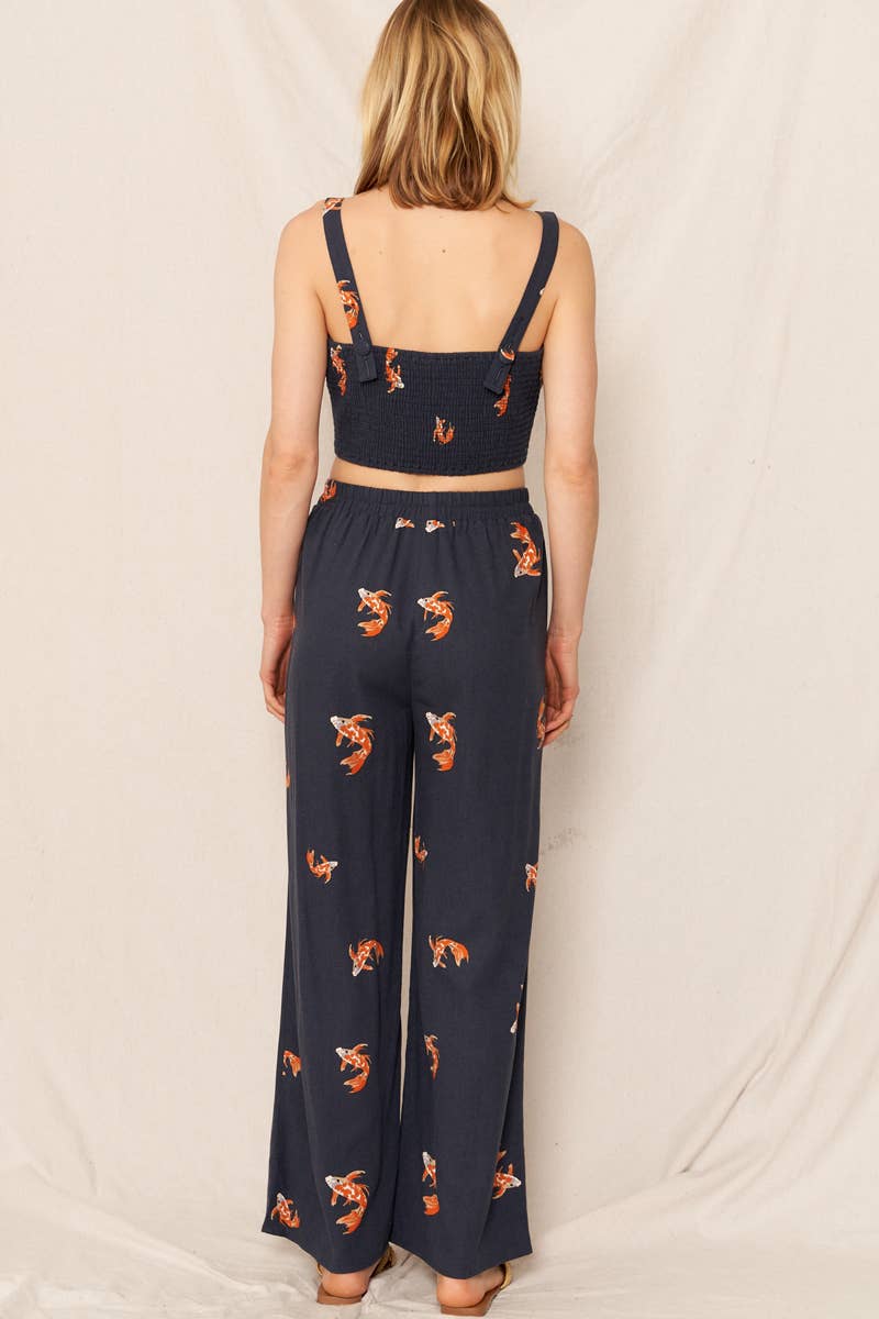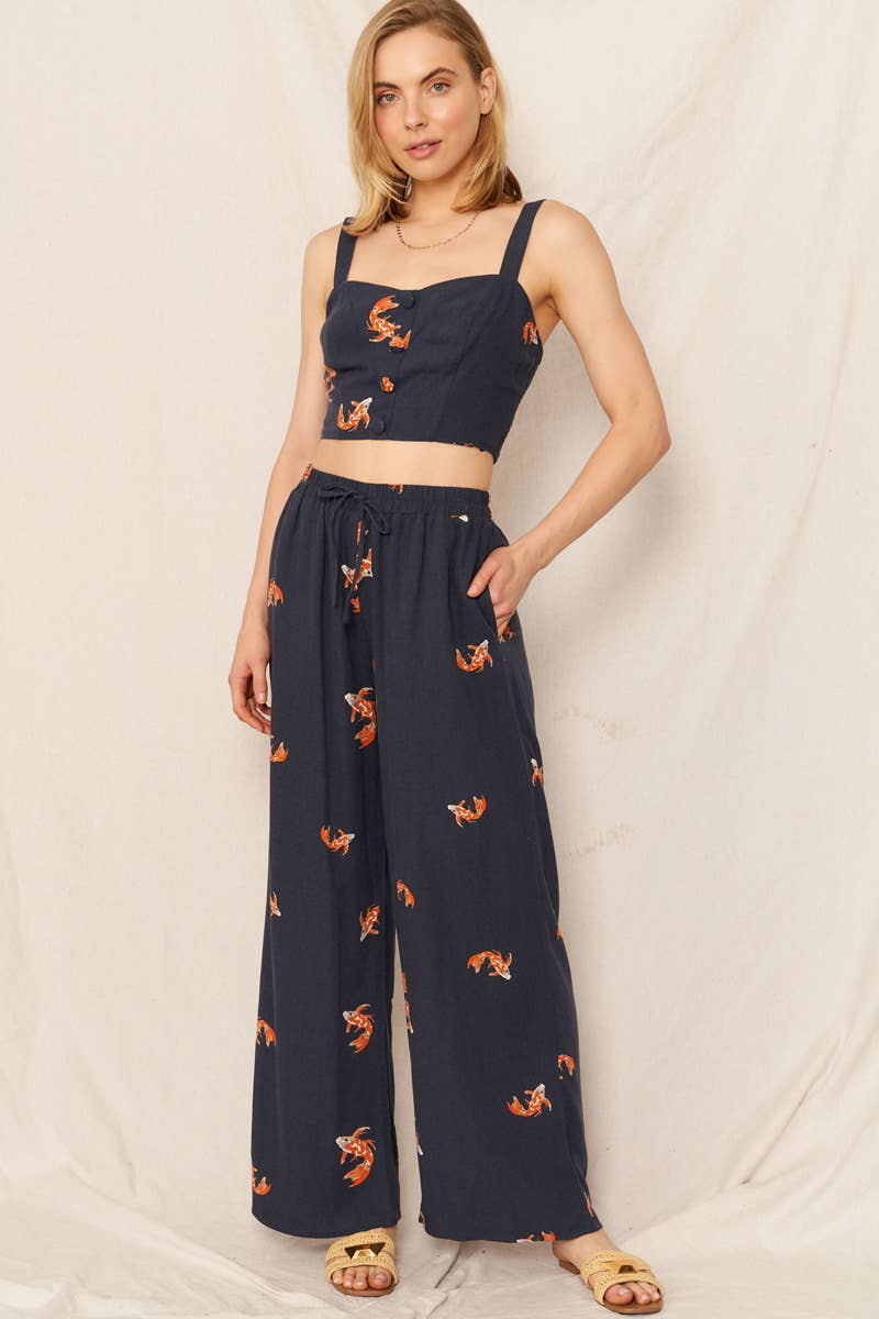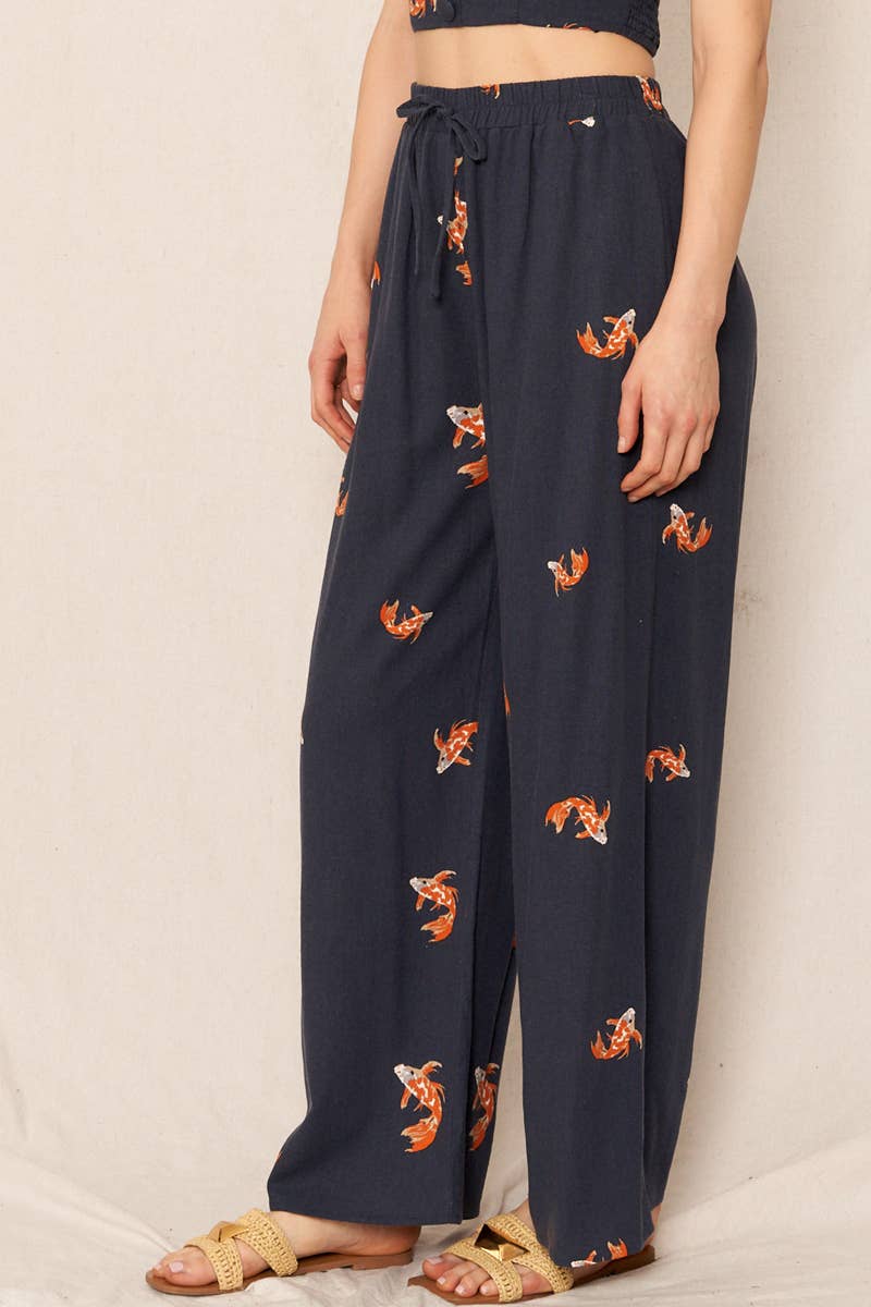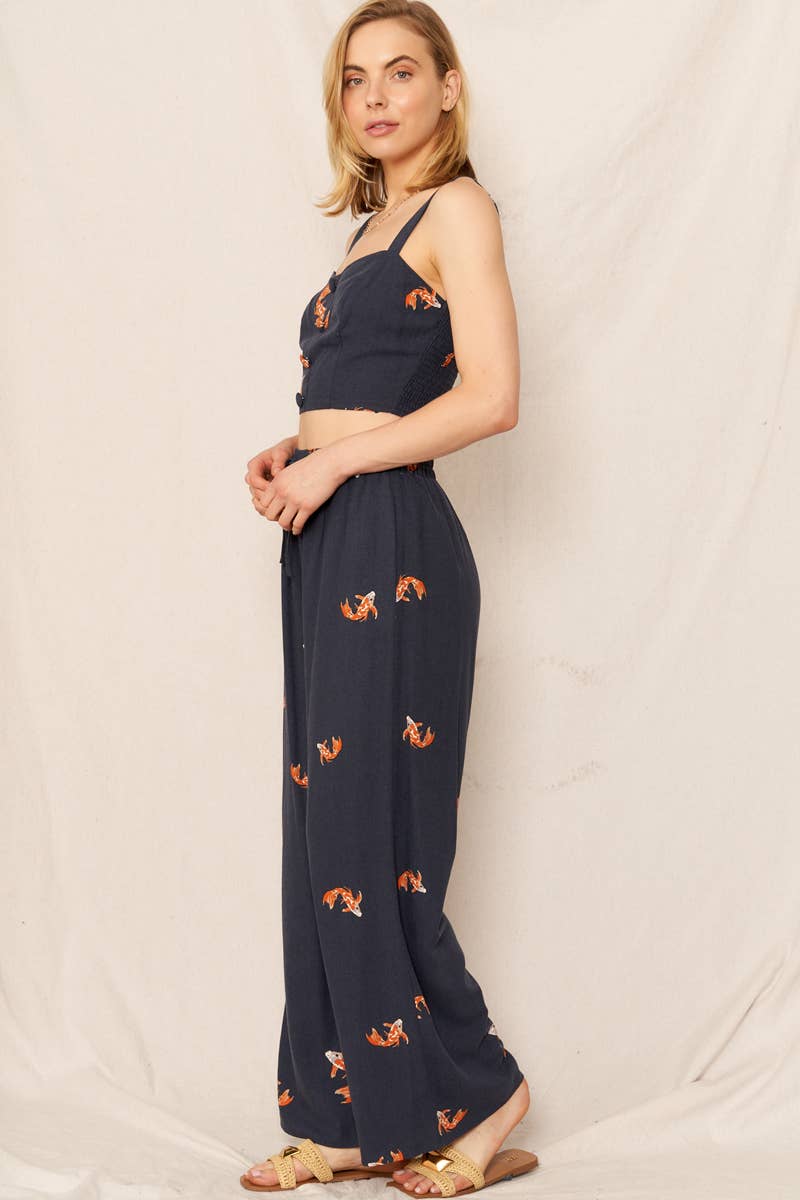En Crème Koi Fish Print Wide Leg Pants – Navy/Orange
