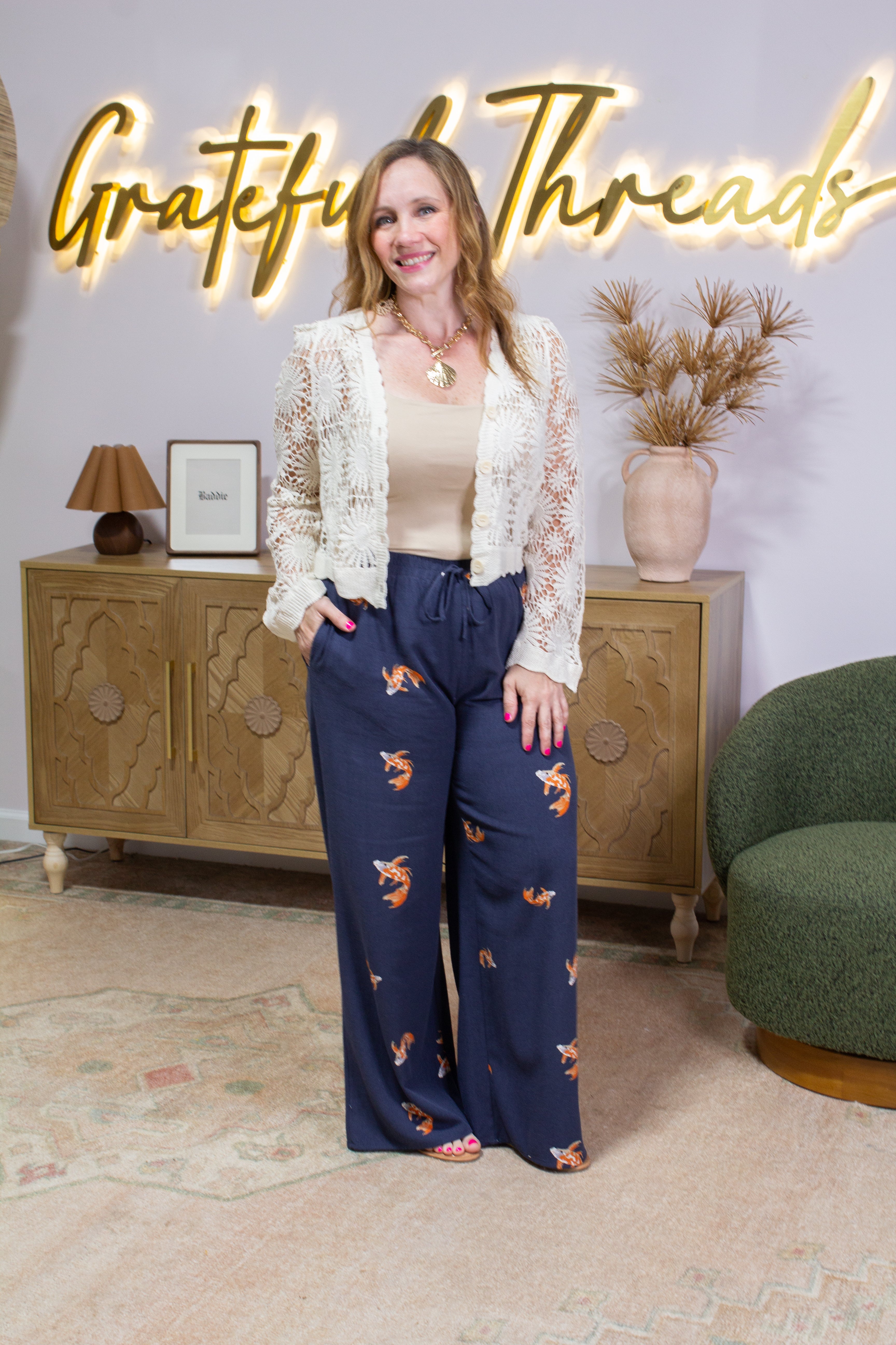 Make a splash in these effortlessly cool wide leg pants from En Crème, featuring a charming koi fish print in bold orange tones against a deep navy backdrop. Designed with a relaxed silhouette and breezy fabric, these pants offer both comfort and standout style. The elastic waistband with a drawstring tie ensures a perfect fit, while side pockets add a practical touch. Ideal for lounging, brunching, or strolling seaside in laid-back luxury.
