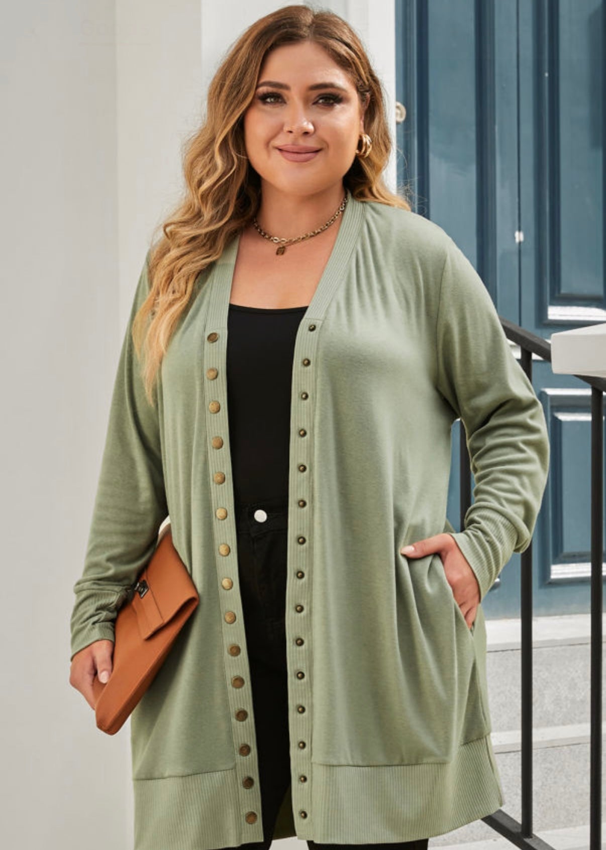 Green Plus Size Snap Buttons Front Knit Cardigan