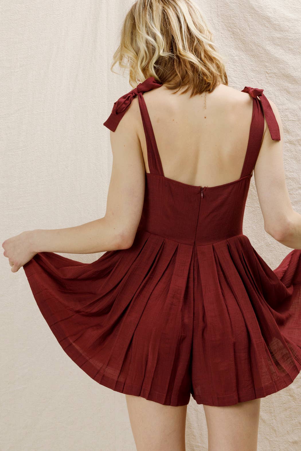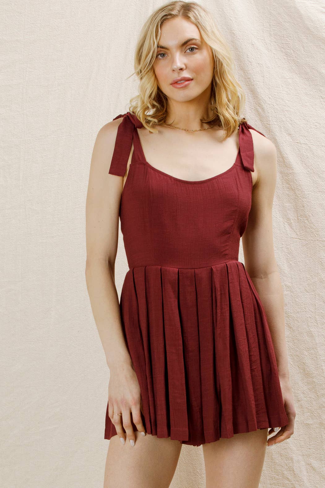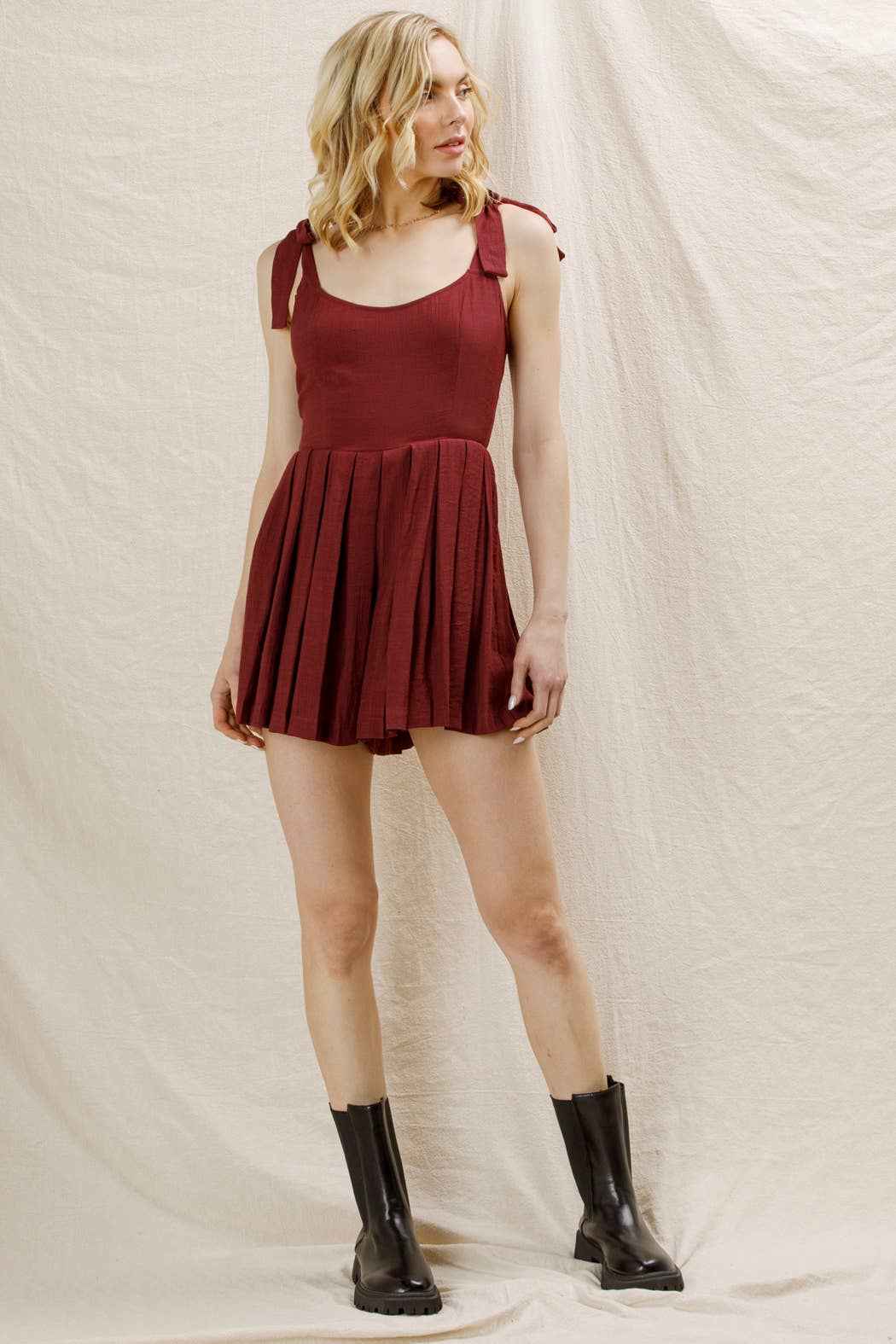 Sip into something effortlessly chic with this deep wine romper by En Crème. Crafted from a breezy blend of 65% viscose and 35% polyester, this flattering silhouette features a fitted bodice with dainty shoulder ties and a pleated skirt overlay for playful movement. The rich hue and feminine details give off flirty-yet-sophisticated energy that’s perfect for date nights, weekend brunch, or winery wanderings.