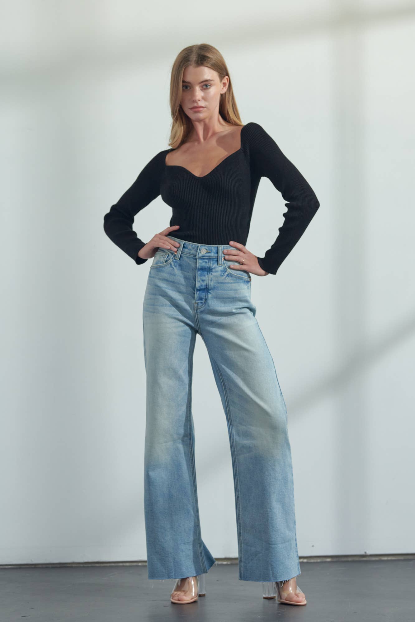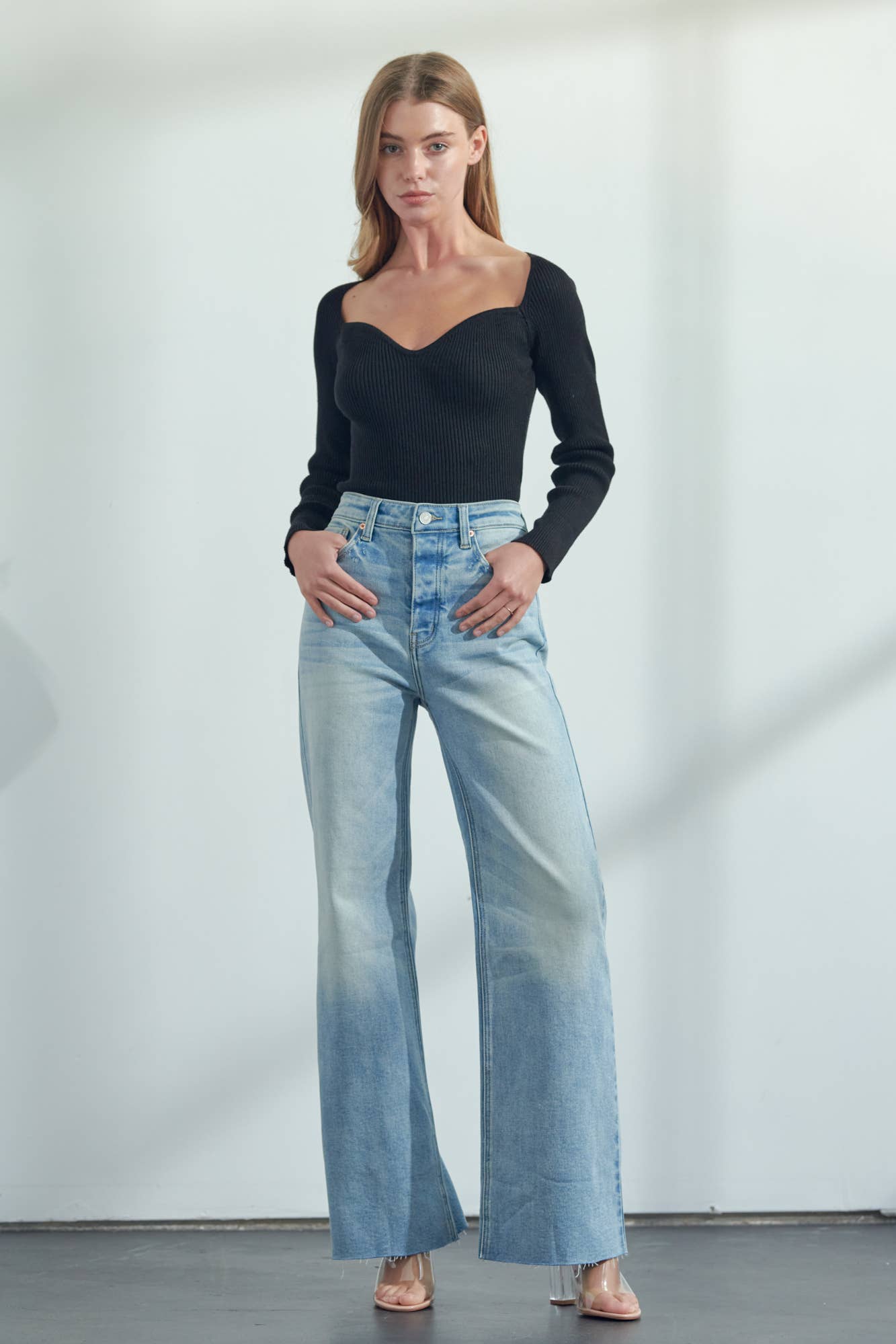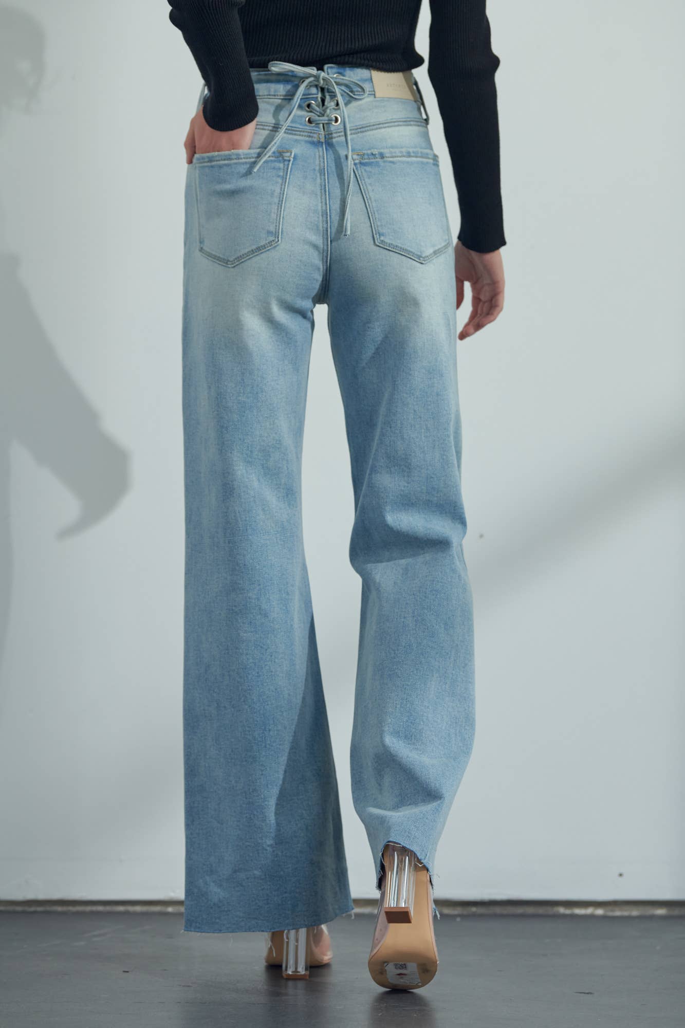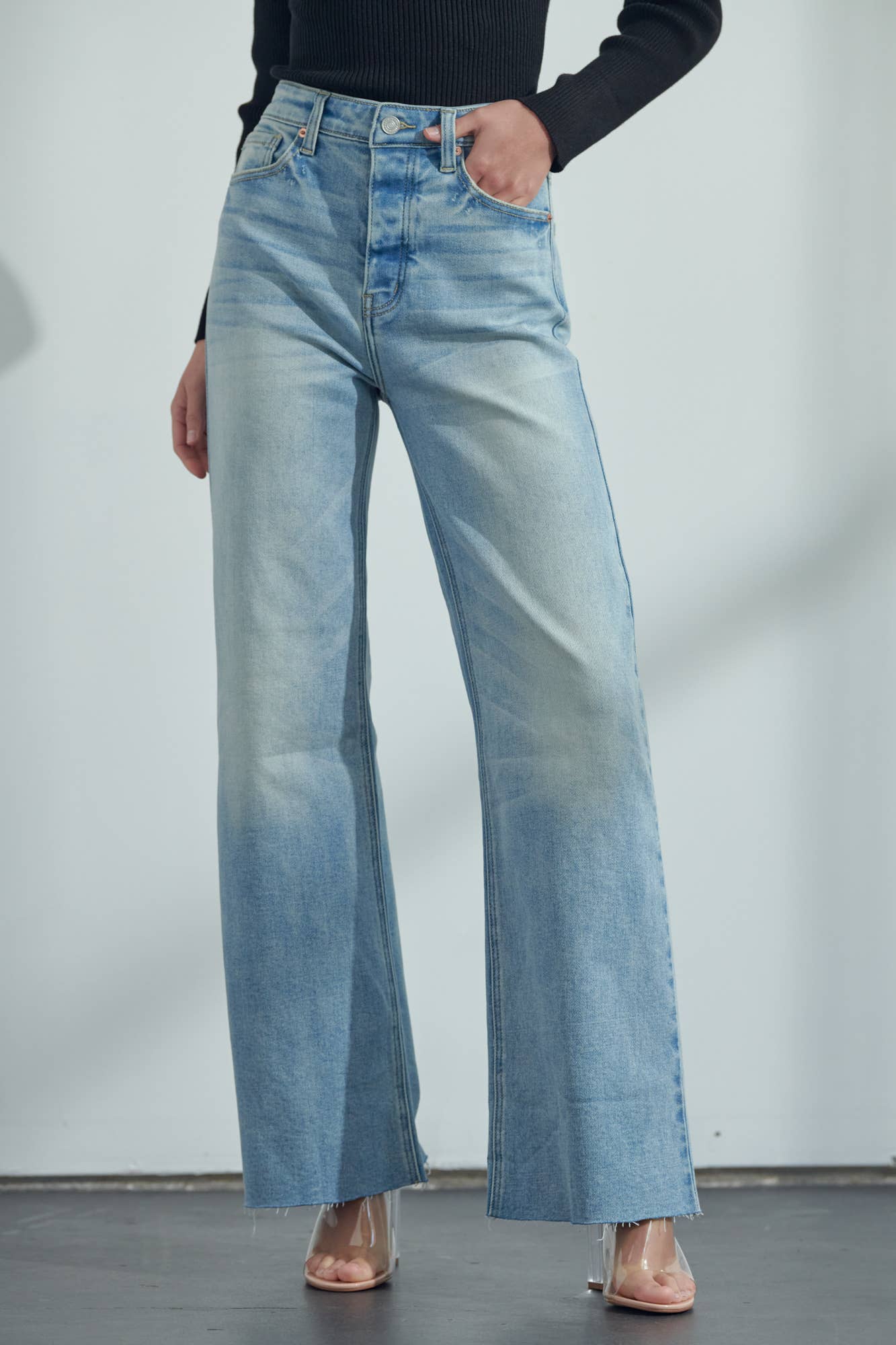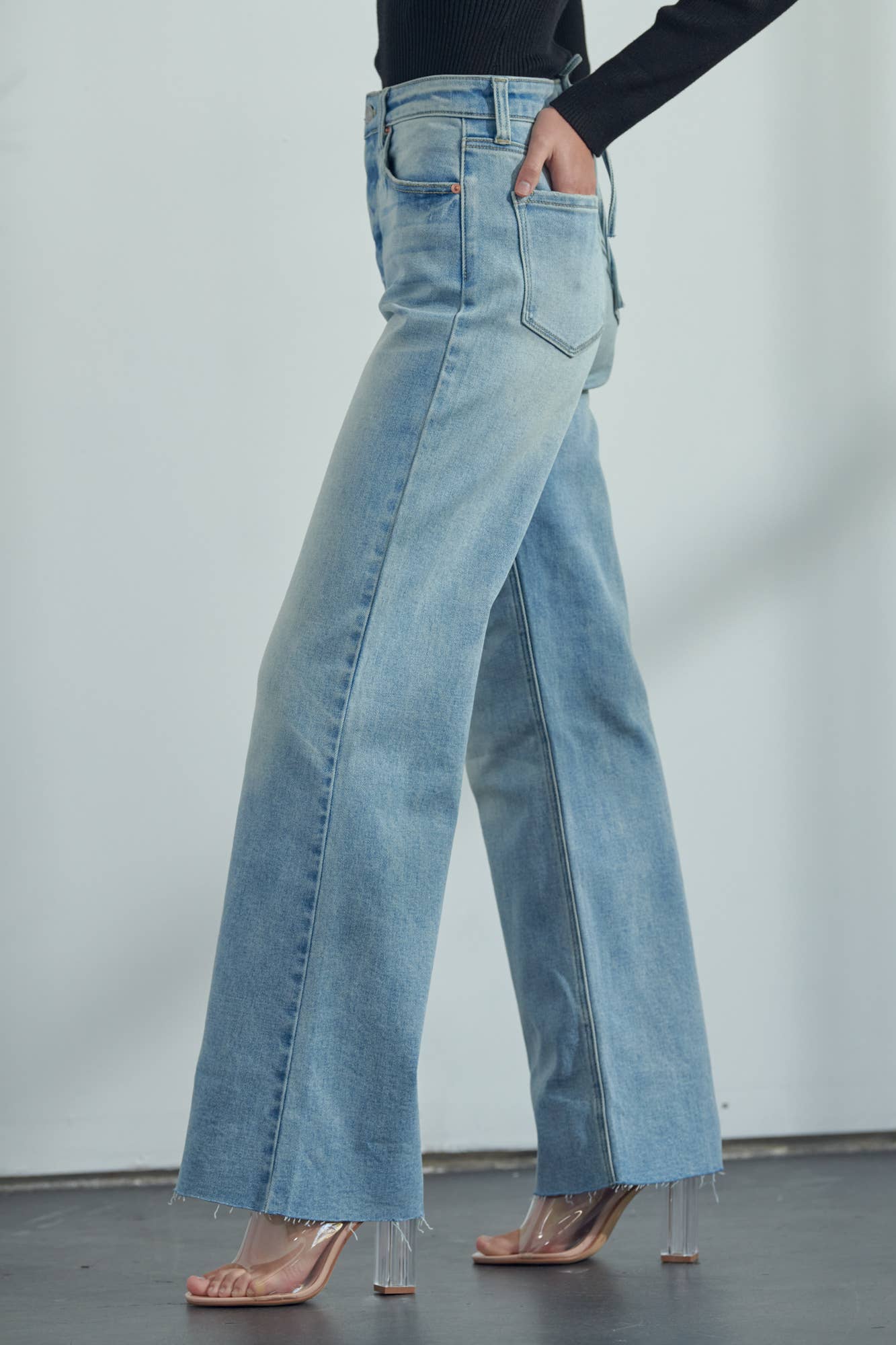 COMFORT STRETCH DENIM EXPOSED BUTTON DETAIL ULTRA HIGH WAISTED WIDE HEM WITH GRINDING DETAIL LIGHT STONE WASH FRONT RISE : 11 1/2" INSEAM : 32" LEG OPENING : 21" 93% COTTON 5%POLYESTER 2%SPANDEX