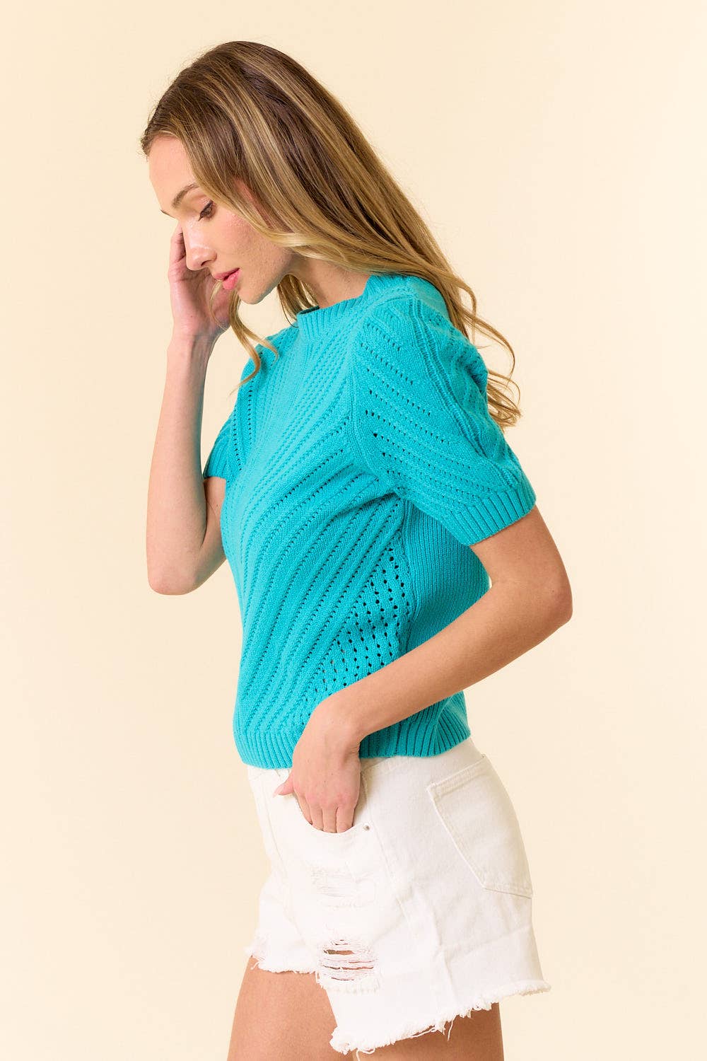 Brighten your wardrobe with the Lovely Melody Gigi Sweater Top — a lightweight, short-sleeve knit that blends comfort with a pop of playful charm. This top features a flattering textured chevron pattern, a classic crew neckline, and a slightly cropped hem for a modern silhouette. The vibrant aqua blue hue brings a refreshing burst of color, perfect for sunny days or layering under your favorite jacket. Pair it with distressed denim shorts for an effortless, carefree look.