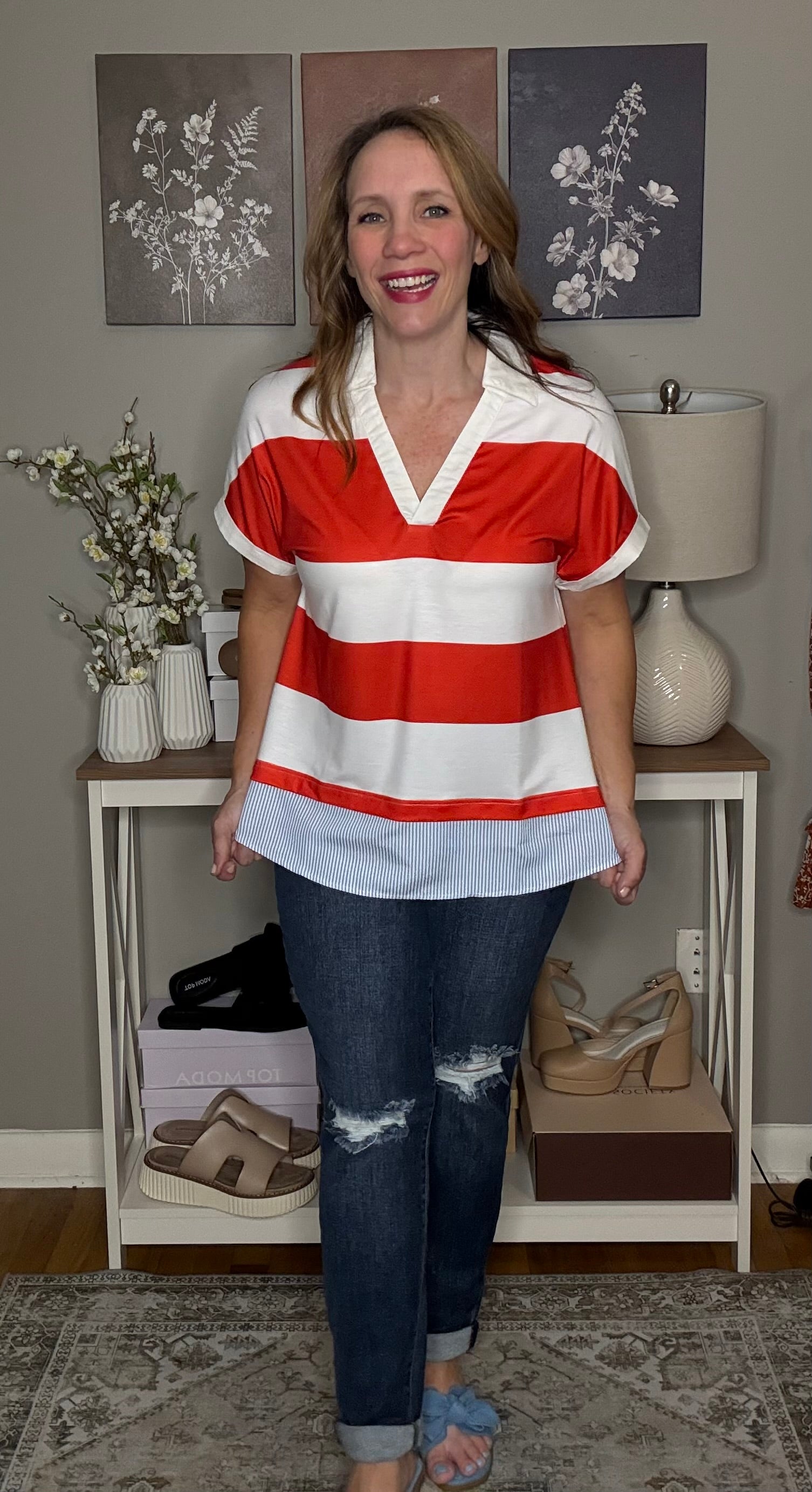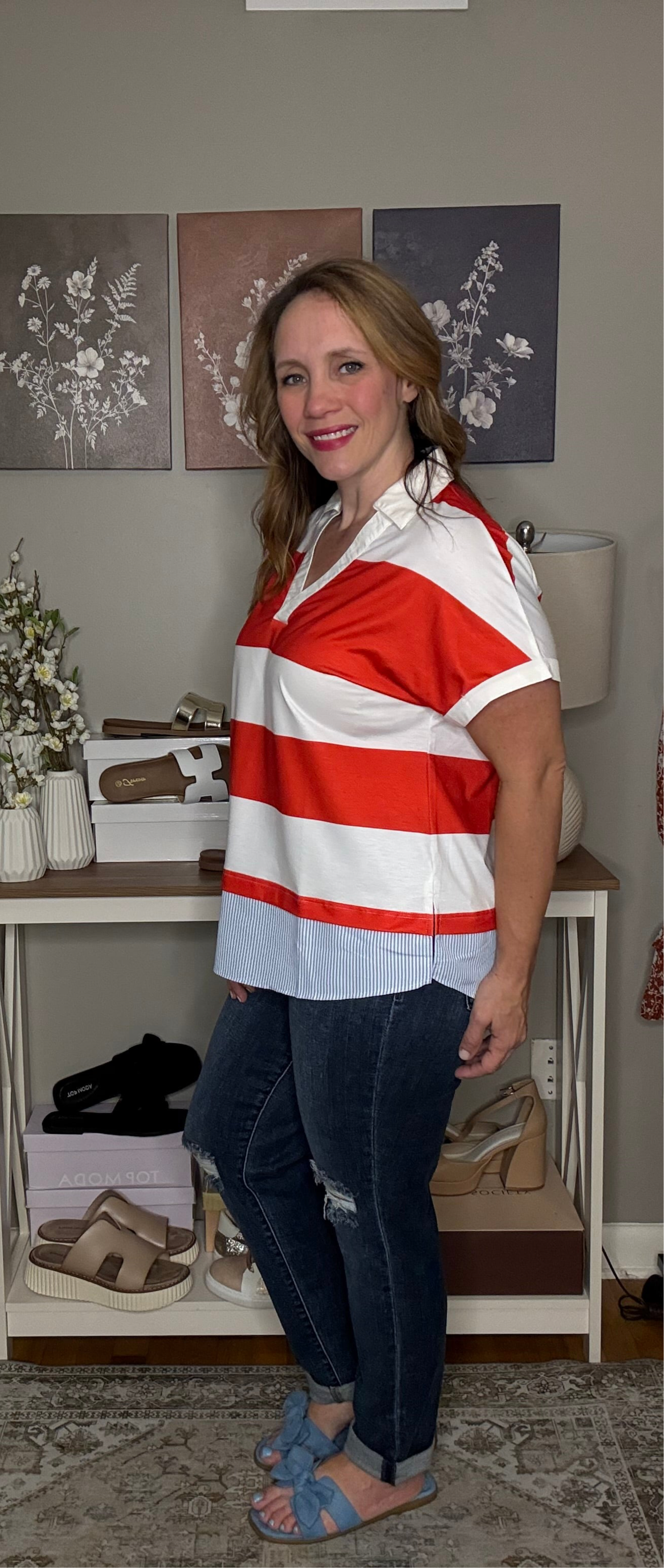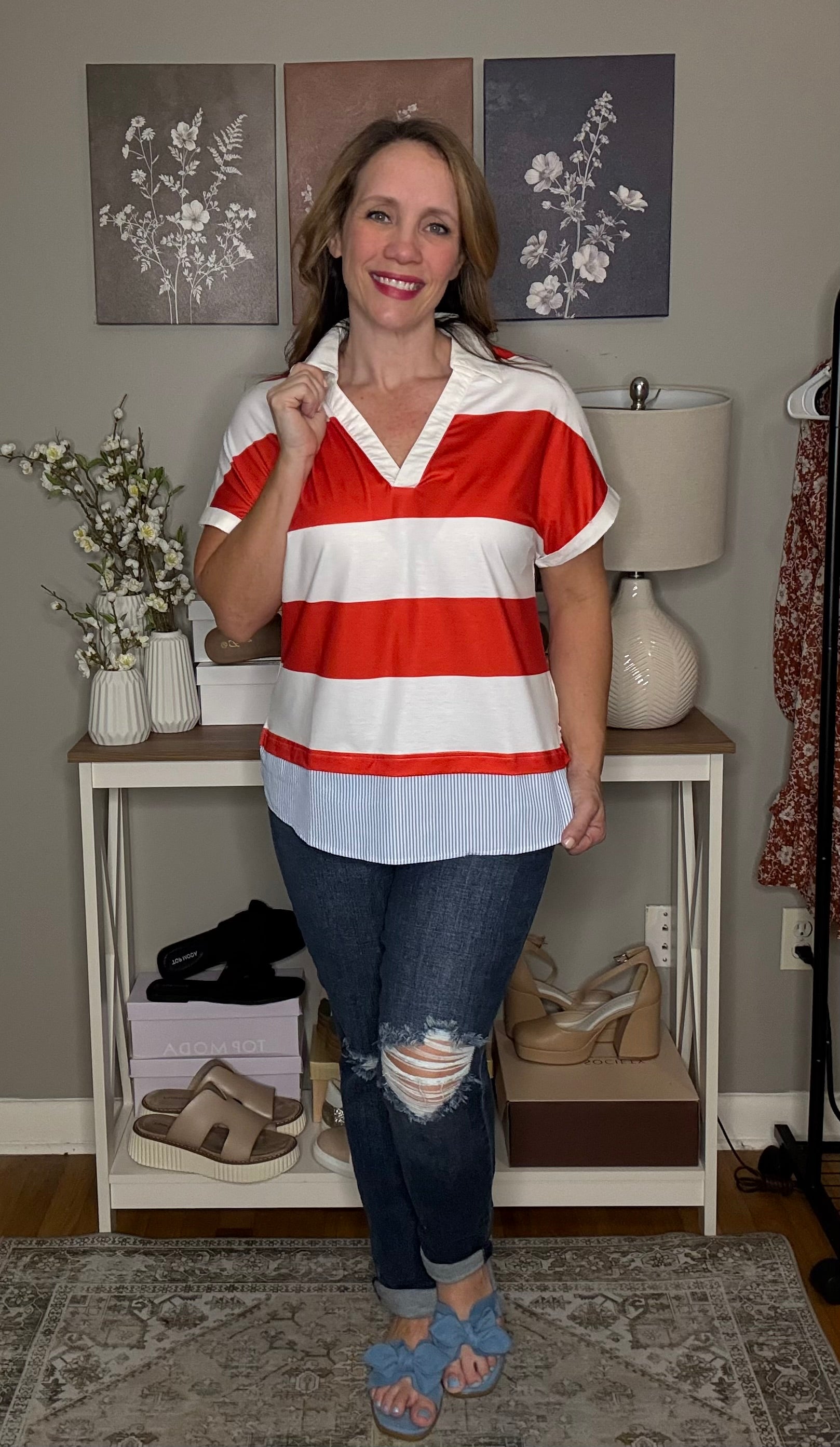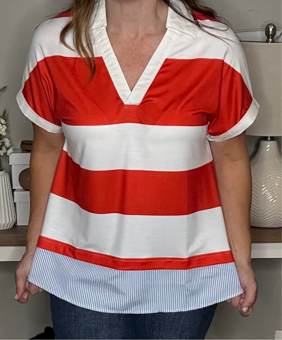 Red Stripe Collar V Neck Cuffed Dolman Short Sleeve Top