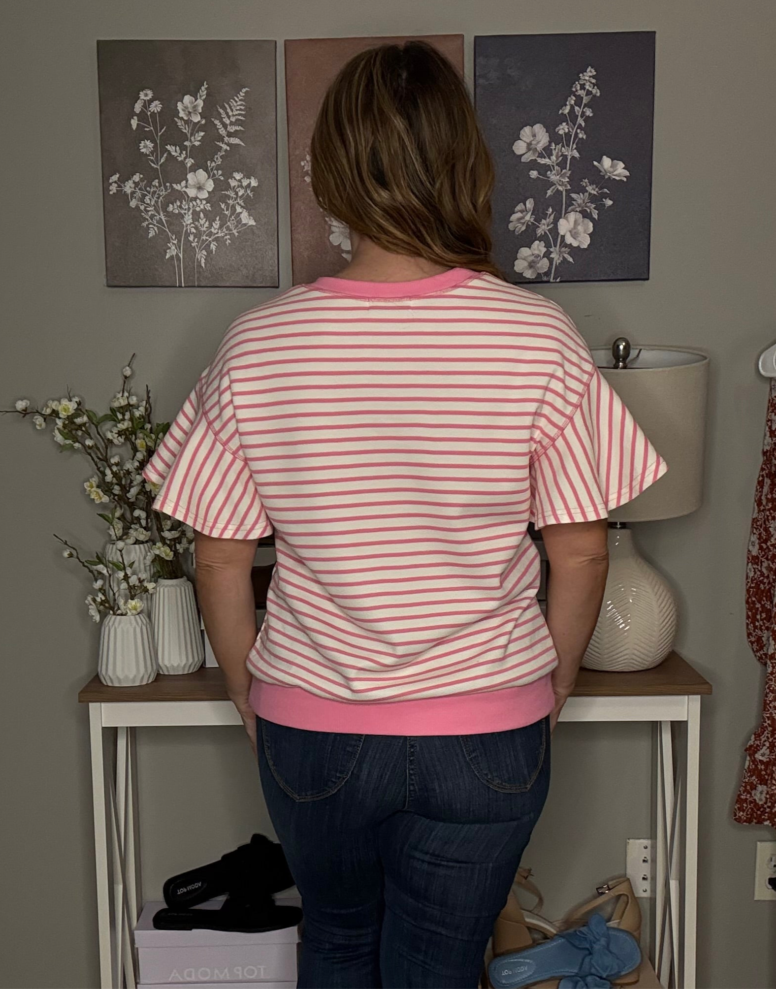 Add a little sparkle to your stars and stripes! The “Stars, Stripes & Sass” Sequin Bow Ruffle Tee by Grateful Threads is the ultimate mix of sweet and sassy. Featuring sachet pink and cream stripes, fluttery ruffle sleeves, and the cutest sequin American flag bows, this top was made for backyard BBQs, firework shows, and all things festive. It’s playful, comfy, and totally ready to party—just like you!