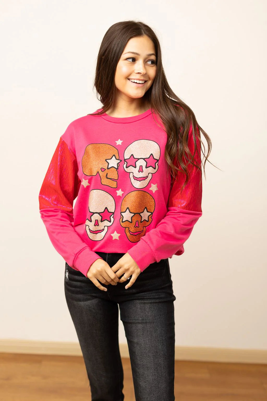 Embrace your bold side with this Shiny Skull Hot Pink Sweatshirt. Featuring a striking skull design, it's perfect for the modest yet fun-loving woman. The crew neck adds a classic touch, while the semi-stretch fabric ensures a comfortable fit for an active lifestyle.