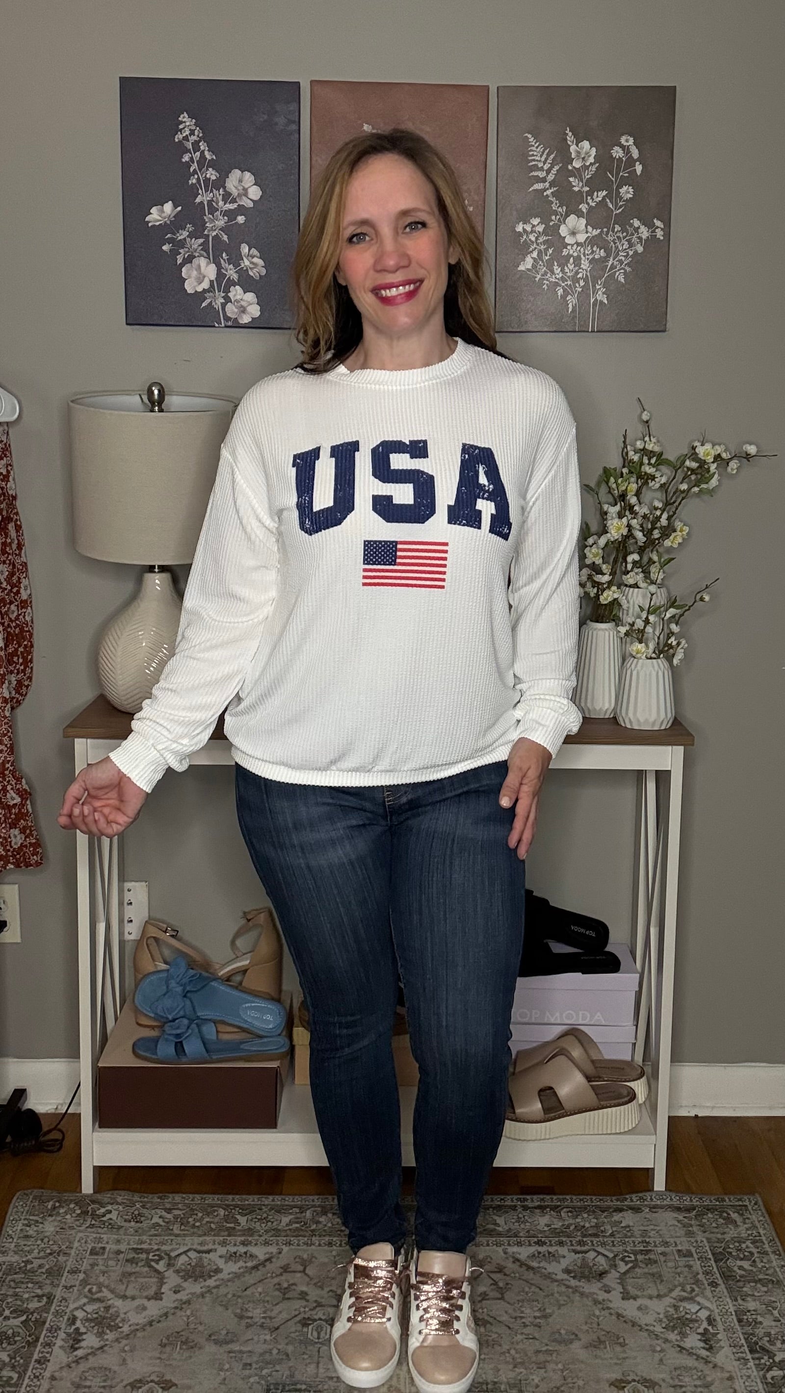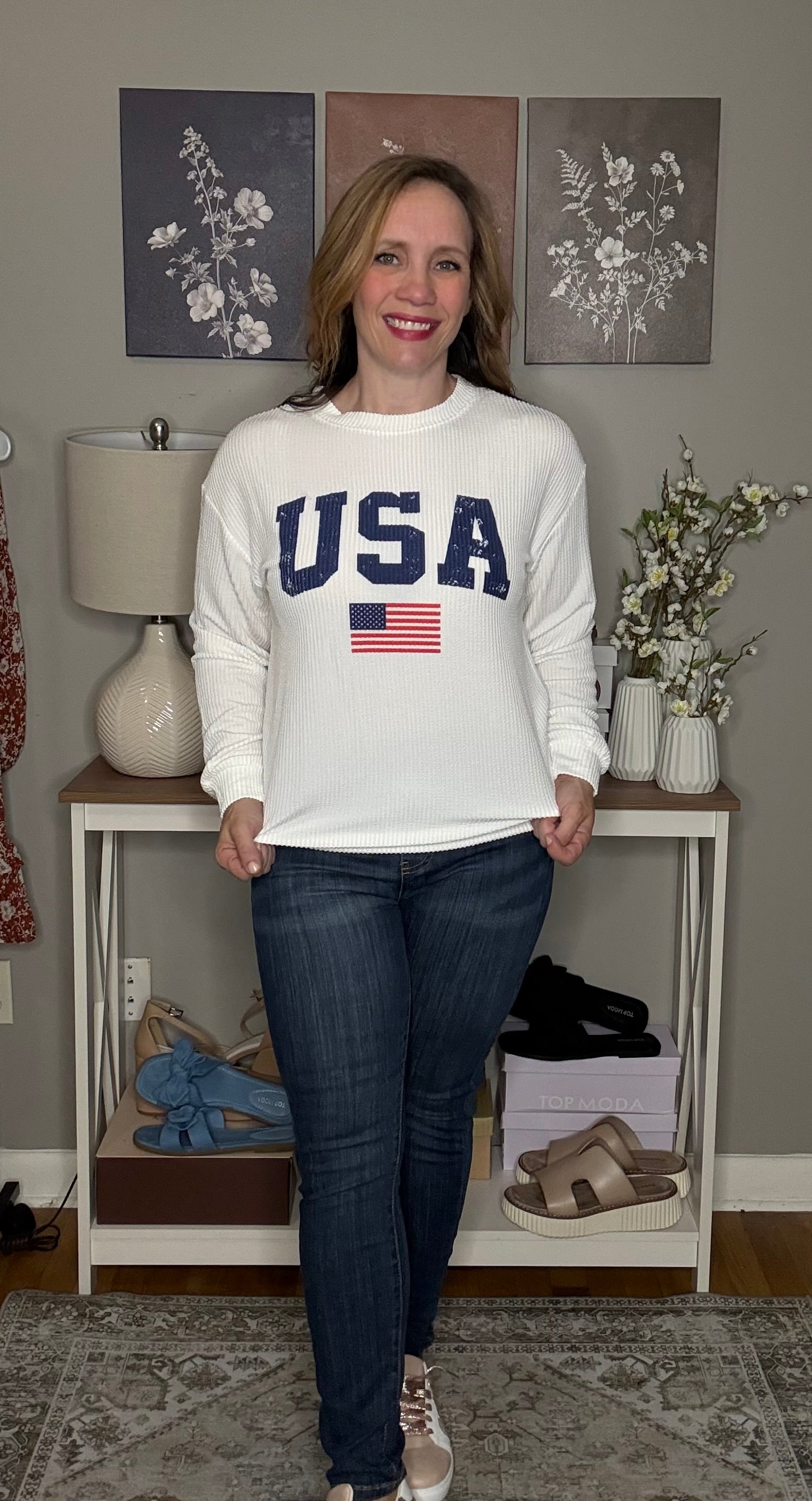 Show off your stars and stripes in style with this cozy-chic corded sweatshirt! Featuring a textured white backdrop with bold “USA” lettering and a sparkling sequin American flag, this top is all about patriotic pride with a fashionable twist. The relaxed fit and soft ribbed texture make it perfect for summer nights, backyard BBQs, or Fourth of July fireworks.