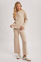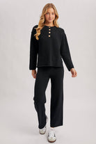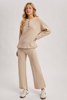 The button-front henley neckline adds a timeless touch while the relaxed fit allows for easy layering or solo wear. The wide-leg pants offer a comfortable elastic waist and an easy drape that moves with you—perfect for lounging, travel days, casual errands, or styled up with sneakers or boots for an effortlessly chic look.