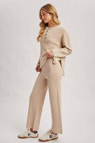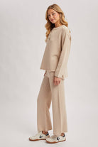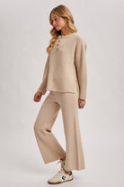 Meet your new go-to for effortless comfort and elevated everyday style—the Soft Reset Textured Knit Lounge Set. This two-piece set features a cozy textured knit long sleeve henley top paired with relaxed wide-leg knit pants, creating the perfect balance of laid-back luxury and polished ease. Designed with a soft neutral tone and subtle waffle-style texture, this matching set is as flattering as it is comfortable.