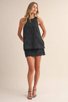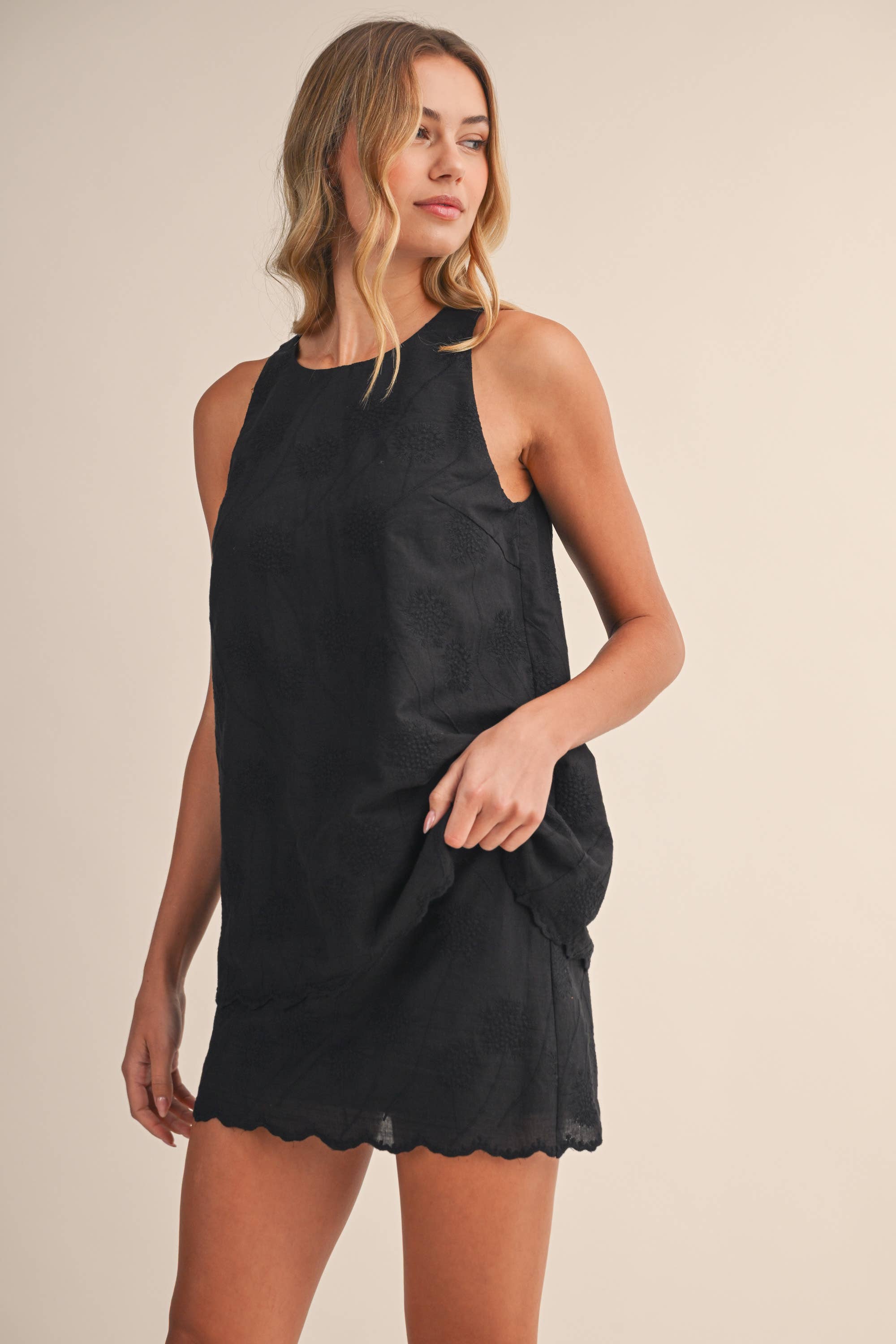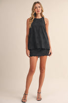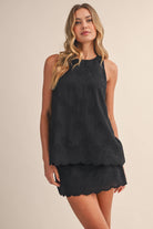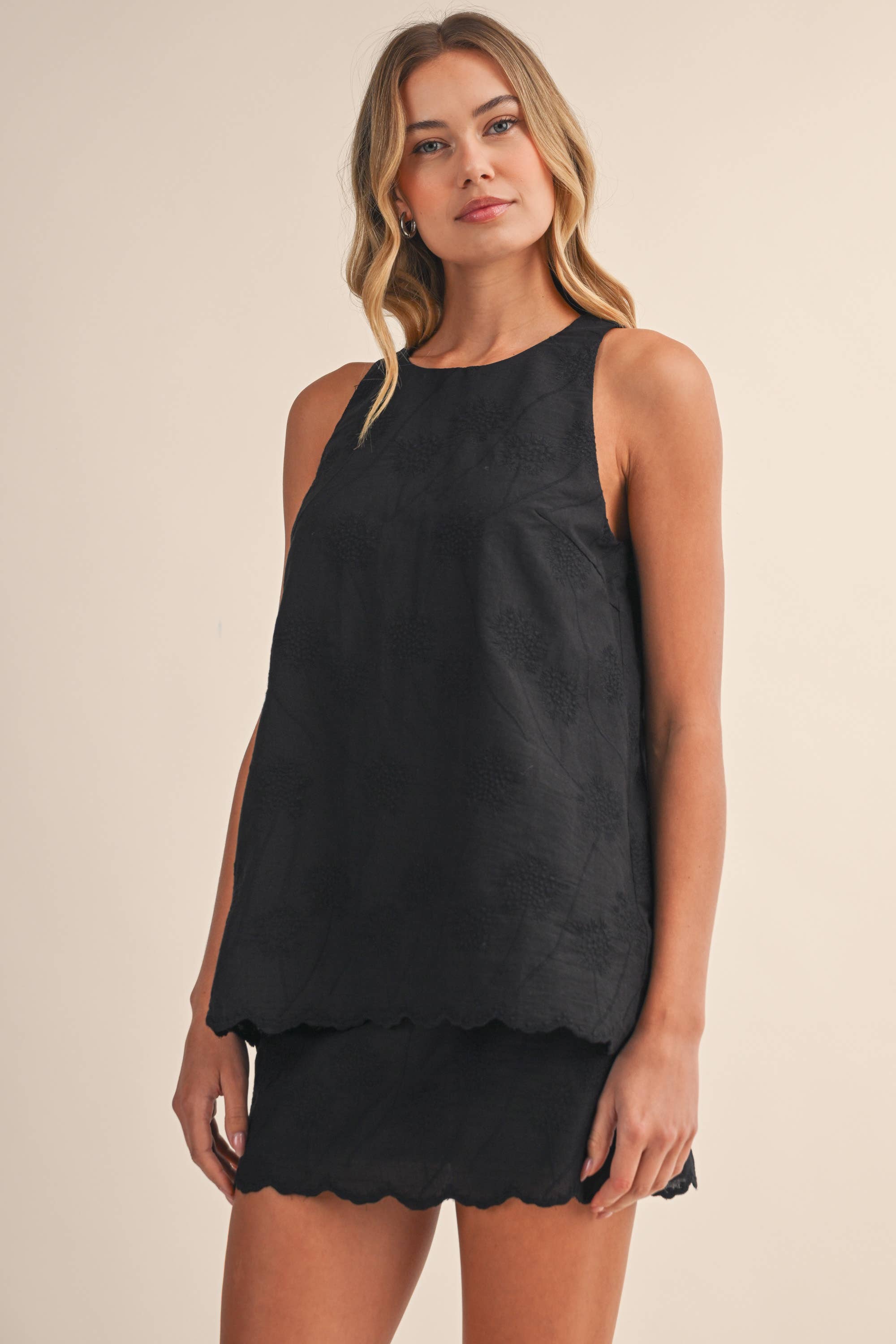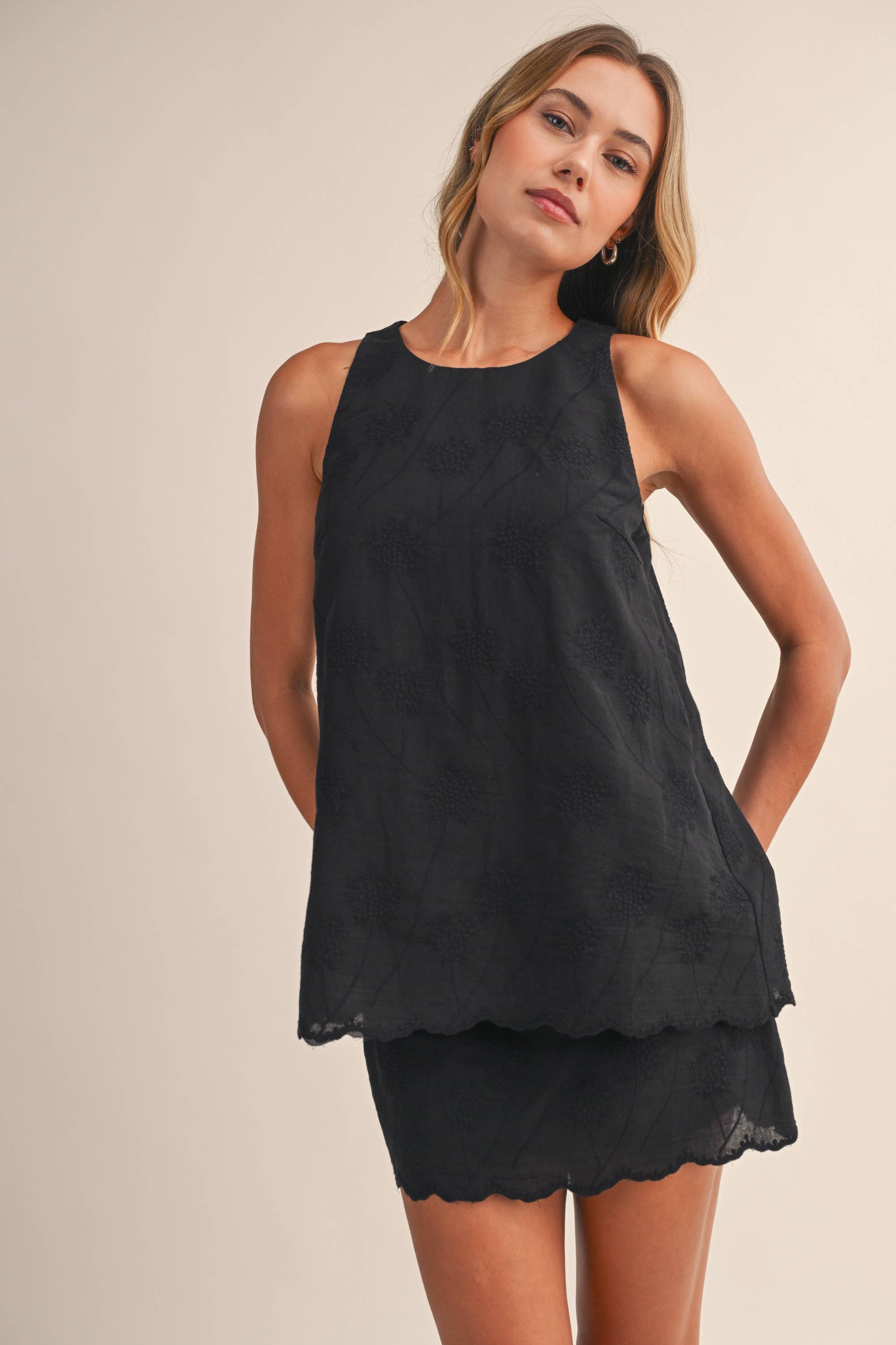 Elevated in the details — The Signature Stitch Set by Klesis is the perfect blend of effortless and refined. This lightweight two-piece features a sleeveless, high-neck embroidered top paired with a matching mini skirt, both finished with a delicate scalloped hem for a soft, feminine silhouette. The intricate tonal embroidery adds just the right amount of texture, giving this set a polished feel without sacrificing comfort.