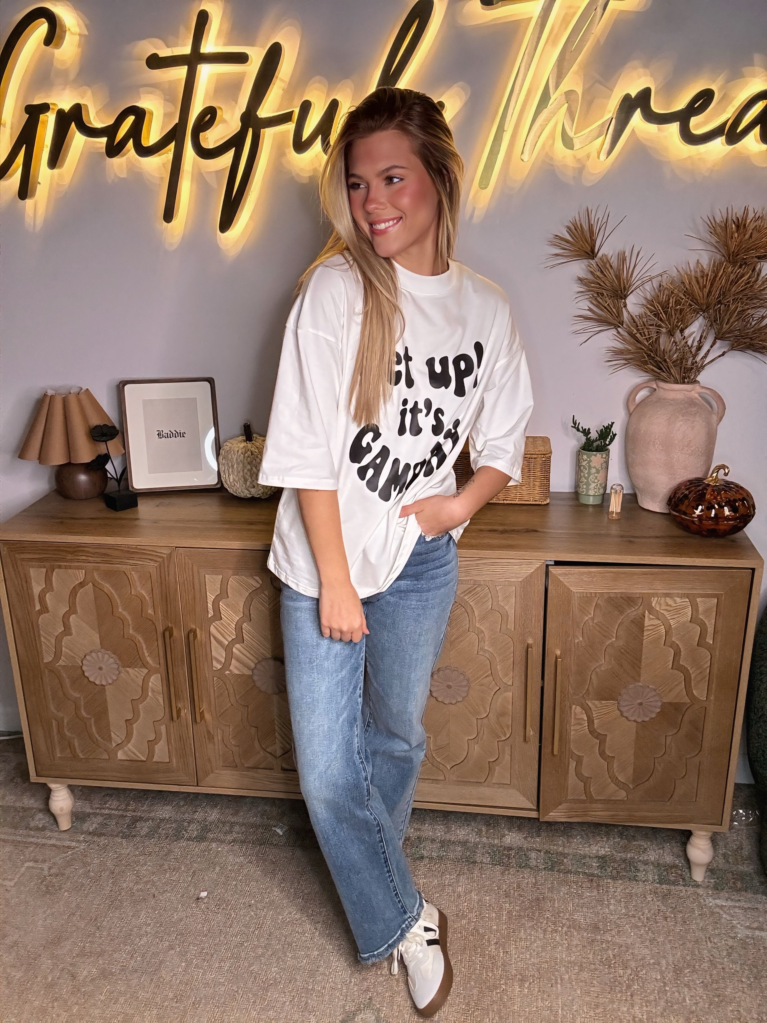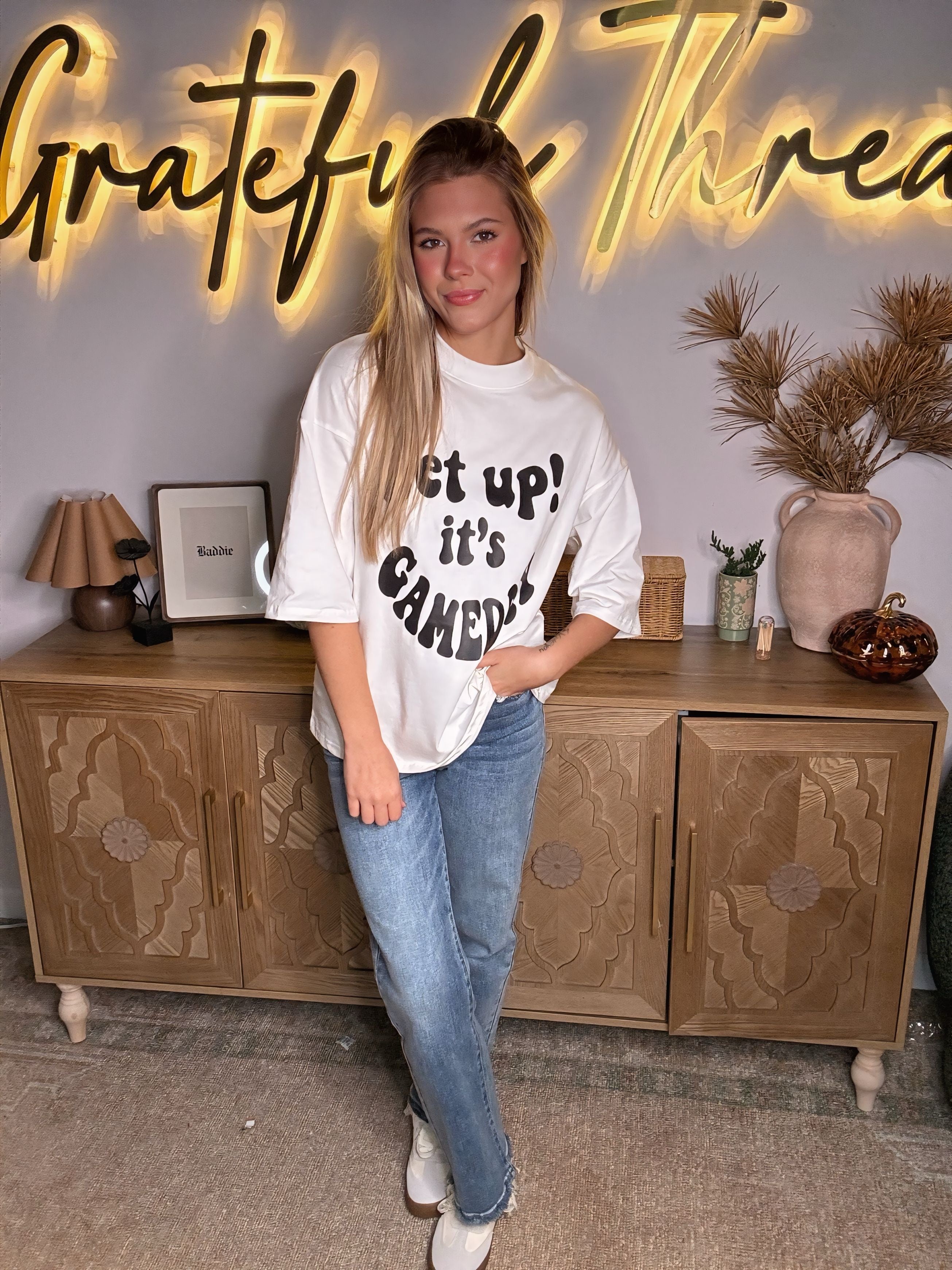 Rise, shine, and rep your team spirit in style with this oversized “Get Up! It’s Game Day” Tee by Grateful Threads. With its bold retro lettering and crisp white fabric, this shirt is the perfect mix of comfy and statement-making. The relaxed, oversized fit keeps you cool whether you’re tailgating, hitting the stands, or just cheering from the couch. Throw it on with jeans, leggings, or biker shorts for an effortlessly spirited look that screams game day vibes.