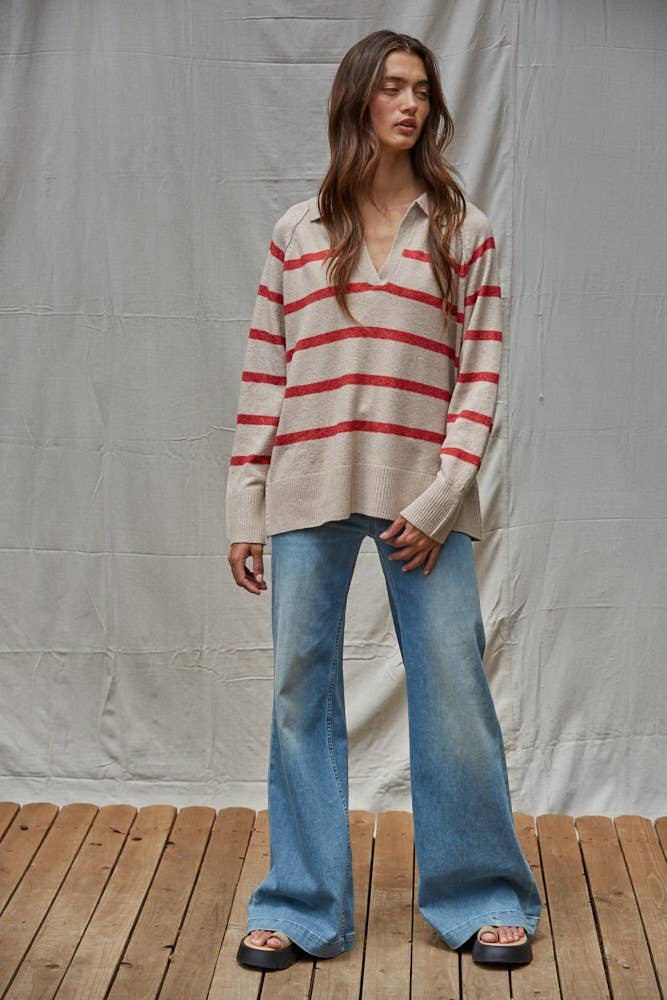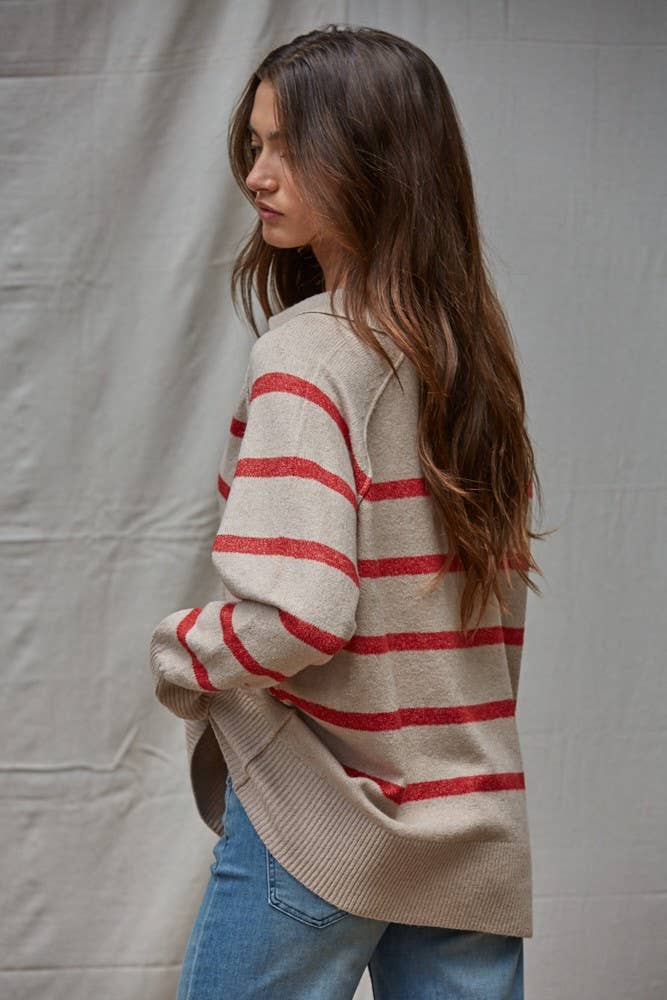 By Together - Knit Sweater Striped Collar V-Neck Pullover in Taupe with Red Stripe