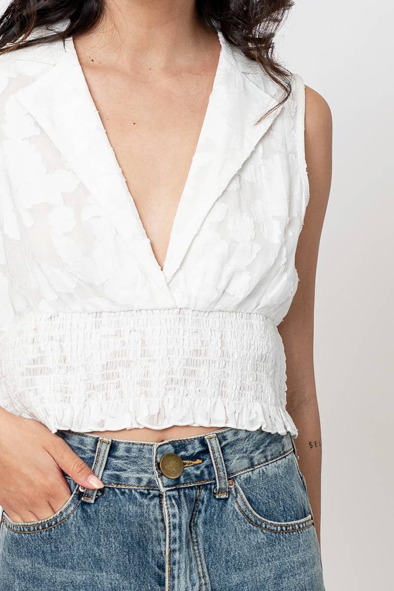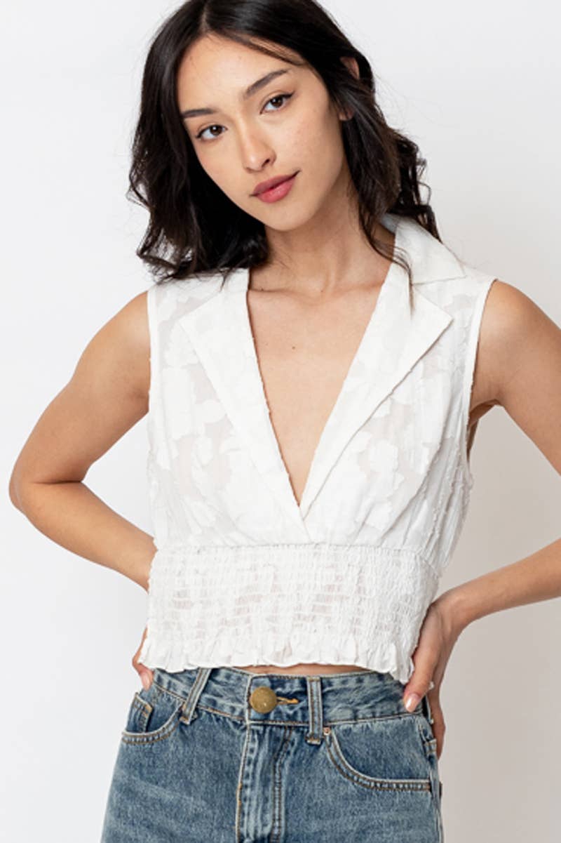 En Crème White Sleeveless Notch Lapel Cropped Top