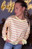 Sweet, sunny, and full of personality — the Lemon Twist Overlap Stripe Pullover by Grateful Threads brings a pop of fun to your casual lineup. This lightweight sweatshirt features vibrant pink stripes across a buttery yellow base for a cheerful, eye-catching look.