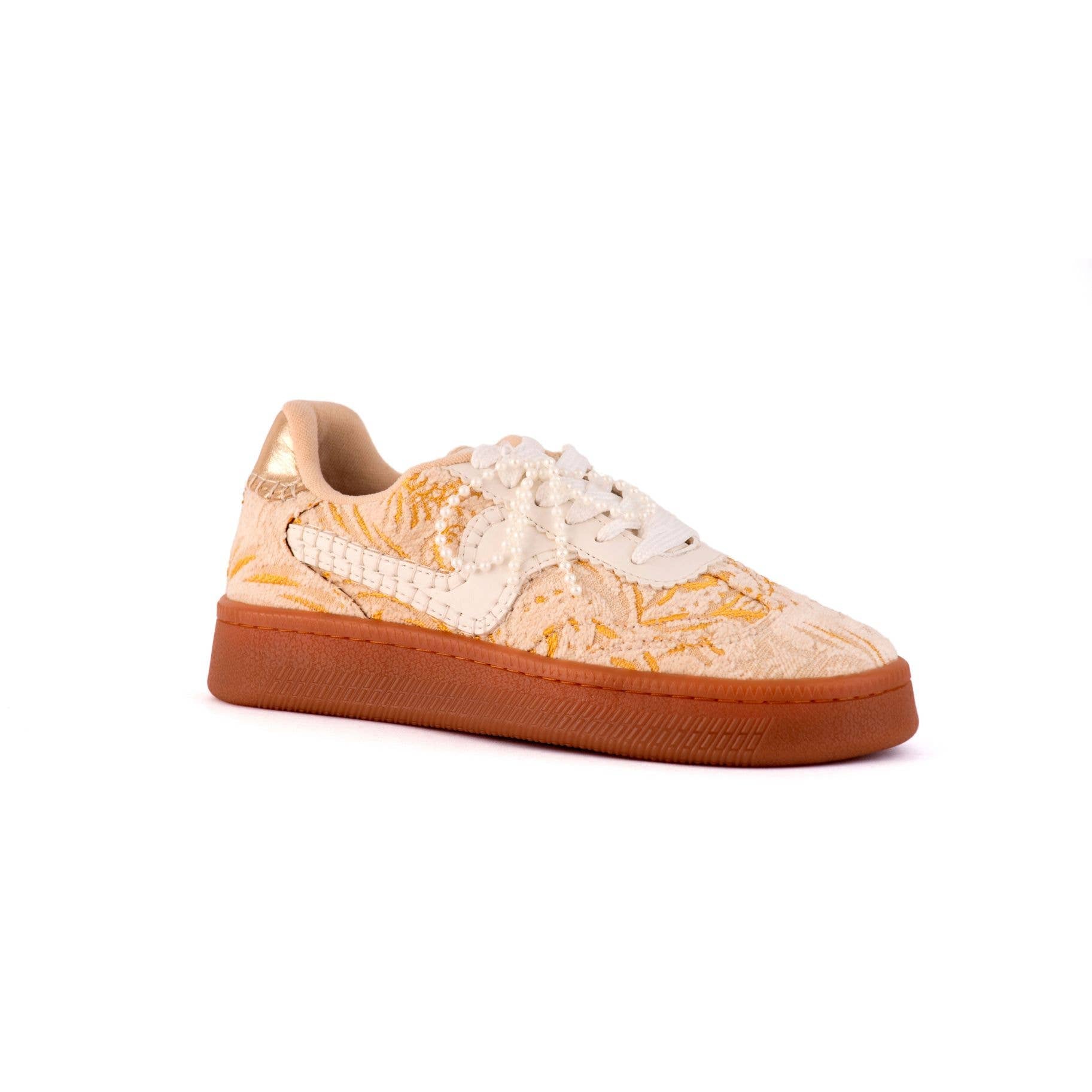 Maker's Shoes - Gold Lena Embroidered Fashion Sneakers with Pearl Bow Charms
