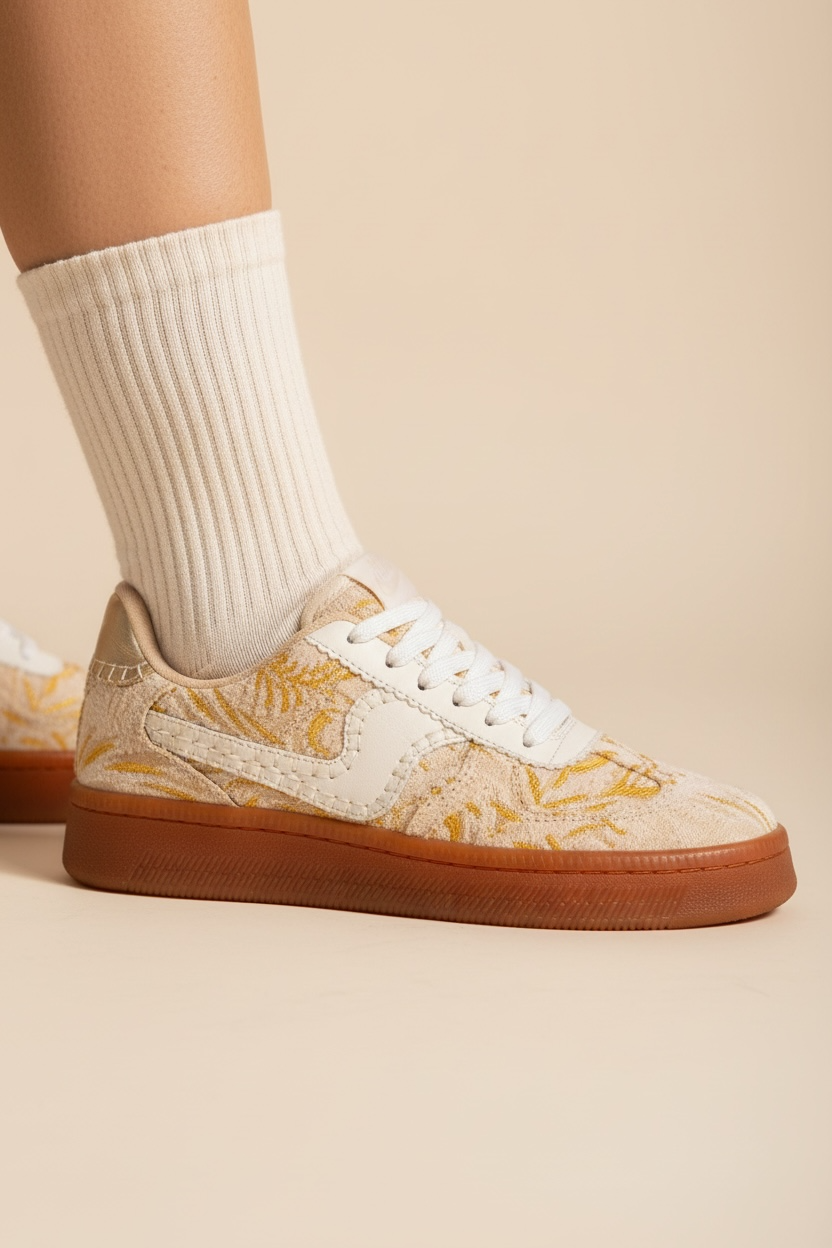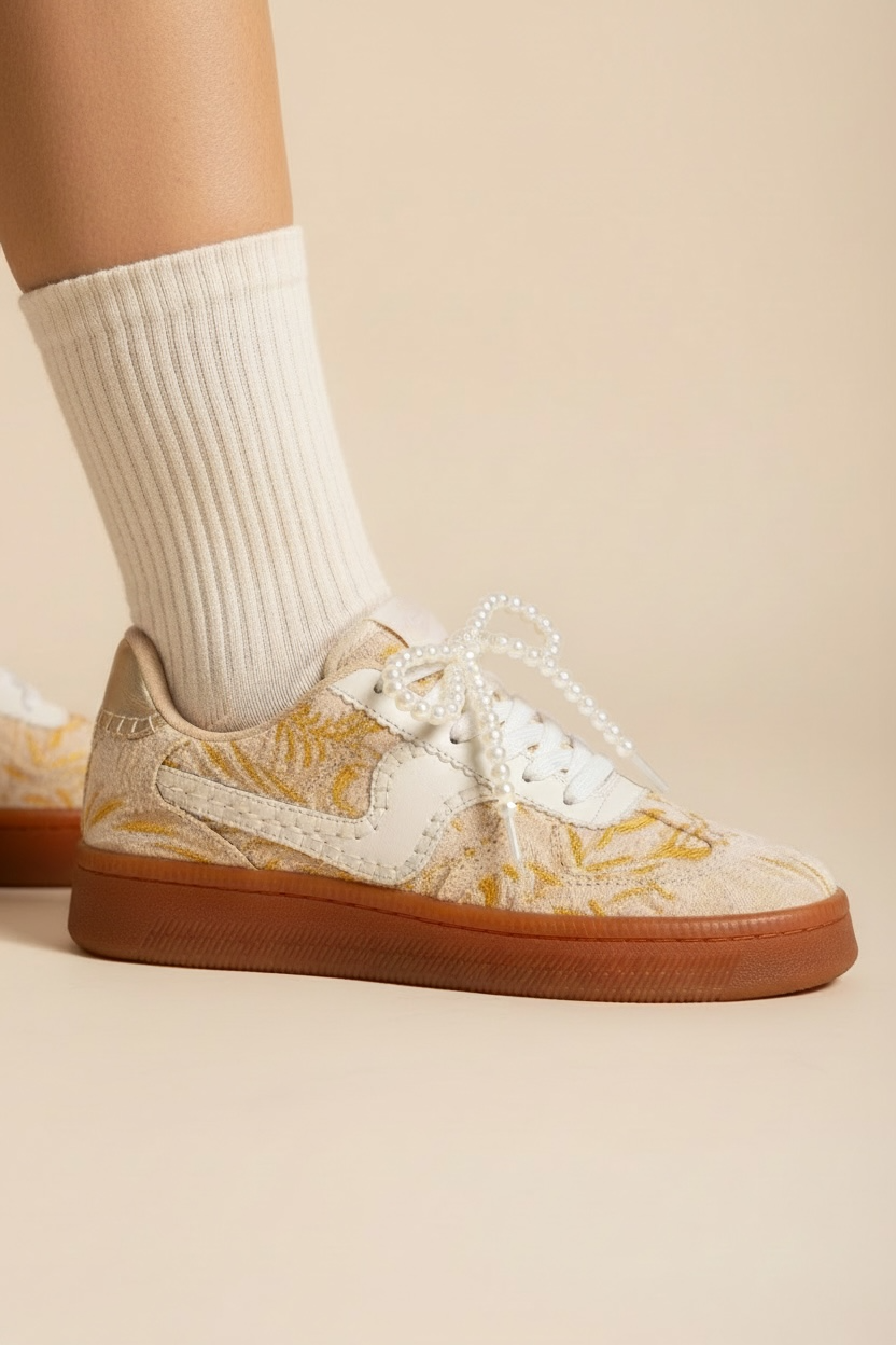 Turn everyday outfits into something unforgettable with the Maker’s Shoes Gold Lena Embroidered Fashion Sneakers. Designed for women who love standout details, these chic white sneakers feature a gorgeous gold floral embroidery that adds texture, elegance, and a touch of boho glam to your look. The intricate stitching paired with a warm gum sole creates the perfect balance of modern fashion and timeless charm.