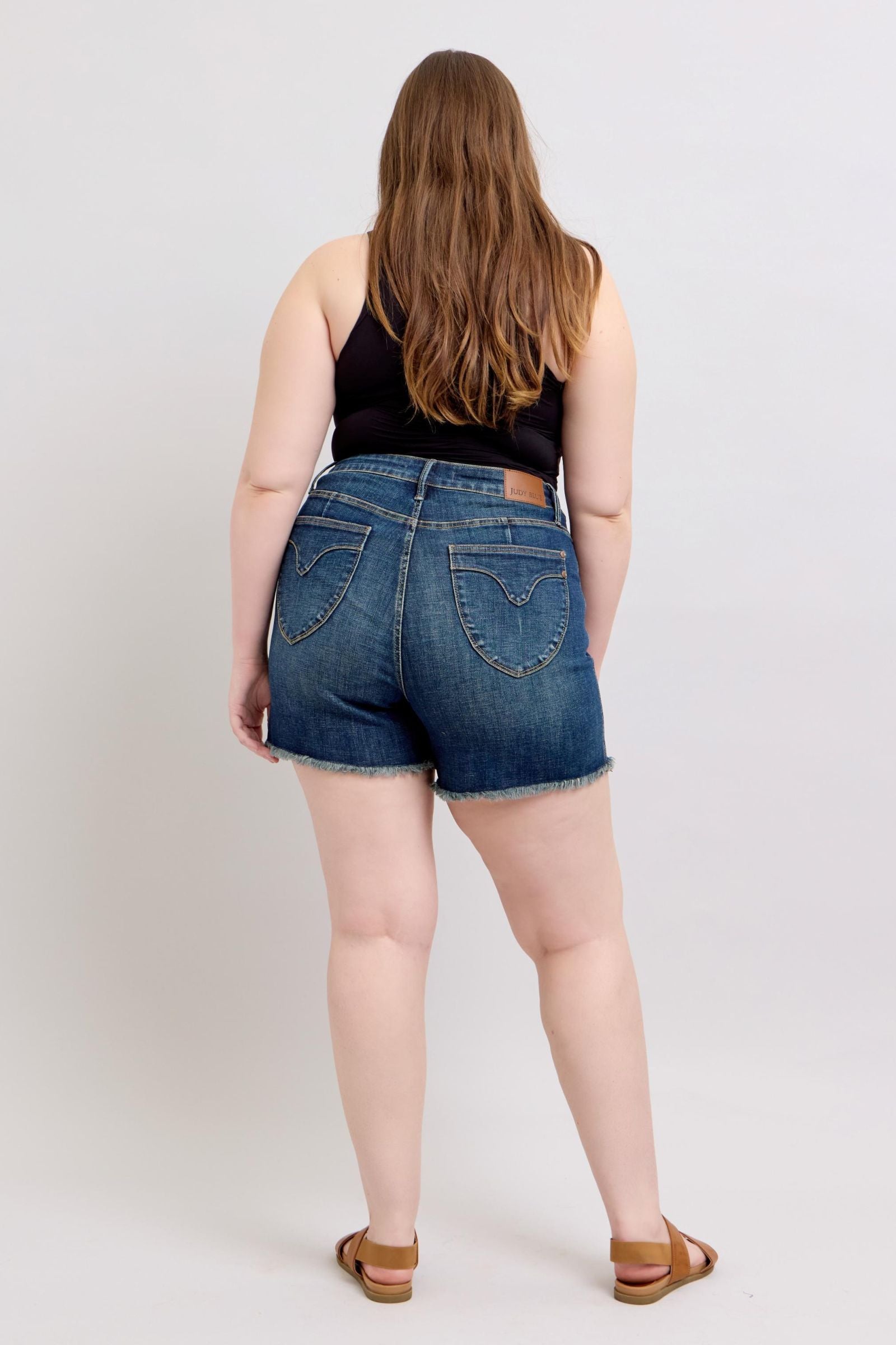 Judy Blue High Waisted Tummy Control Frayed Hem & Shield Back Pocket Dark Blue Denim Shorts PLUS