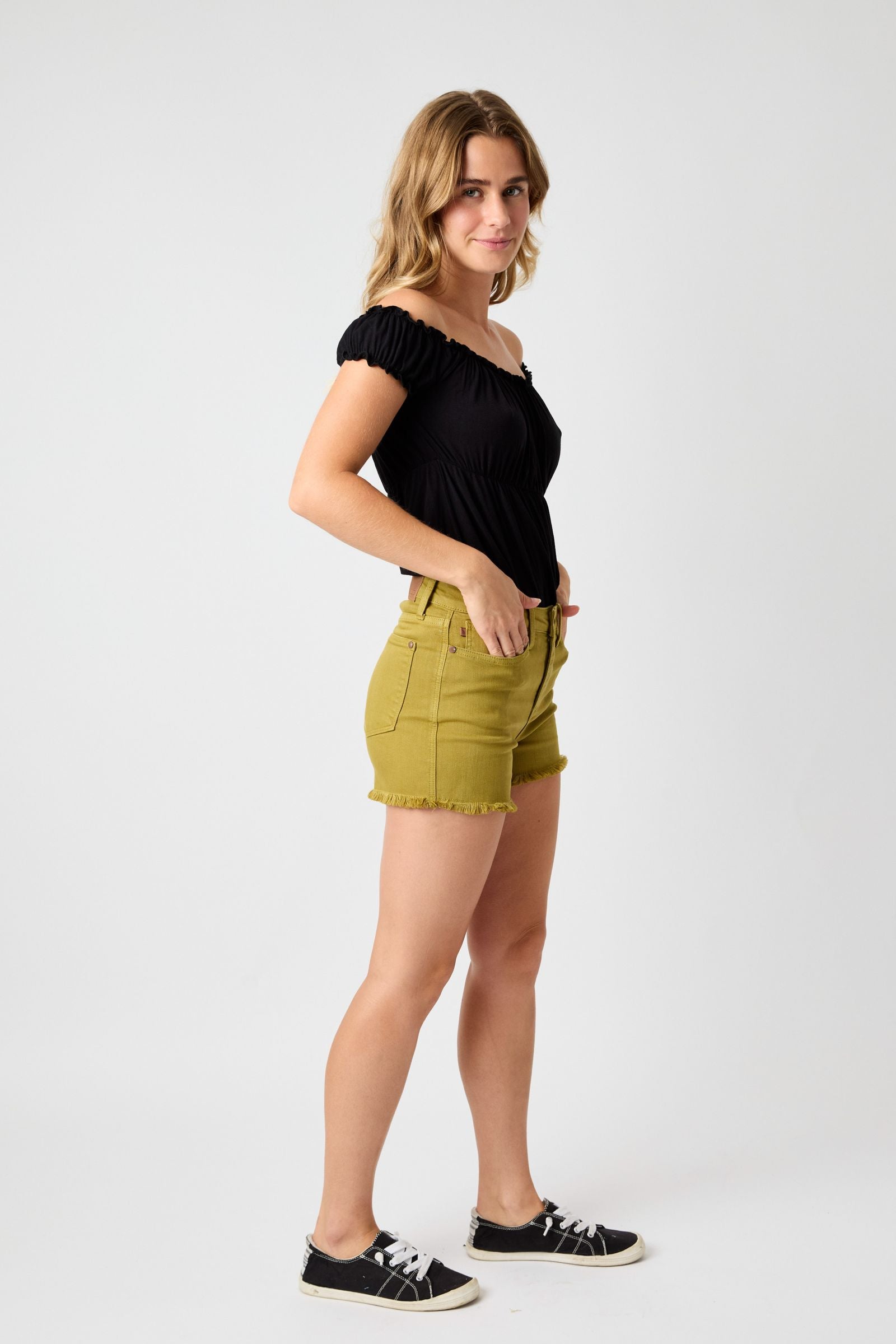 Judy Blue Mid Rise Garment Dyed Fray Hem Matcha Shorts
