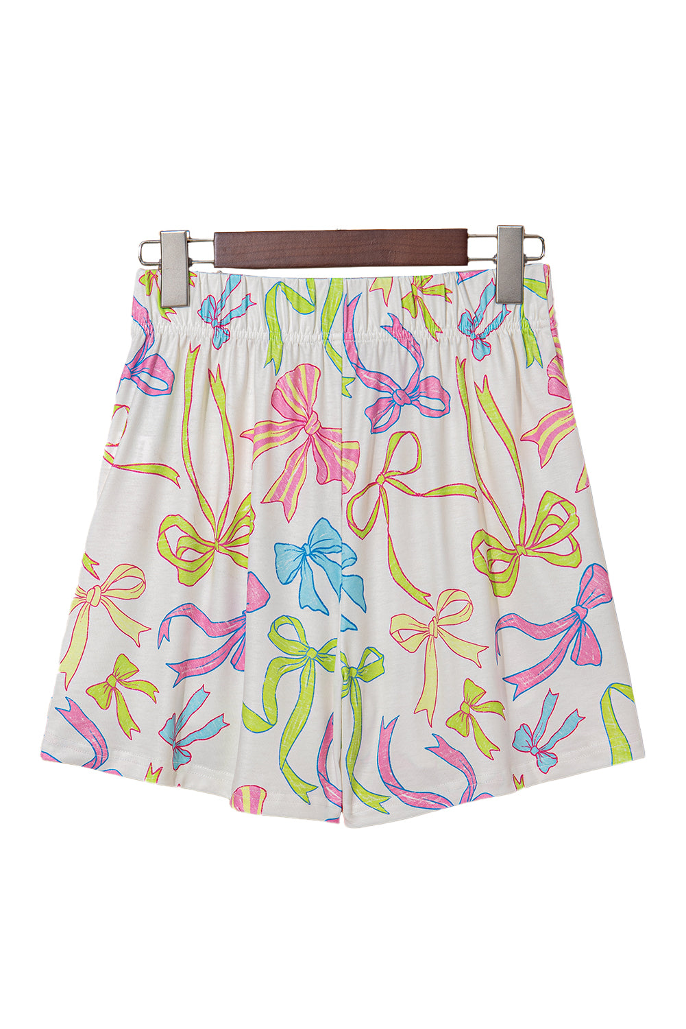 White Cheerful Bow Print Elastic Pull On Casual Shorts