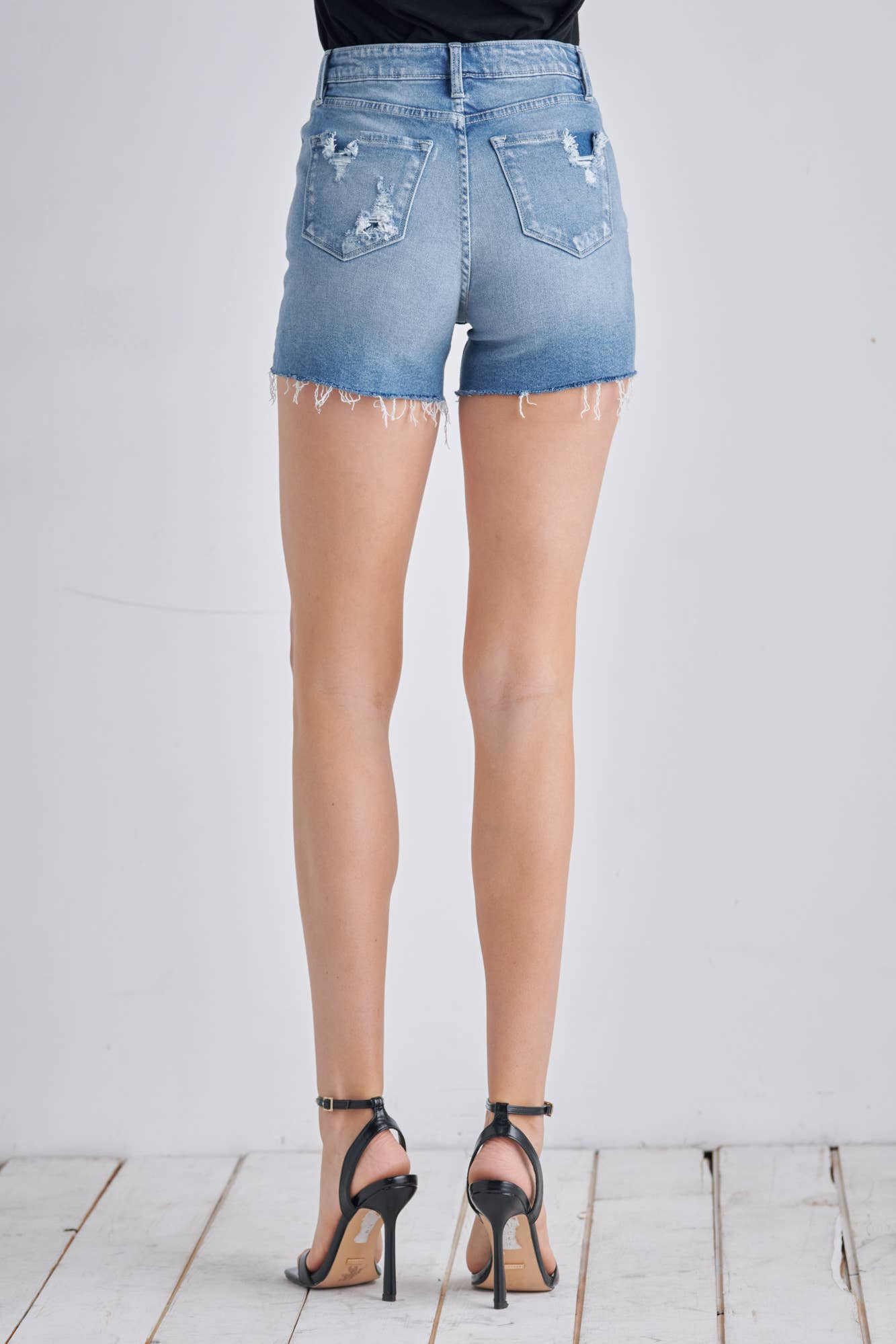 -STRETCH FABRIC DENIM -HIGH WAISTED -FRONT CUT SEAM DETAIL -FRONT STEP HEM DETAIL FRONT RISE : 11" INSEAM:  3 1/2" MODEL IS 5' 9" WEARING SIZE 26