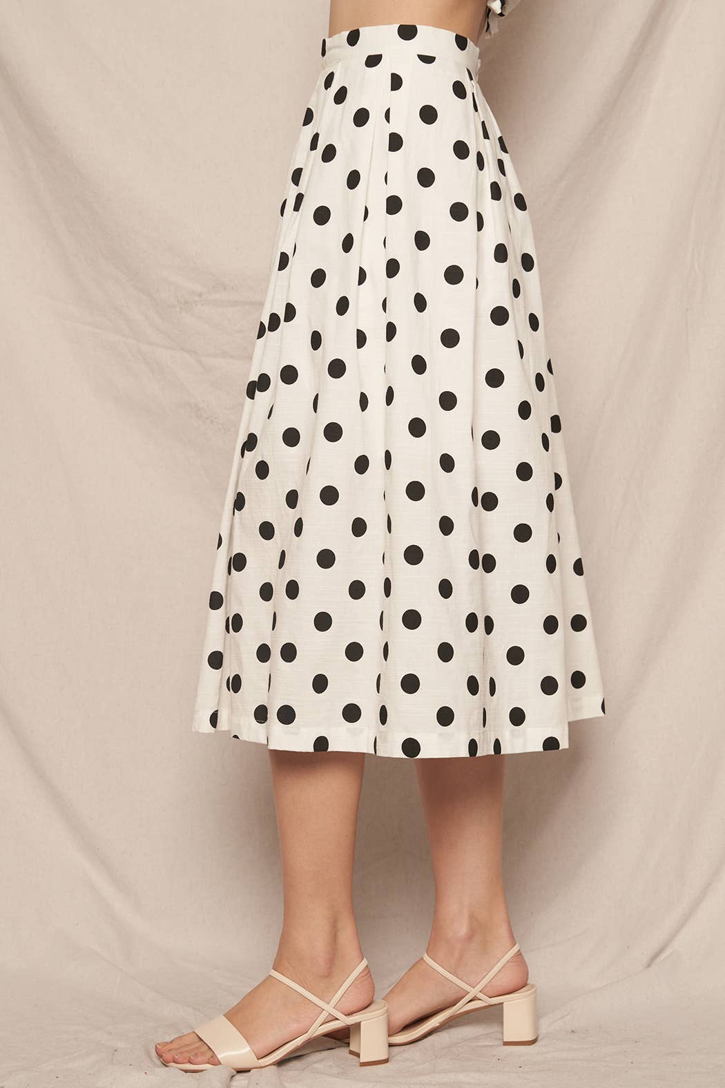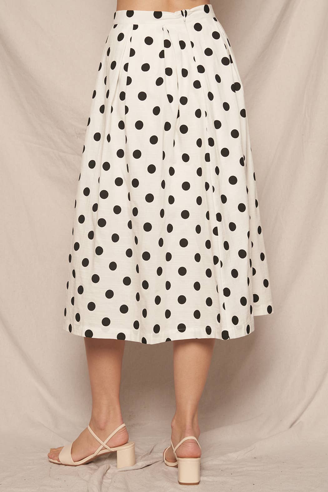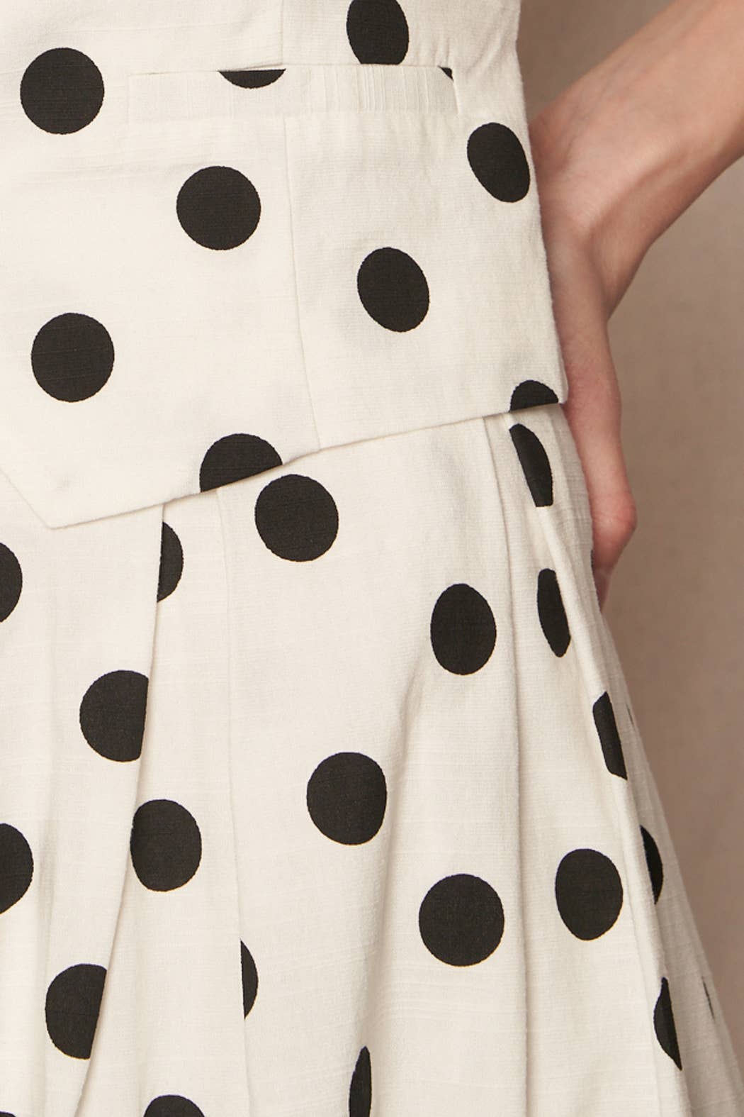 En Crème White Pleated A-Line Midi Skirt with Black Polka Dots