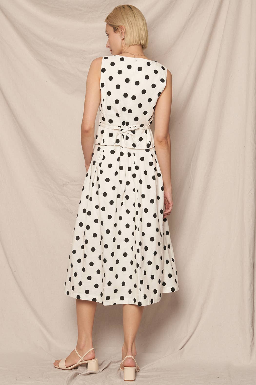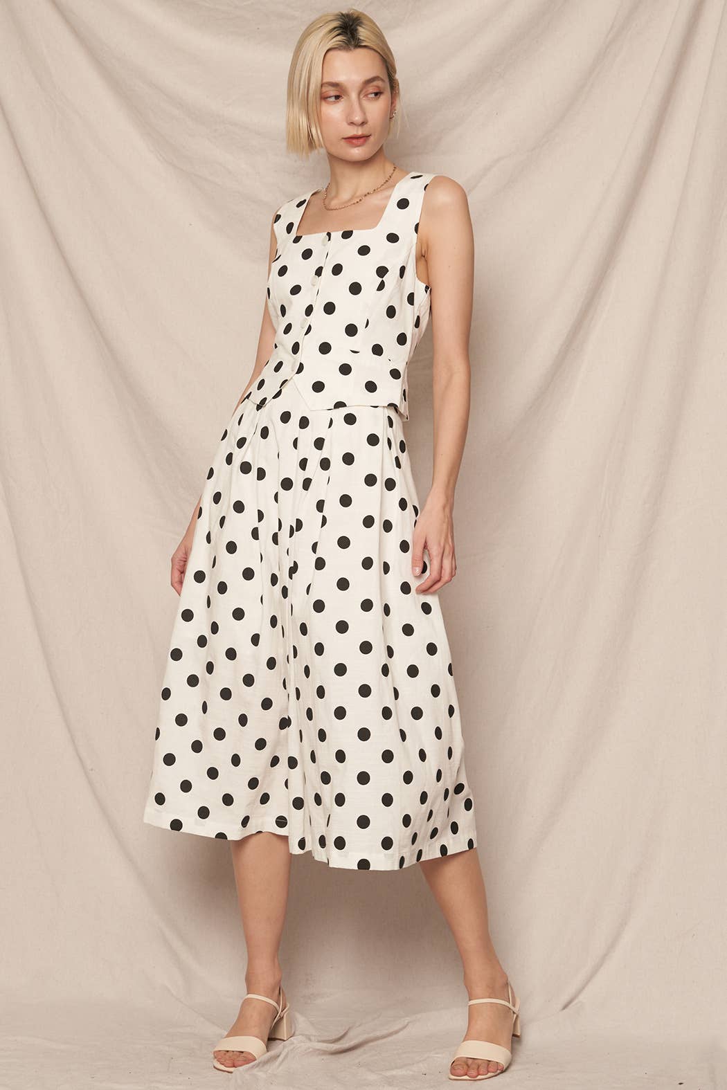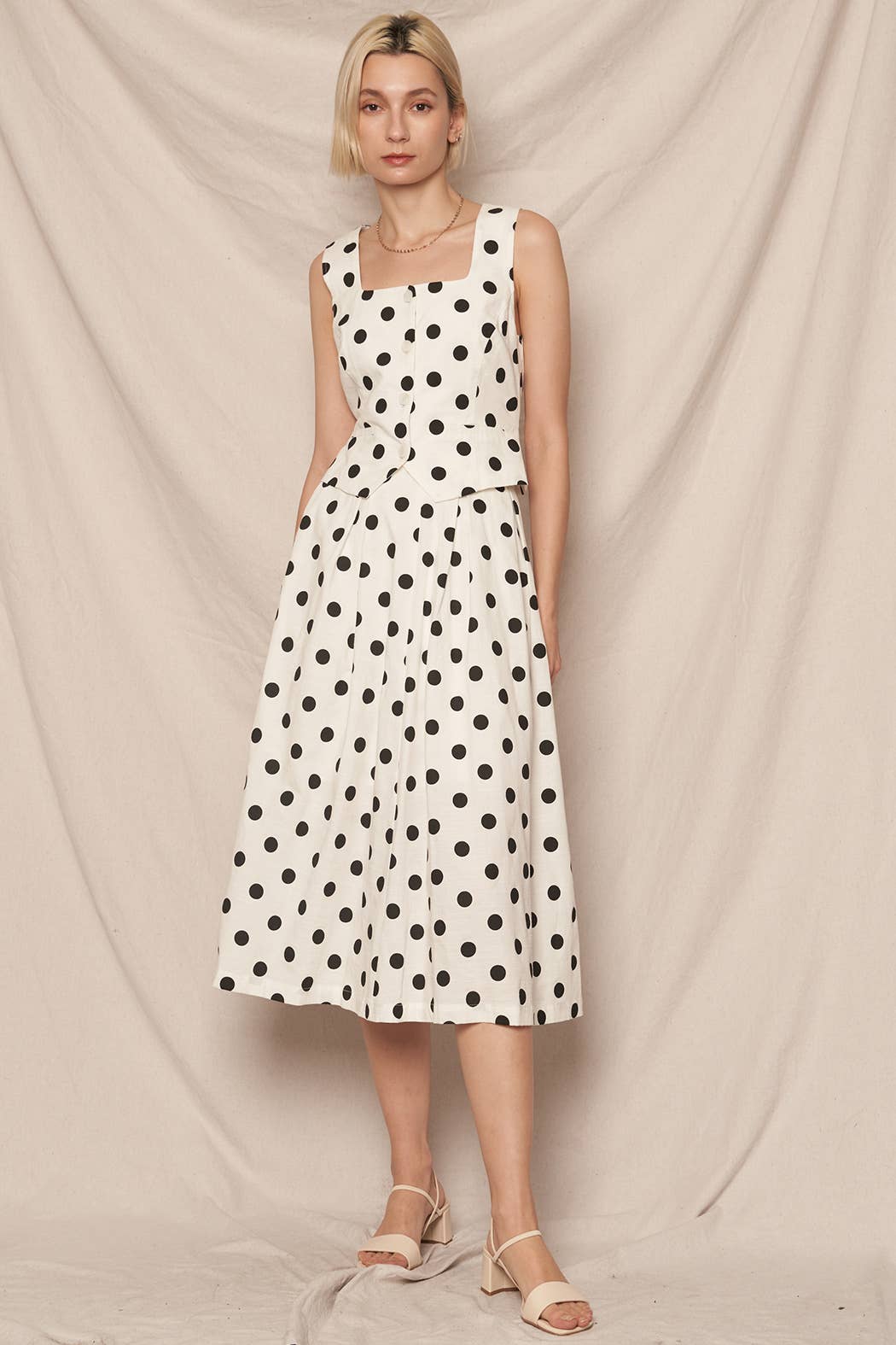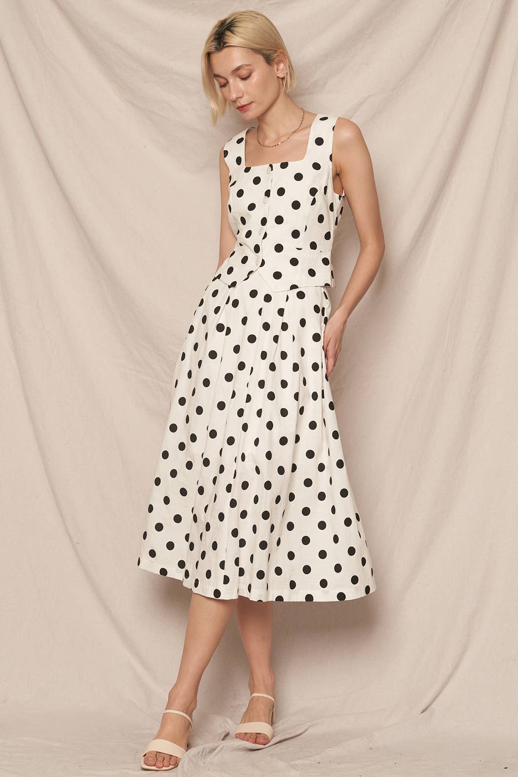 En Crème White Pleated A-Line Midi Skirt with Black Polka Dots