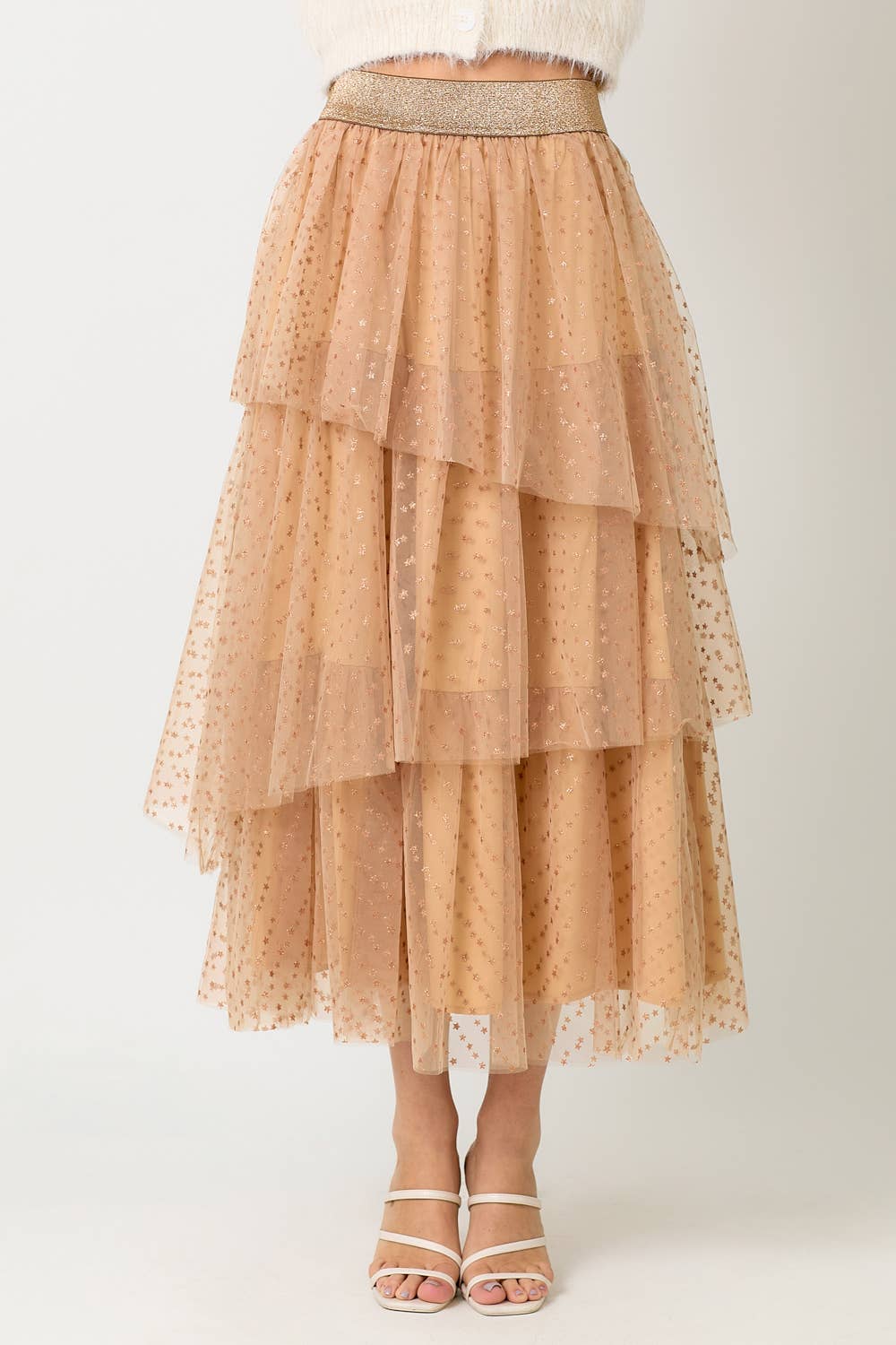 Mystree Peach/Gold Asymmetrical Tiered Ruffle Tulle Skirt