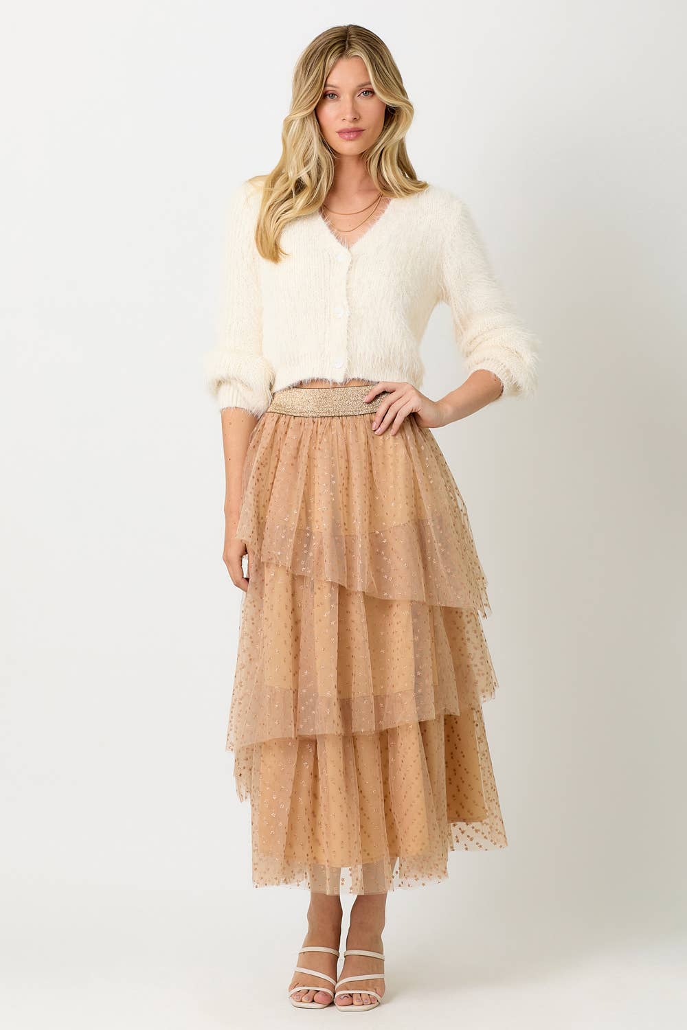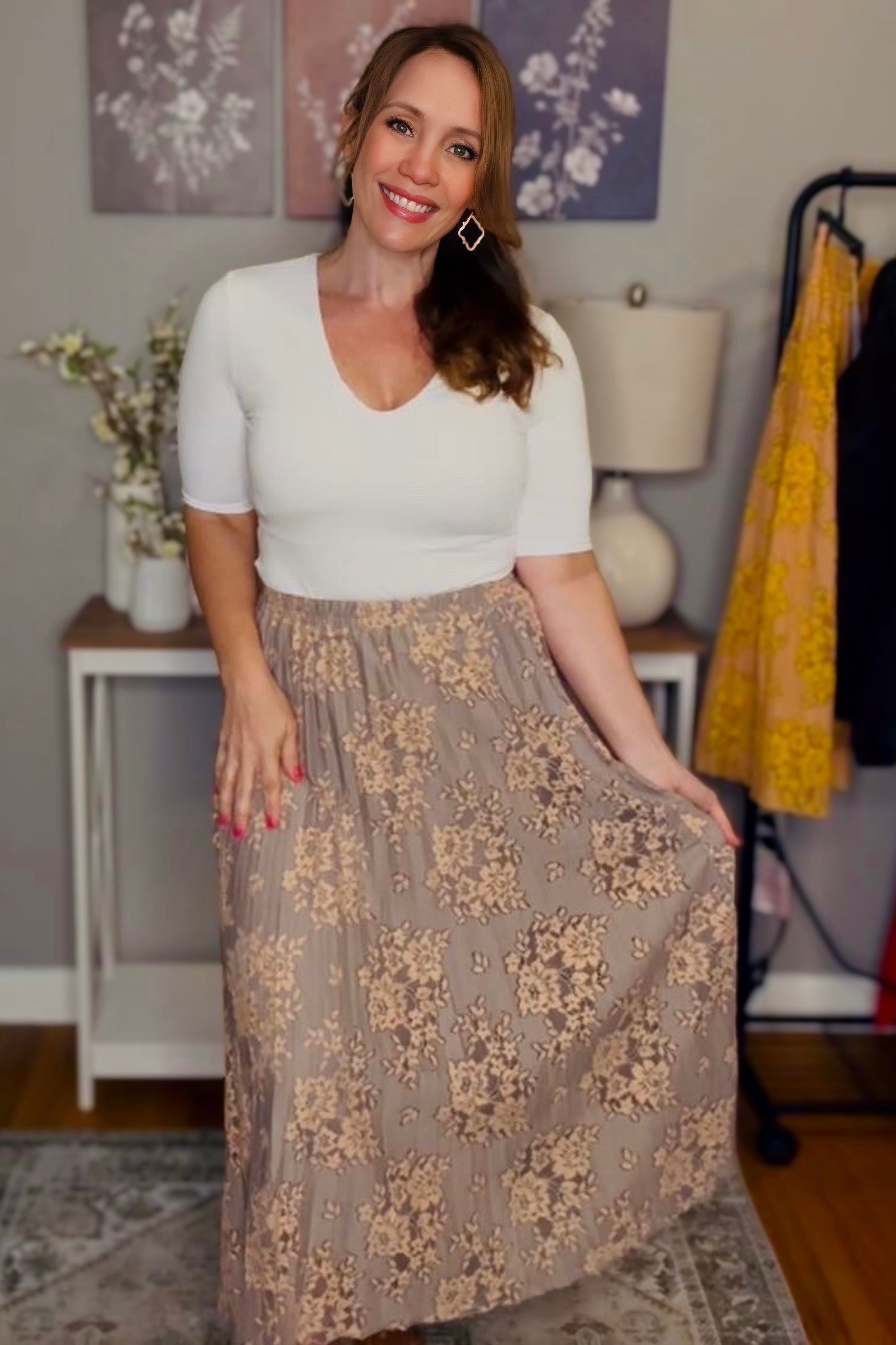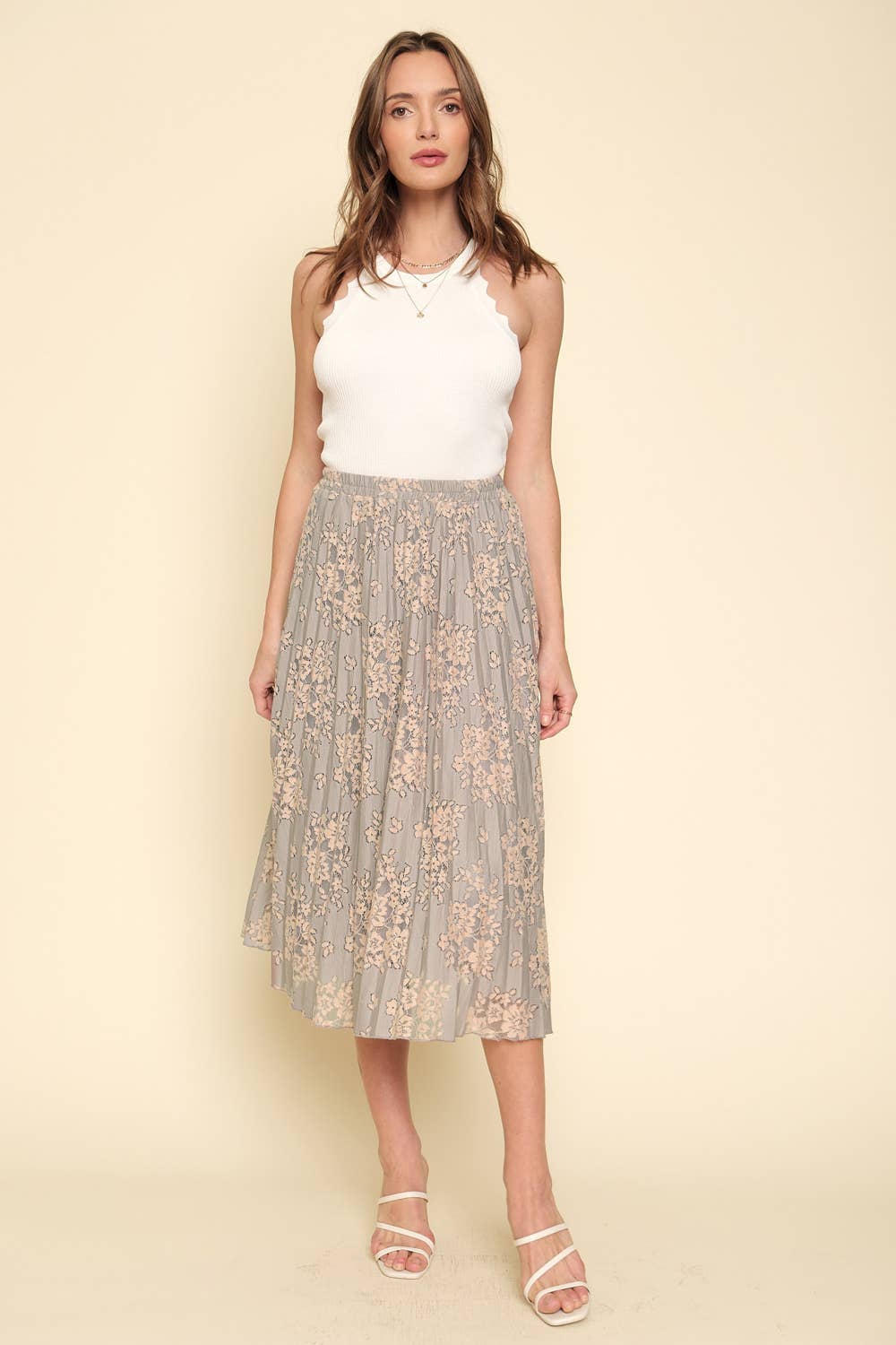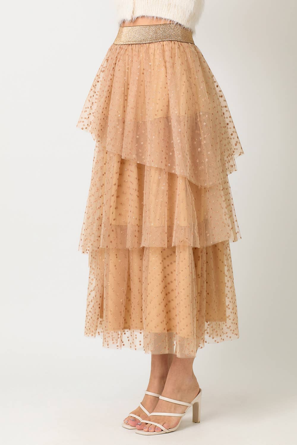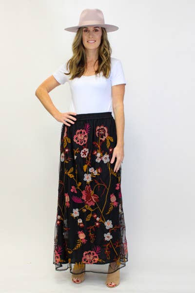 Oatmeal Embroidered Mesh Overlay Flowy Long Skirt