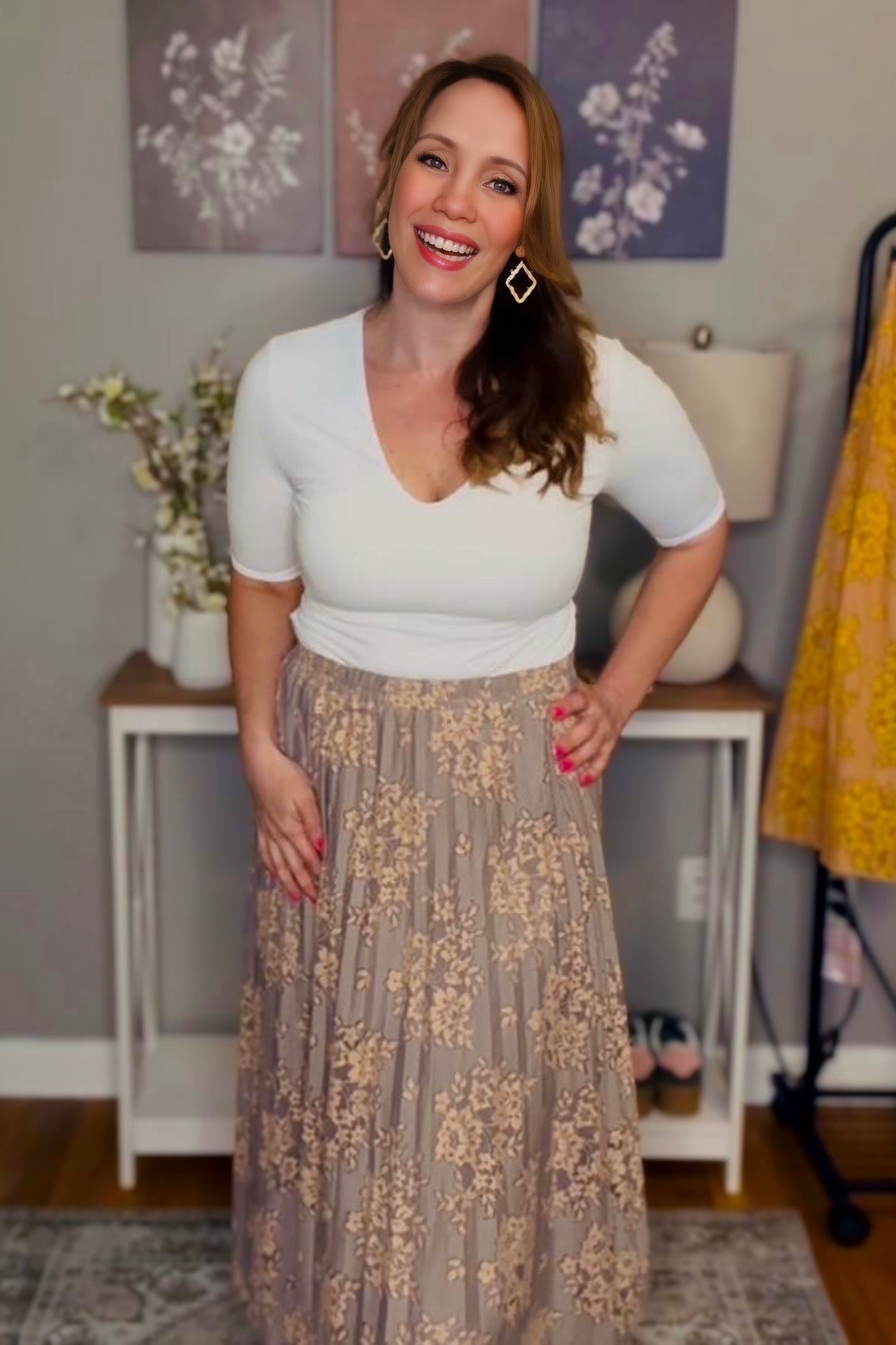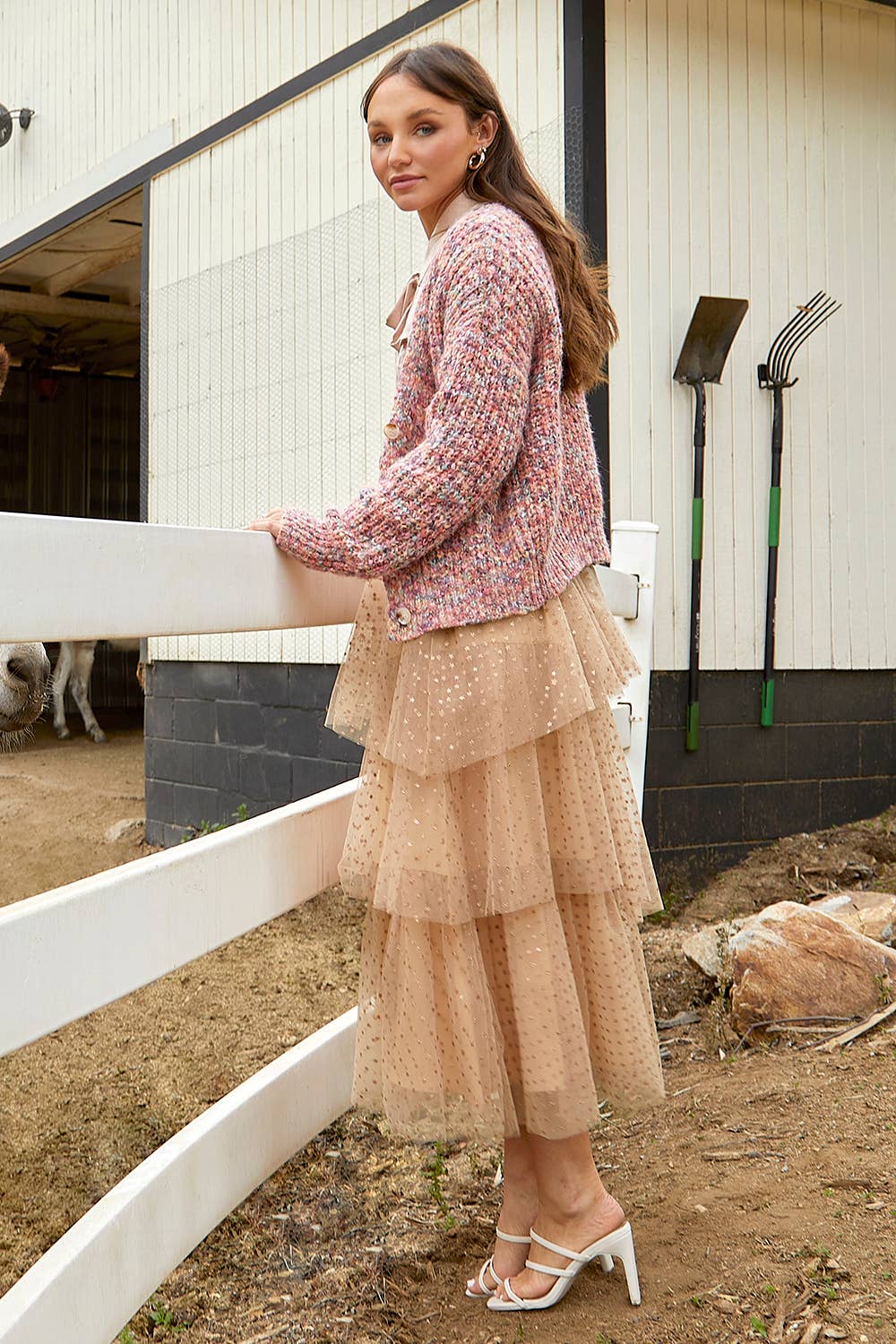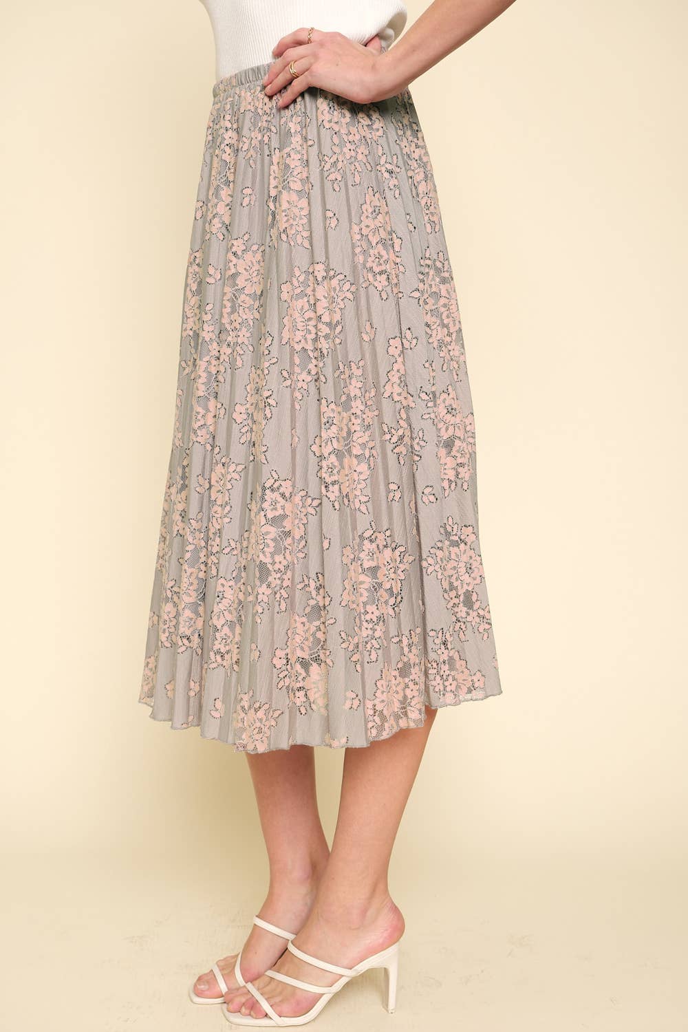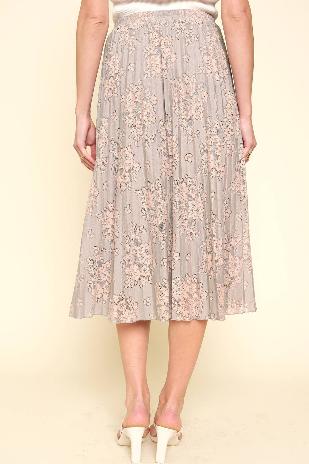 Oatmeal Embroidered Mesh Overlay Flowy Long Skirt