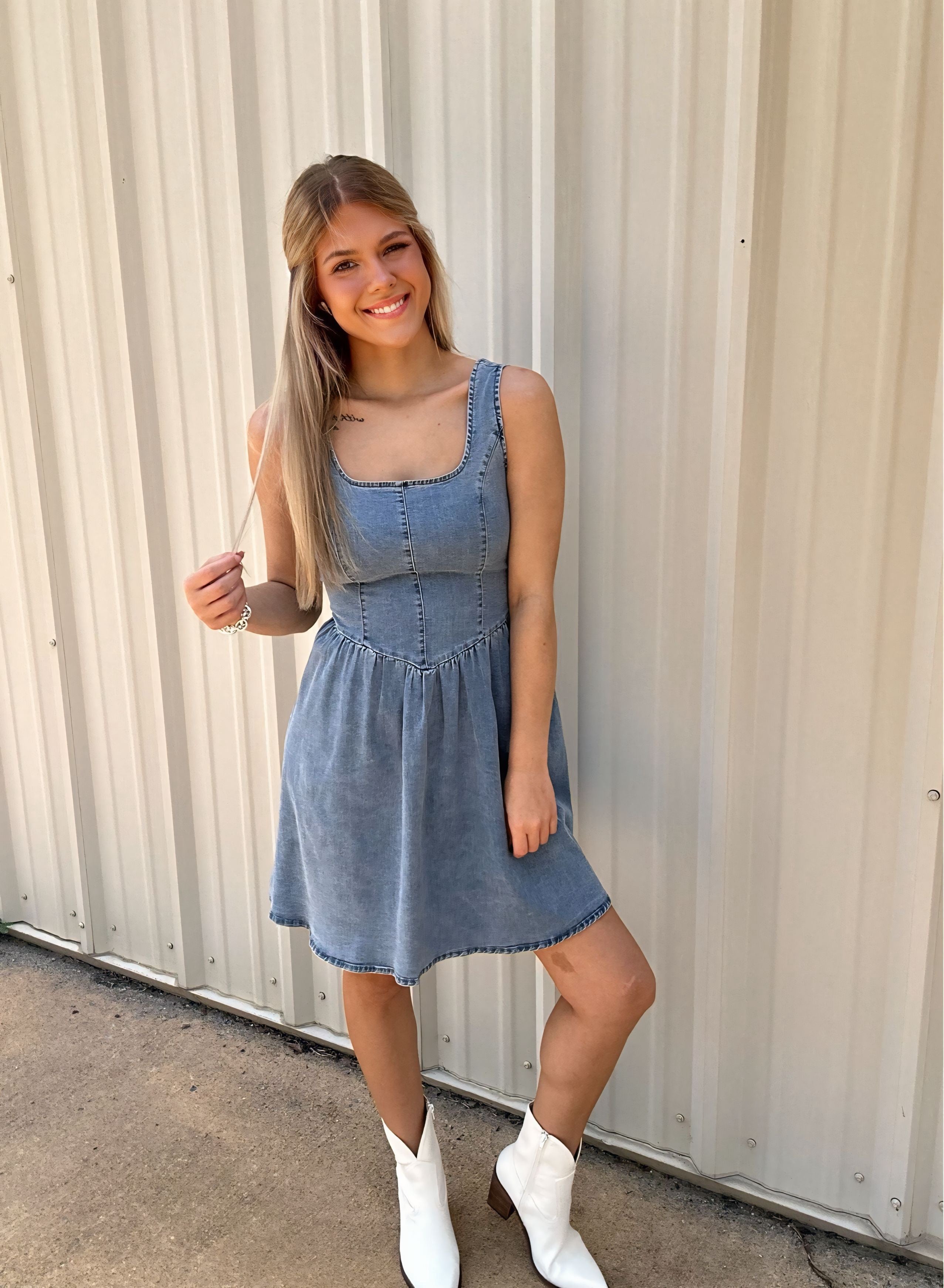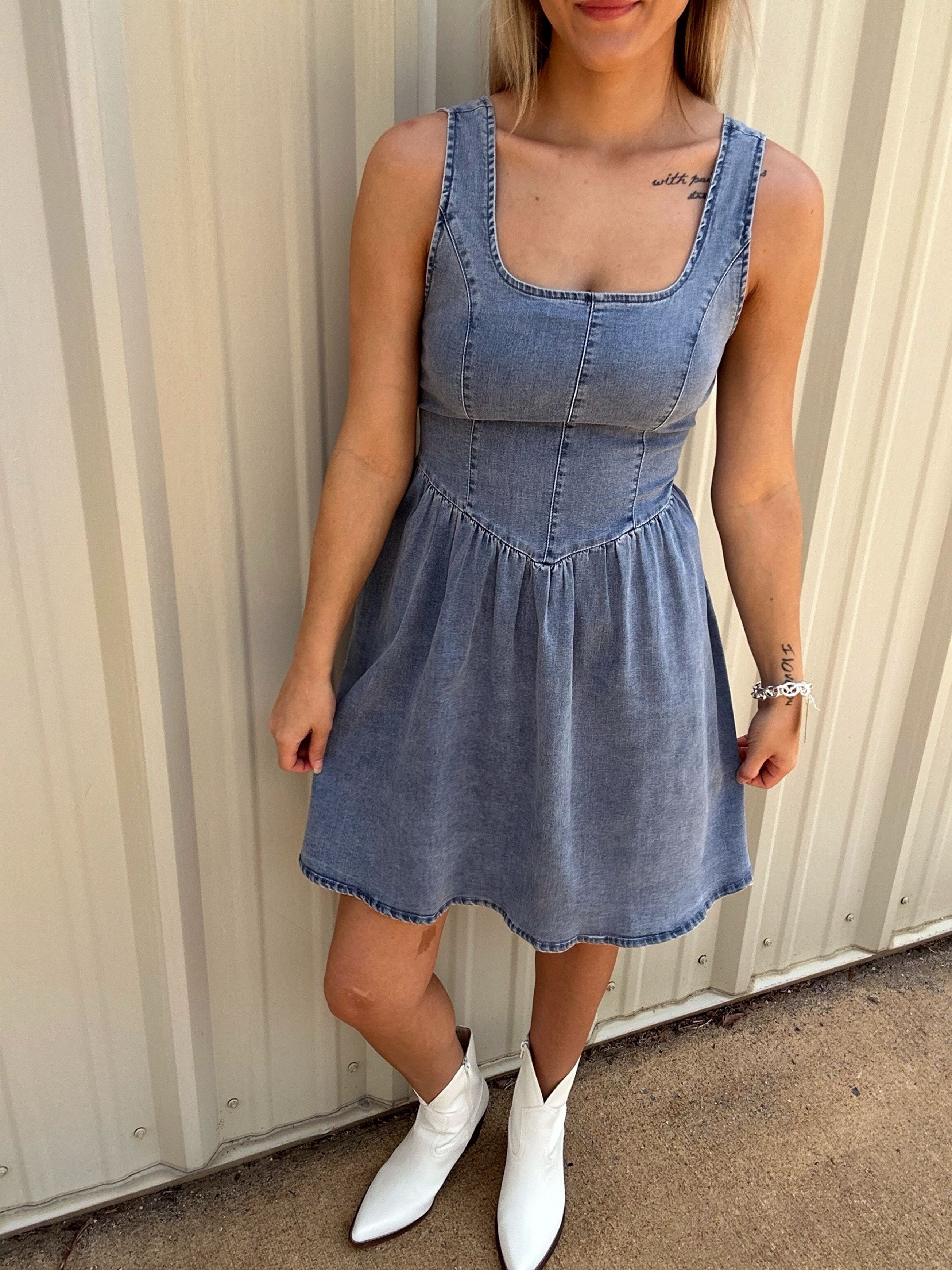 Chambray Square Neck Bowknot A-line Sleeveless Denim Dress