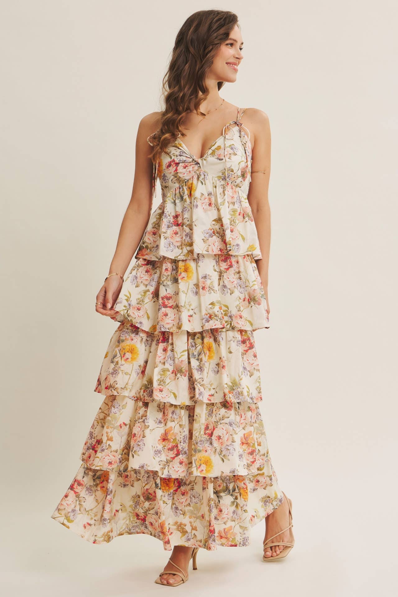 Adjustable double shoulder tie straps bring an airy, feminine finish, while the smocked back offers a comfortable, flexible fit that moves with you. Cascading tiered ruffles create beautiful dimension and flow, giving this dress that effortless “float as you walk” kind of energy.