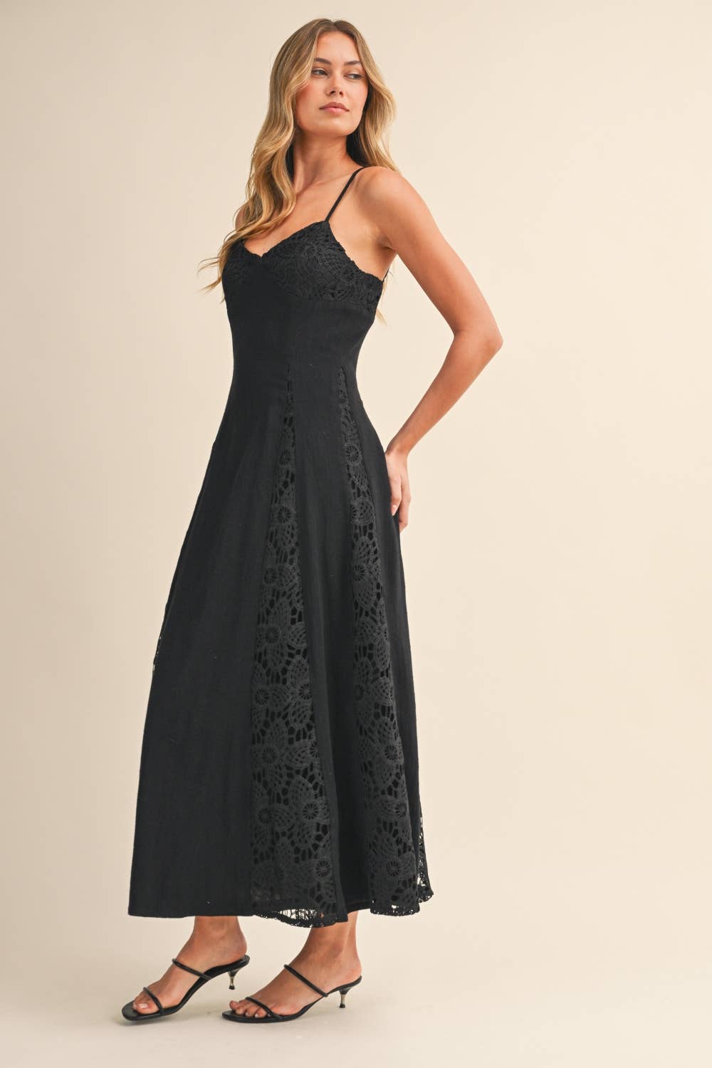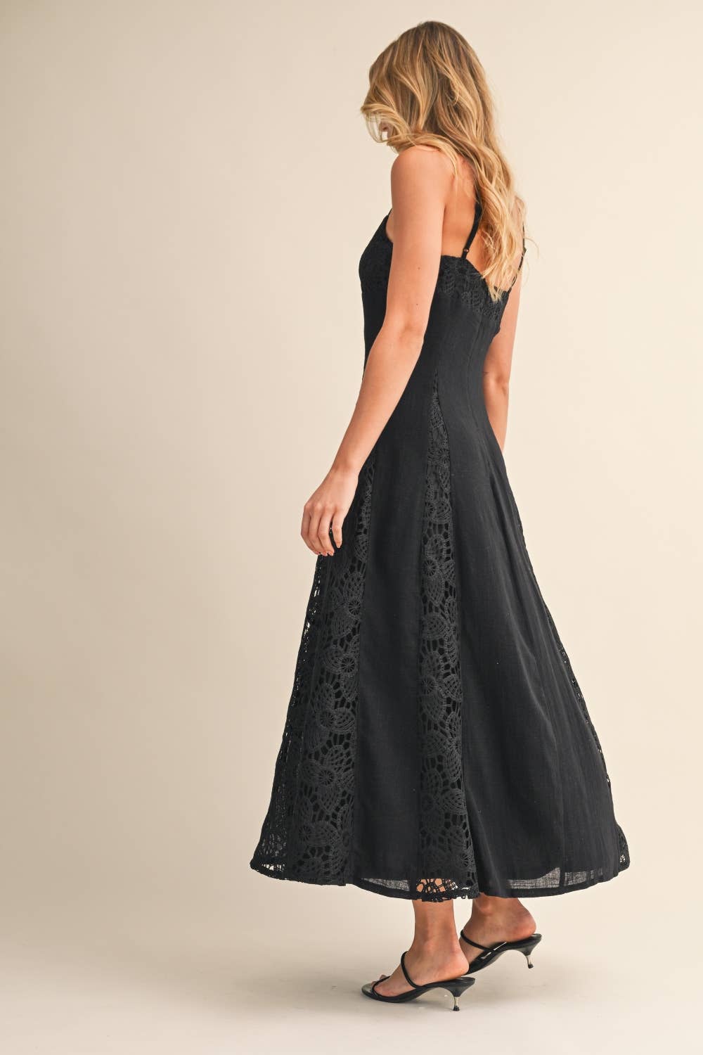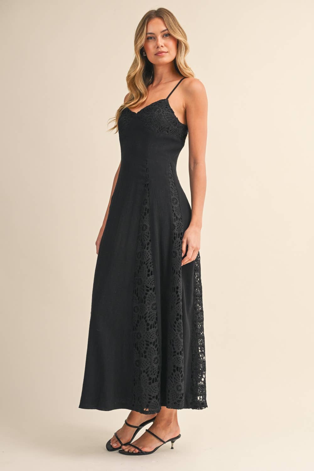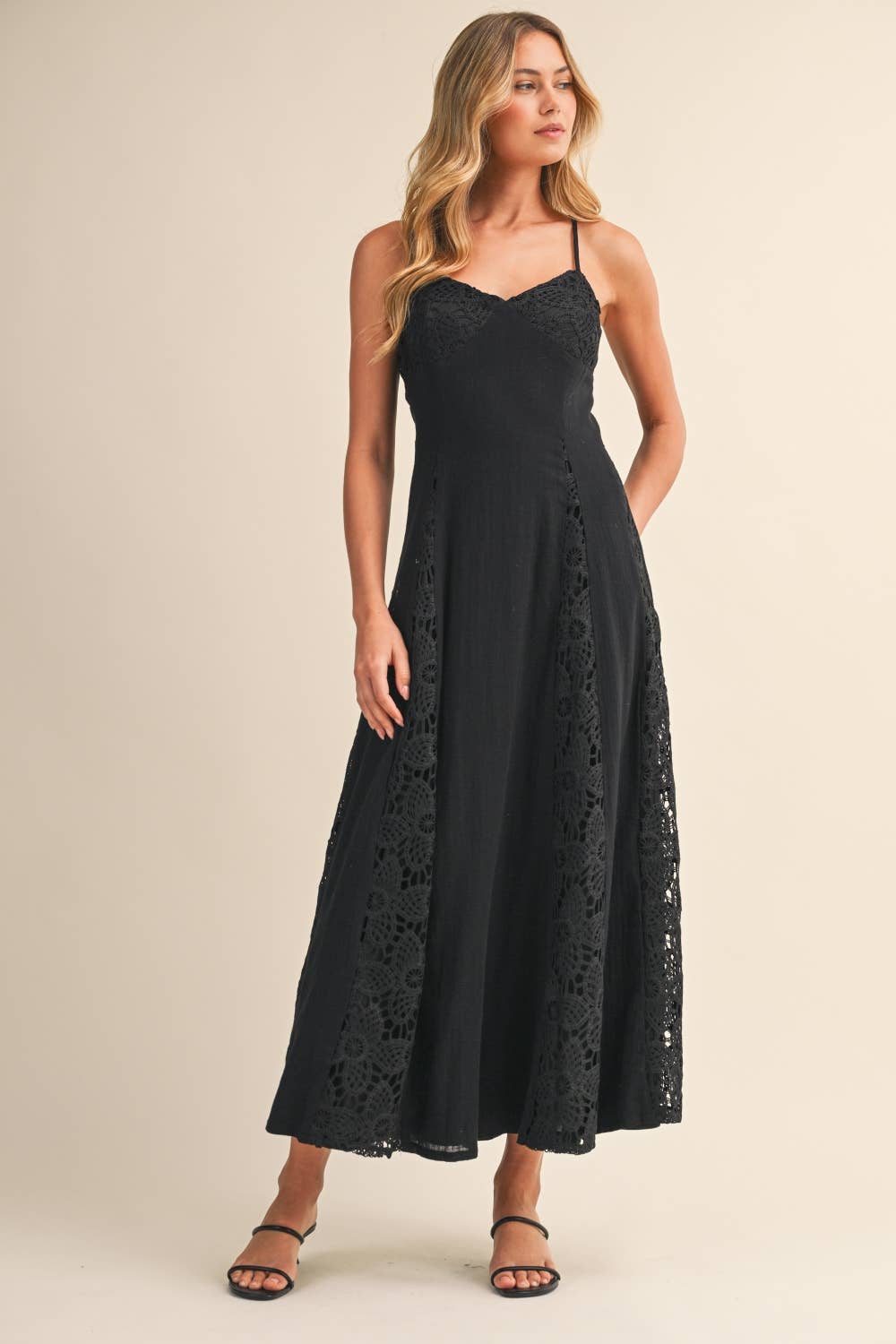 - Linen maxi dress with lace contrast panels