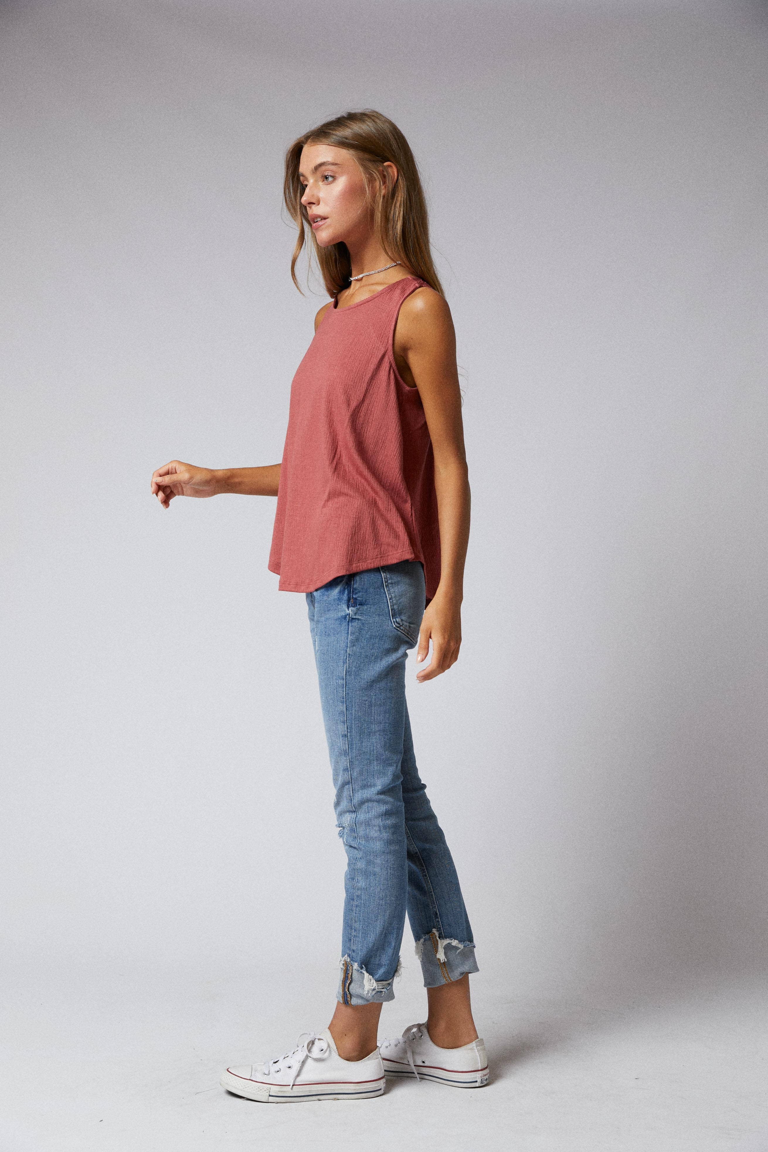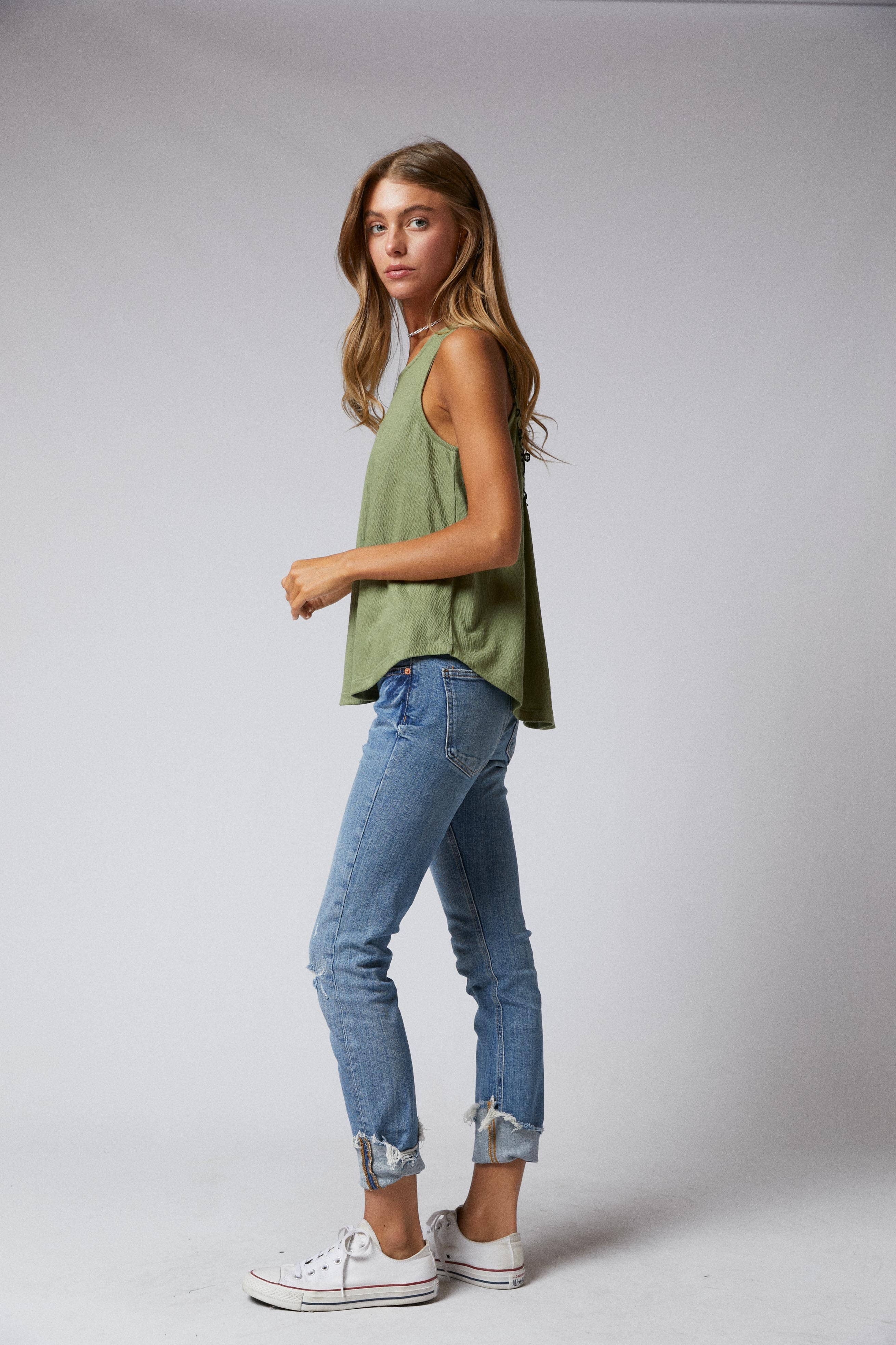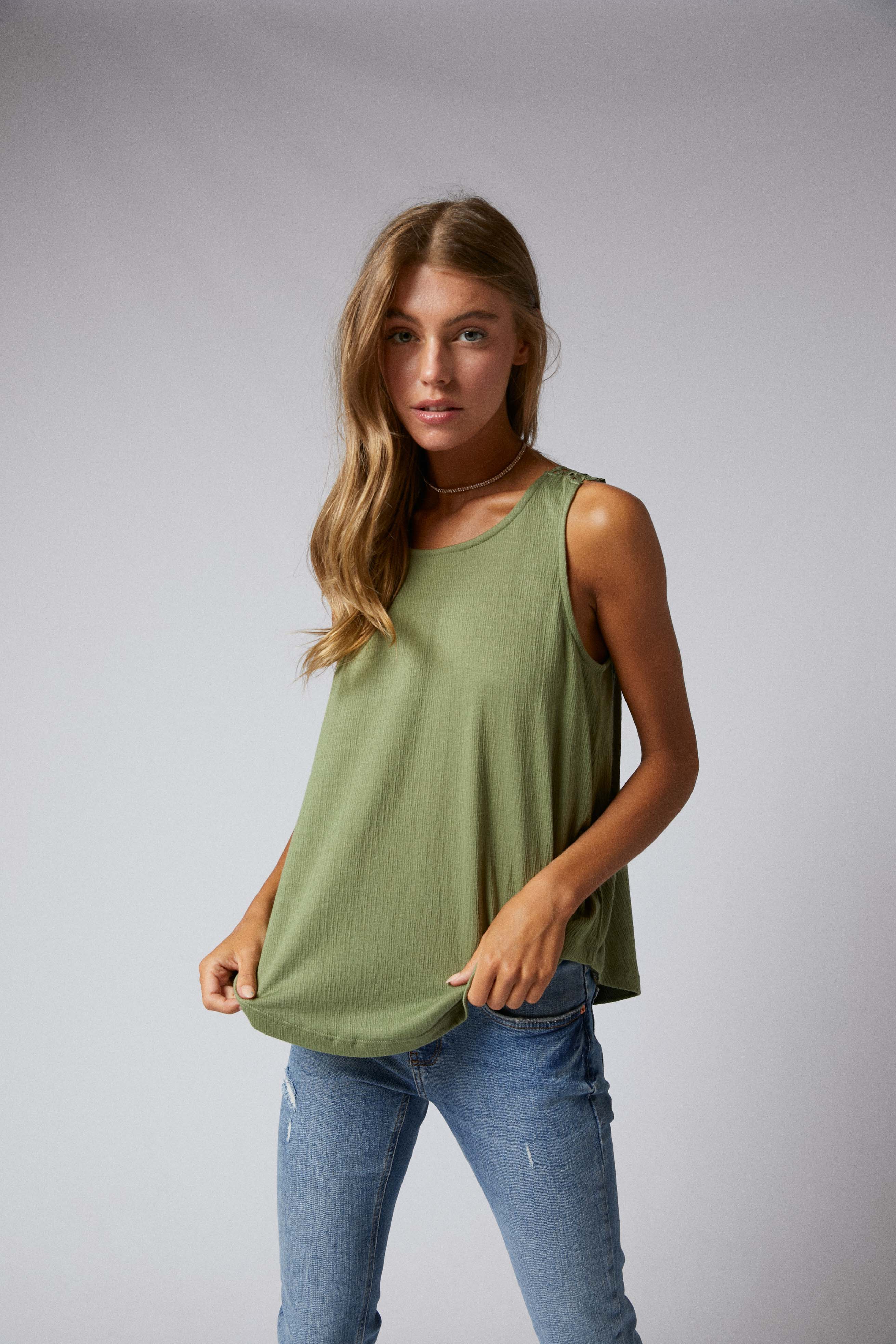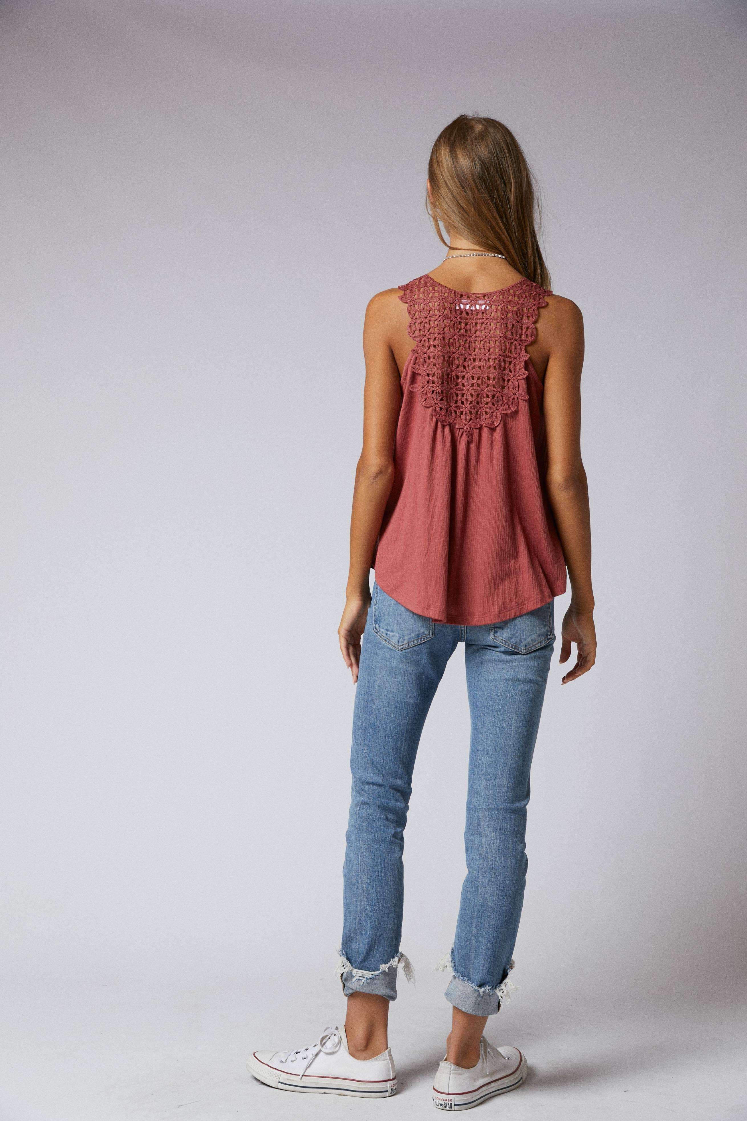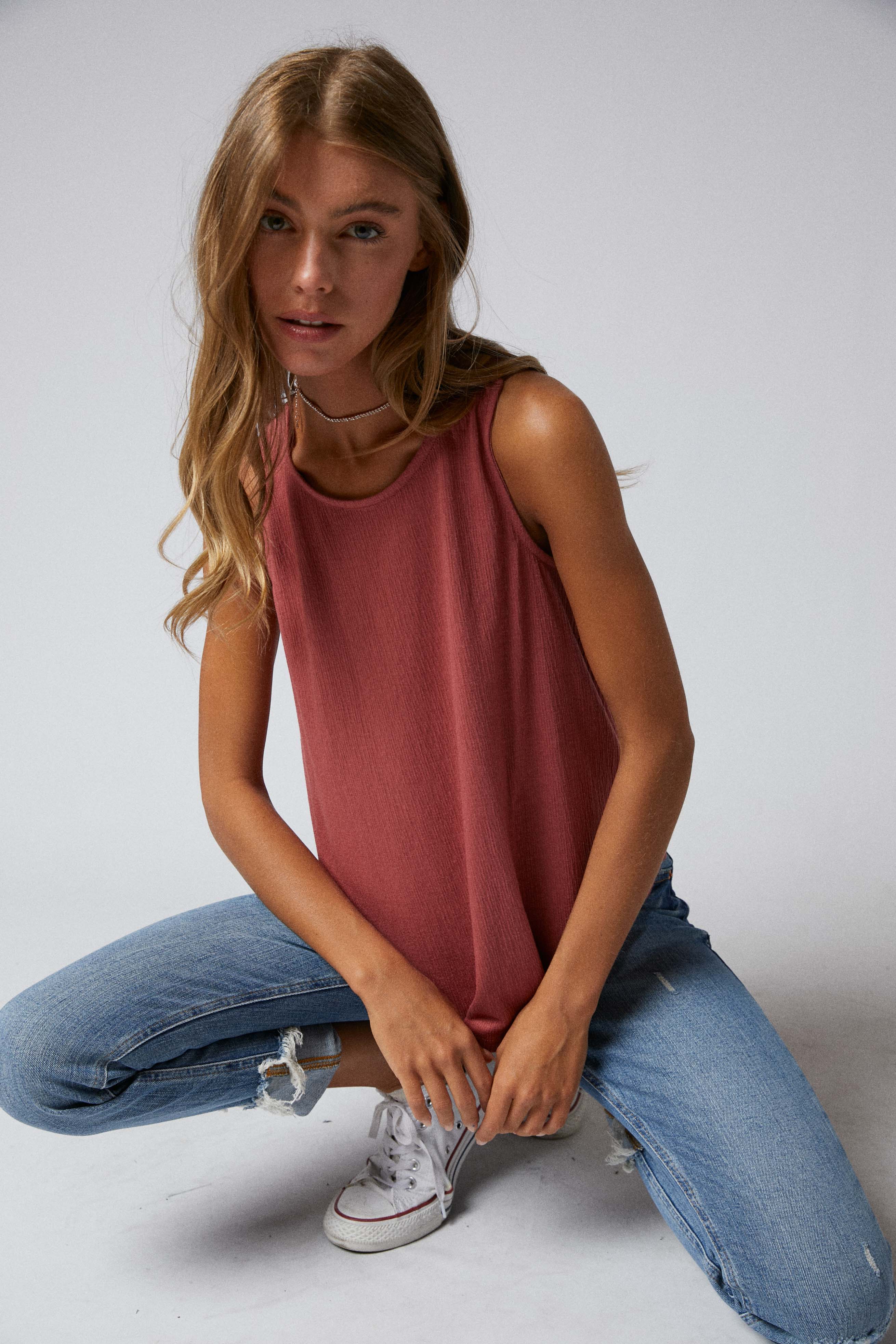 T5427-K41 Sleeveless Back Lace Patch Crinkle Knit Swing Top