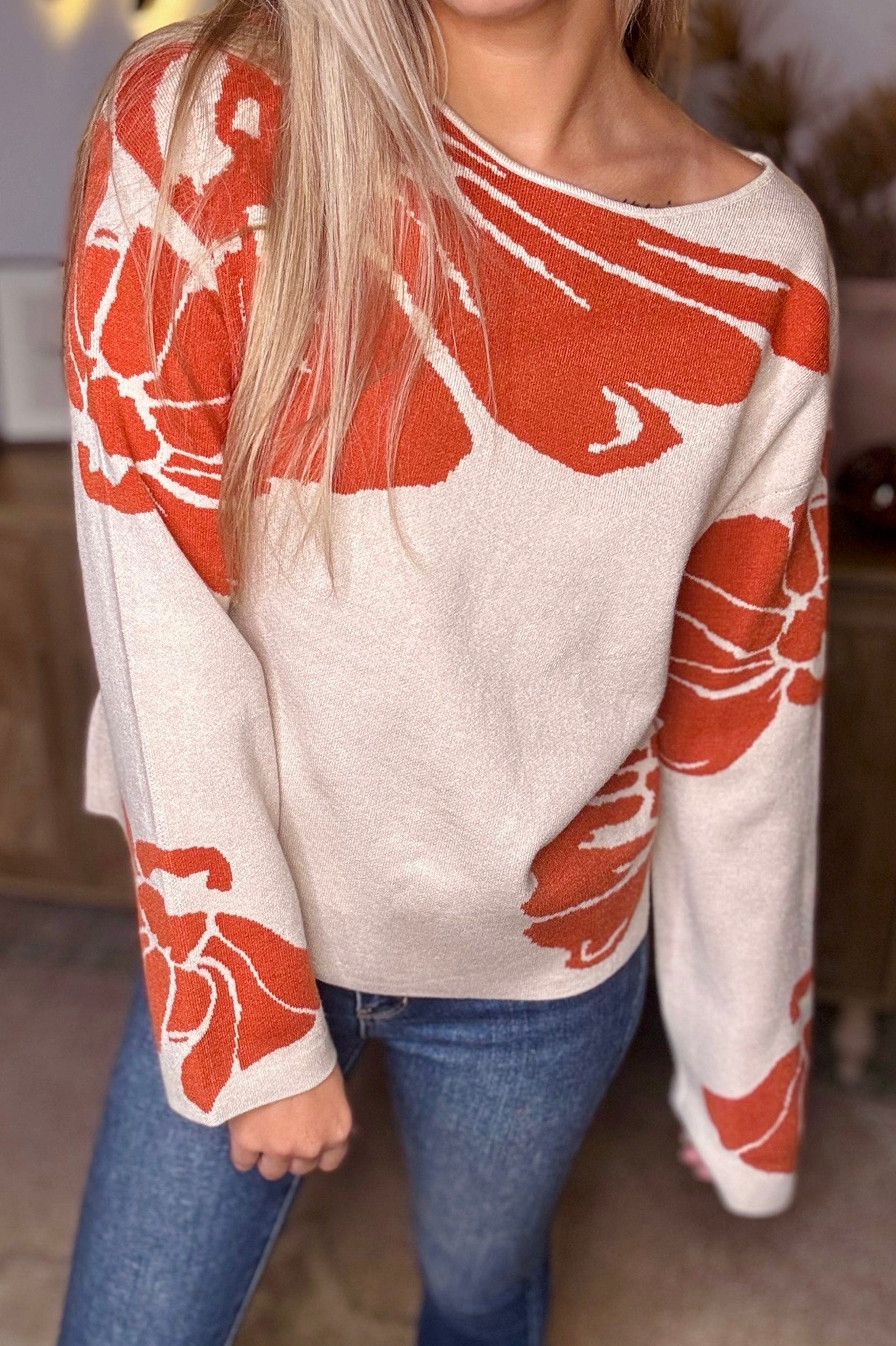 Beige Bold Flower Pattern Southern Girl Baggy Sweater
