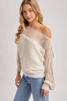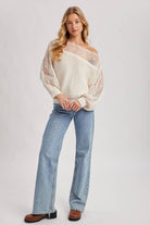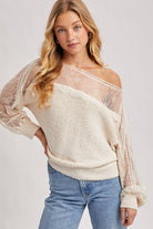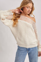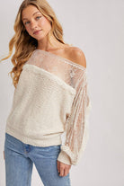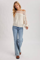 The relaxed silhouette drapes beautifully while the semi-sheer lace detailing creates subtle texture and visual interest. Dress it up with tailored denim and boots for brunch or style it casually with leggings for everyday wear. This lace-trim knit sweater is a must-have staple for women who love soft neutrals, romantic textures, and timeless boutique style.