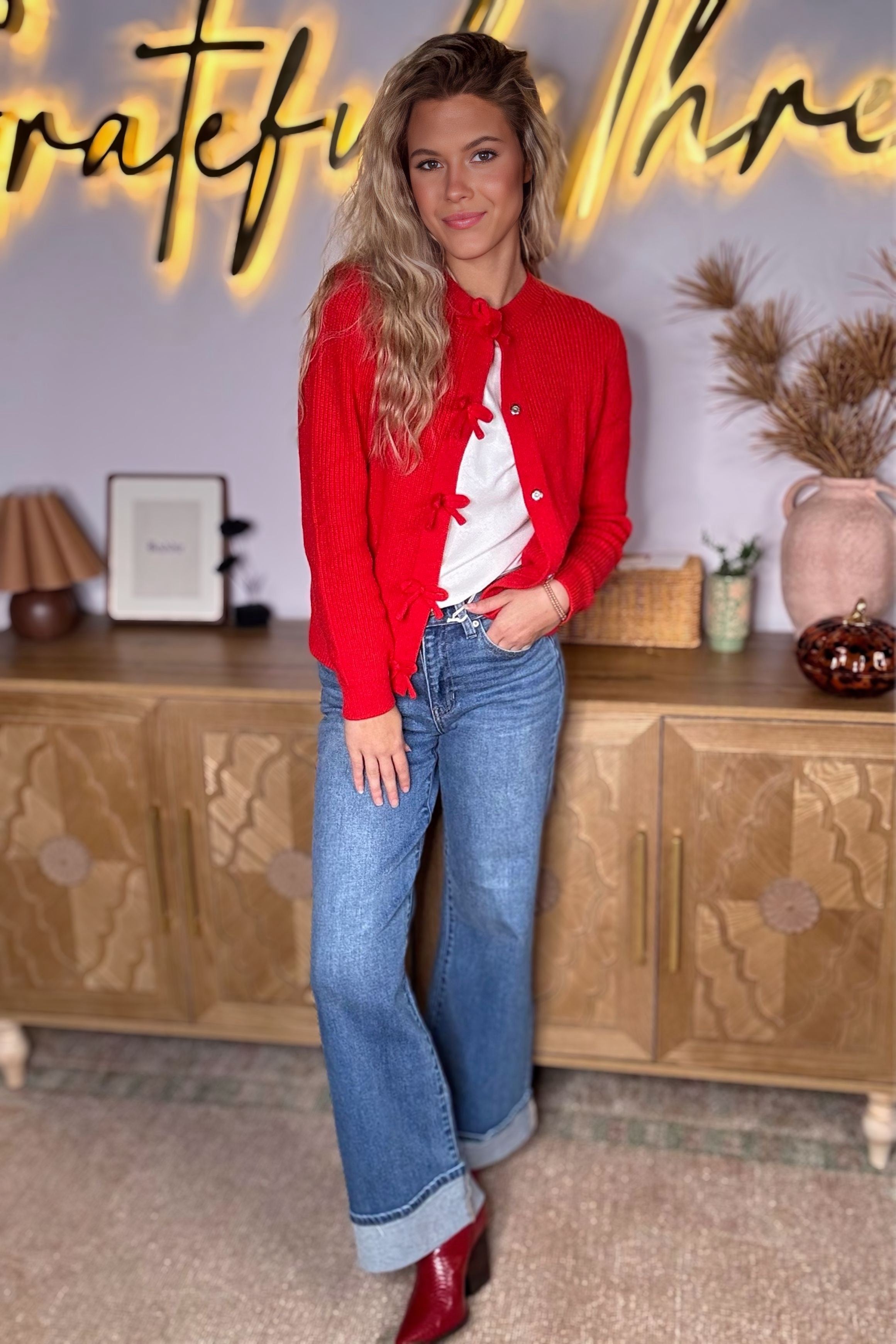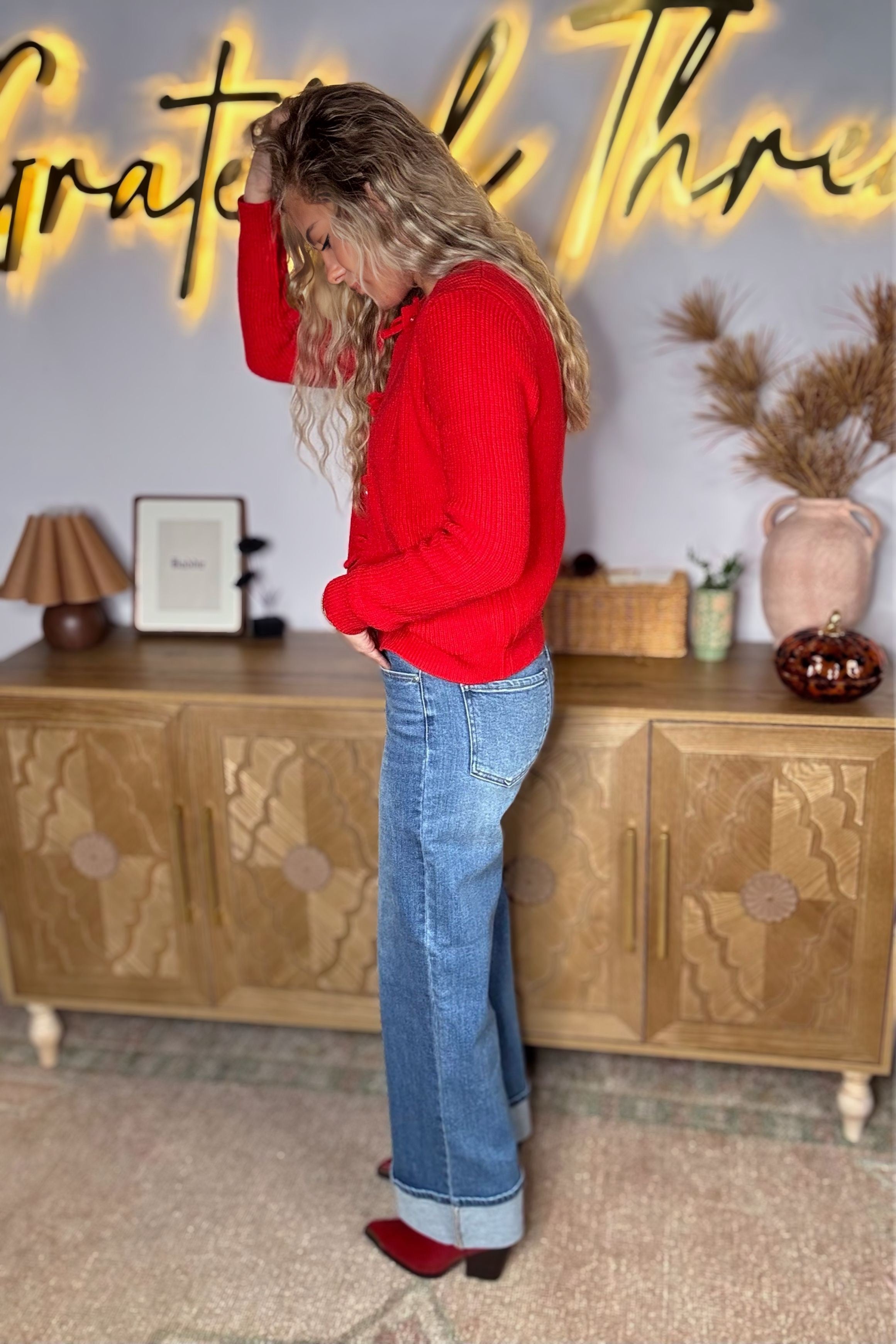 Fiery Red Knit Bow Cardigan
