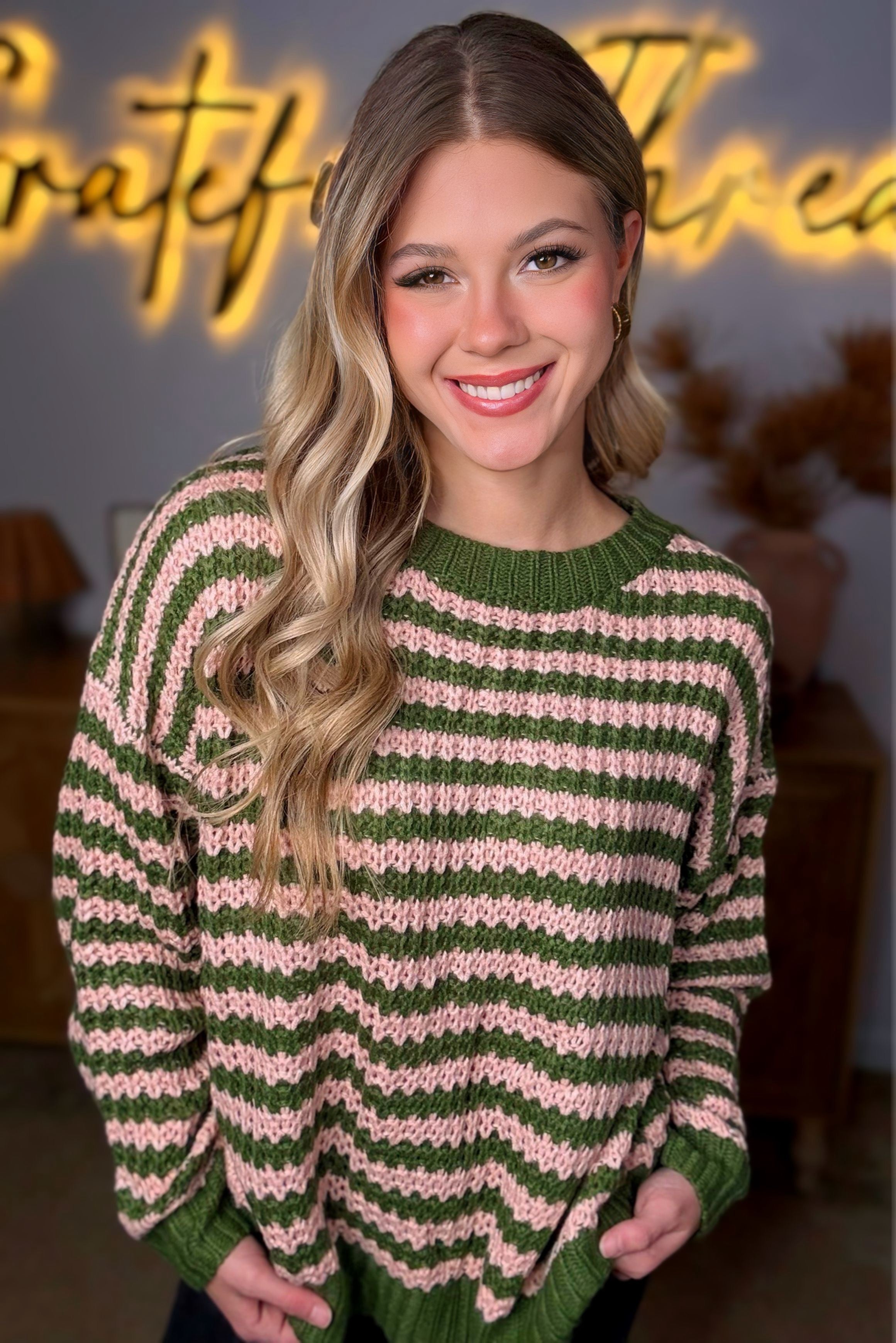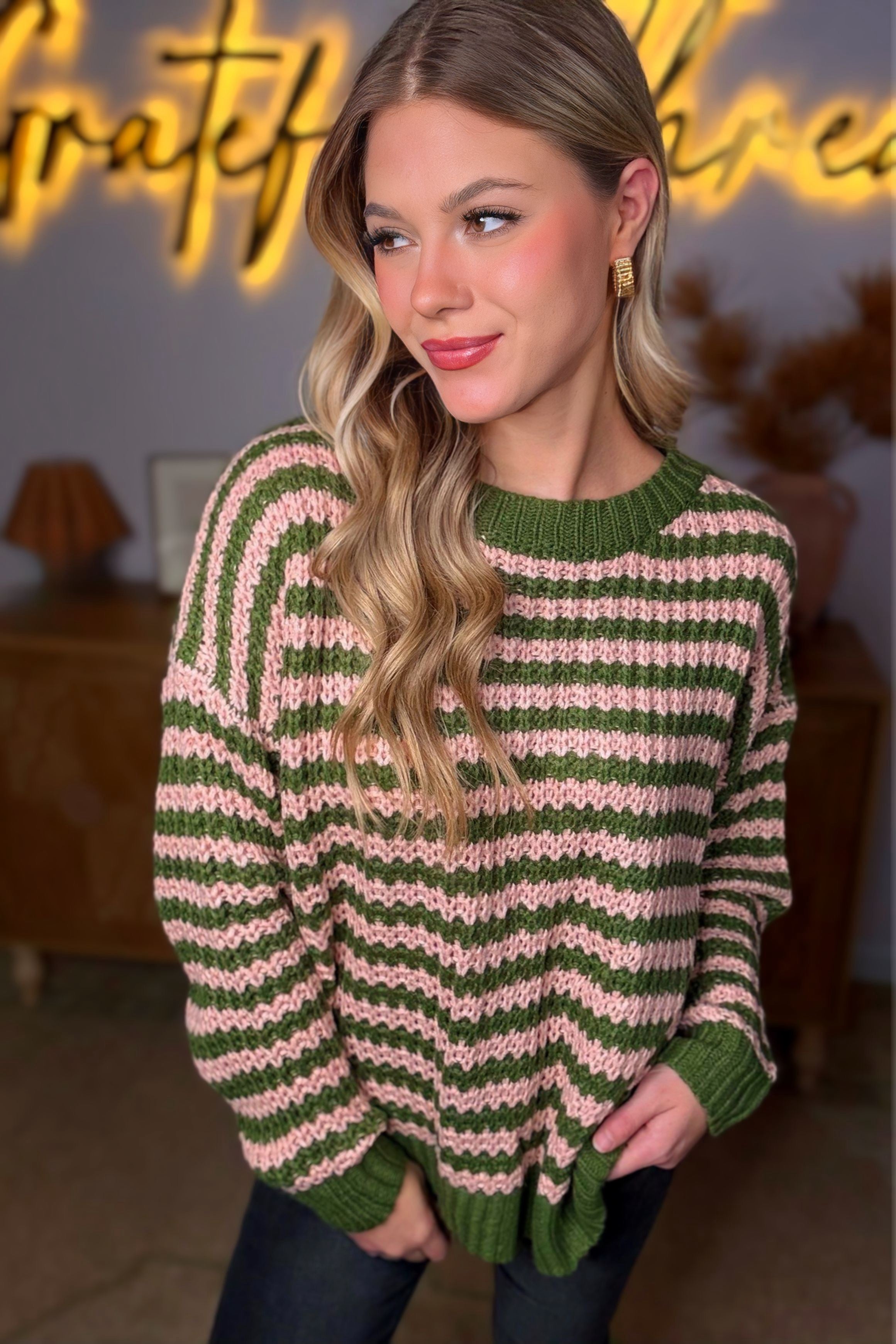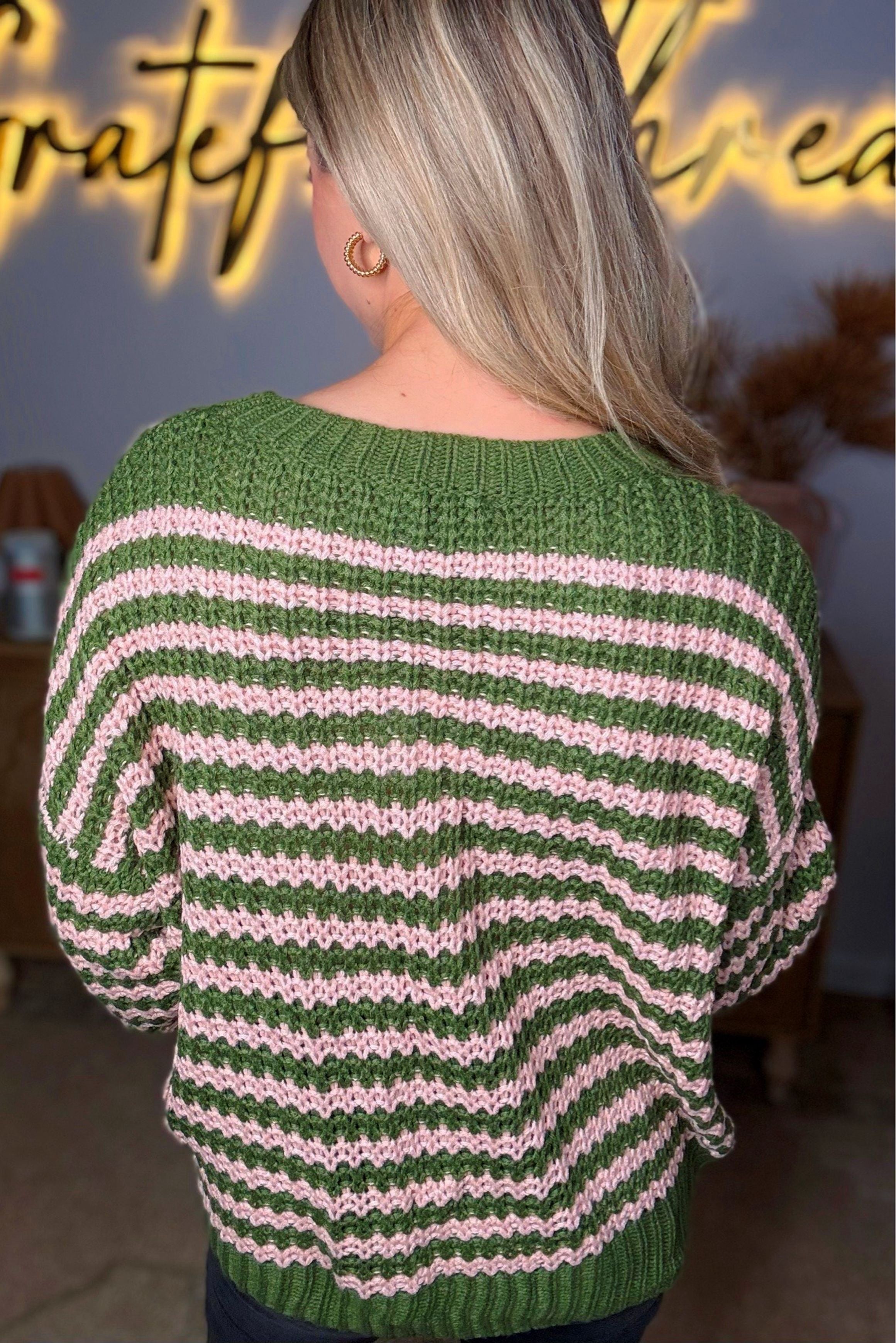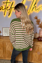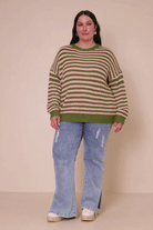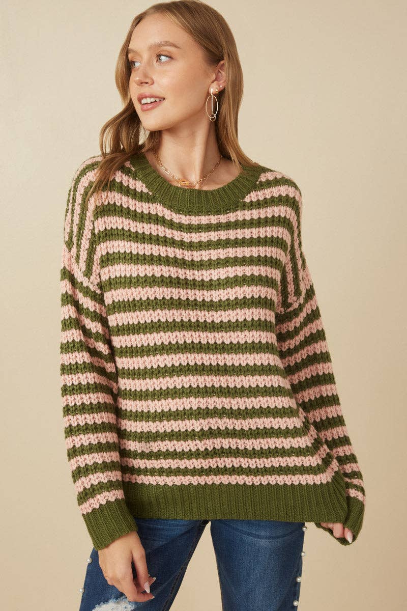 Hayden LA - Womens Striped Drop Shoulder Low Gauge Sweater: Olive & Pink Mix