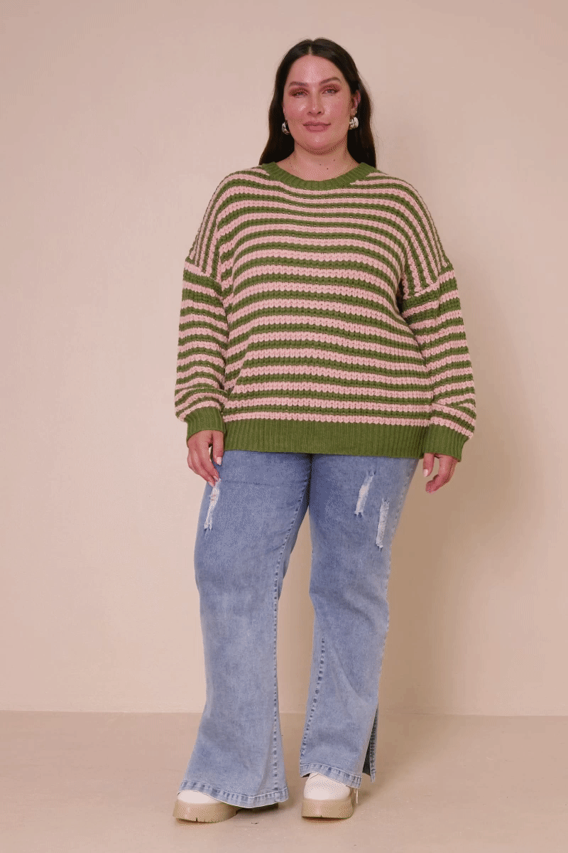 Product Details: Our Striped Drop Shoulder Low Gauge Sweater Features: * Striped Knit Sweater * Round Cut Neckline * Drop Shoulder Measurements: Size Length Chest Small 25" 24.5" Medium 26" 25.5" Large 27" 26.5" 1XL 28" 28.5" 2XL 29" 30.5" 3XL 30" 32.5" The measurements in the chart above reflect the garment laying flat. For body measurements please visit our Size Guide. Model Stats: * Height: 5'10" * Bust: 34" * Waist: 24" * Hip: 35" * Wearing Size: S * Plus Model Height: 5'9" * Plus Model Bust: 44" * Plus Model Waist: 35.5" * Plus Model Hip: 48" * Plus Model Wearing Size: 1XL Material & Care: * 100% Acrylic * Hand Wash Cold * Hang Dry