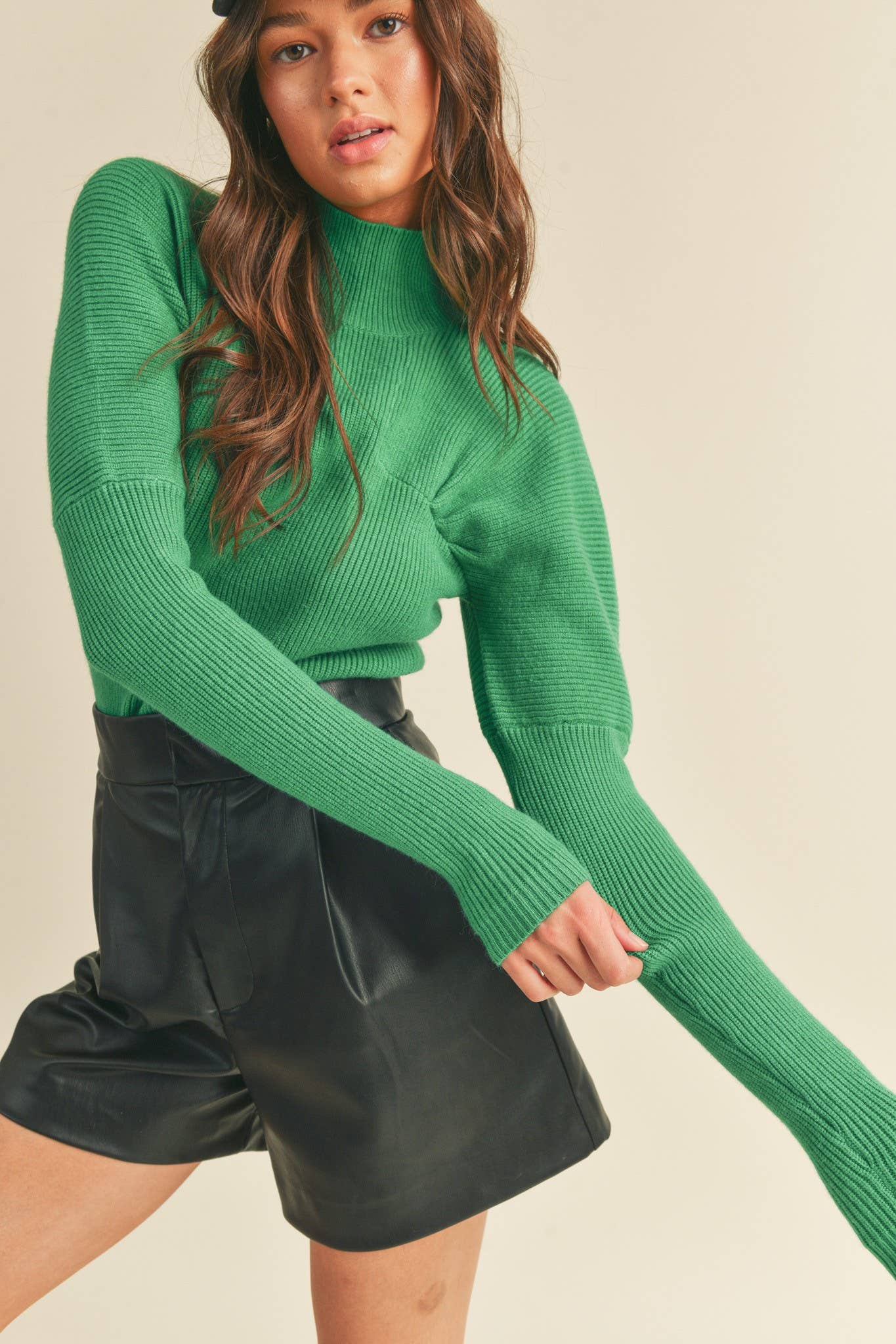 Turn heads in color AND confidence with our Kelly Crush Ribbed Mock Neck Sweater by &merci. This vibrant beauty features a sleek mock neckline, a flattering fitted bodice, and ribbed knit texture from top to hem for that snug-but-stretchy feel we all love. Subtle shirring details add a touch of shape, while the drop shoulders and extra-long cuffs give it that effortlessly cool, slightly slouchy vibe.