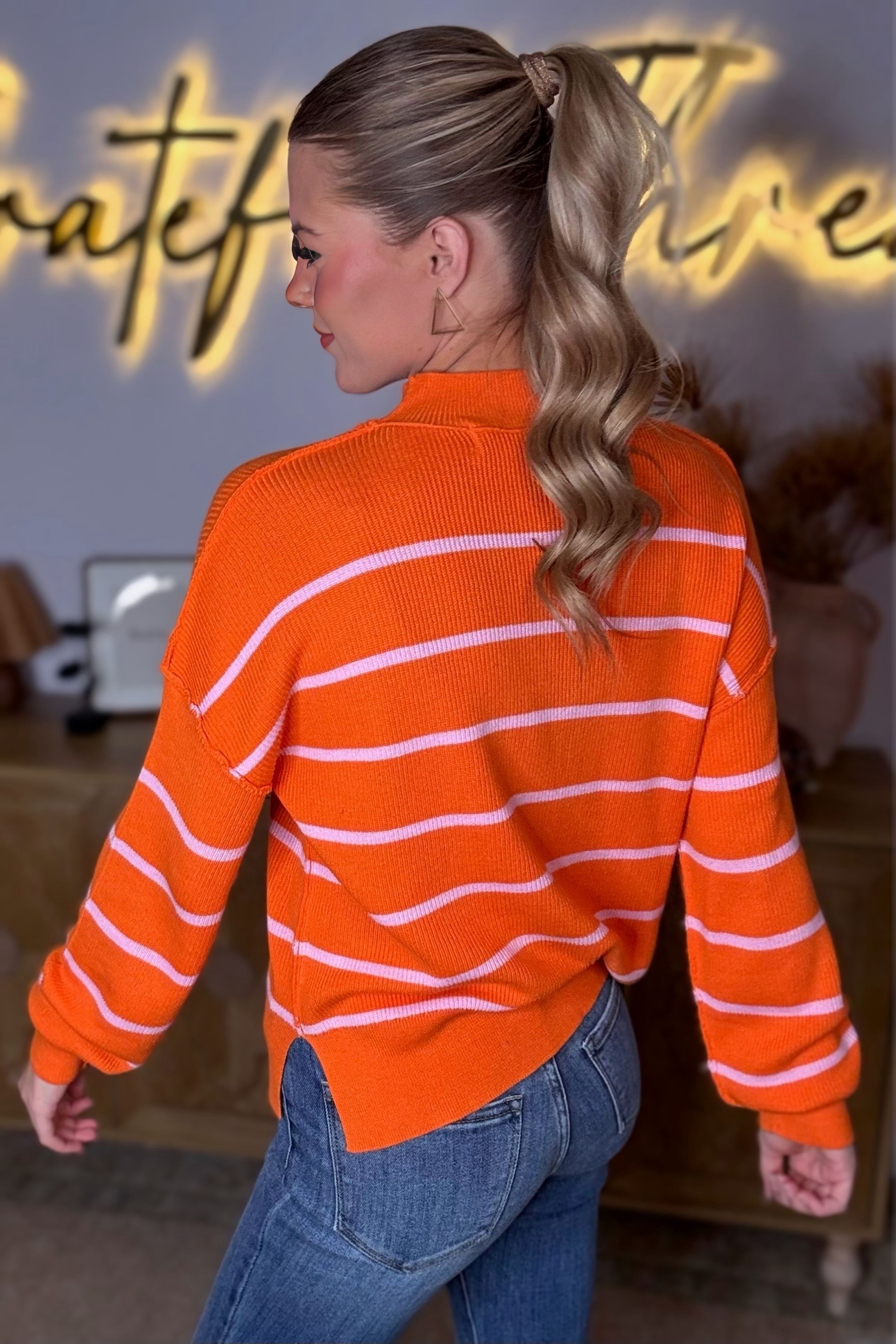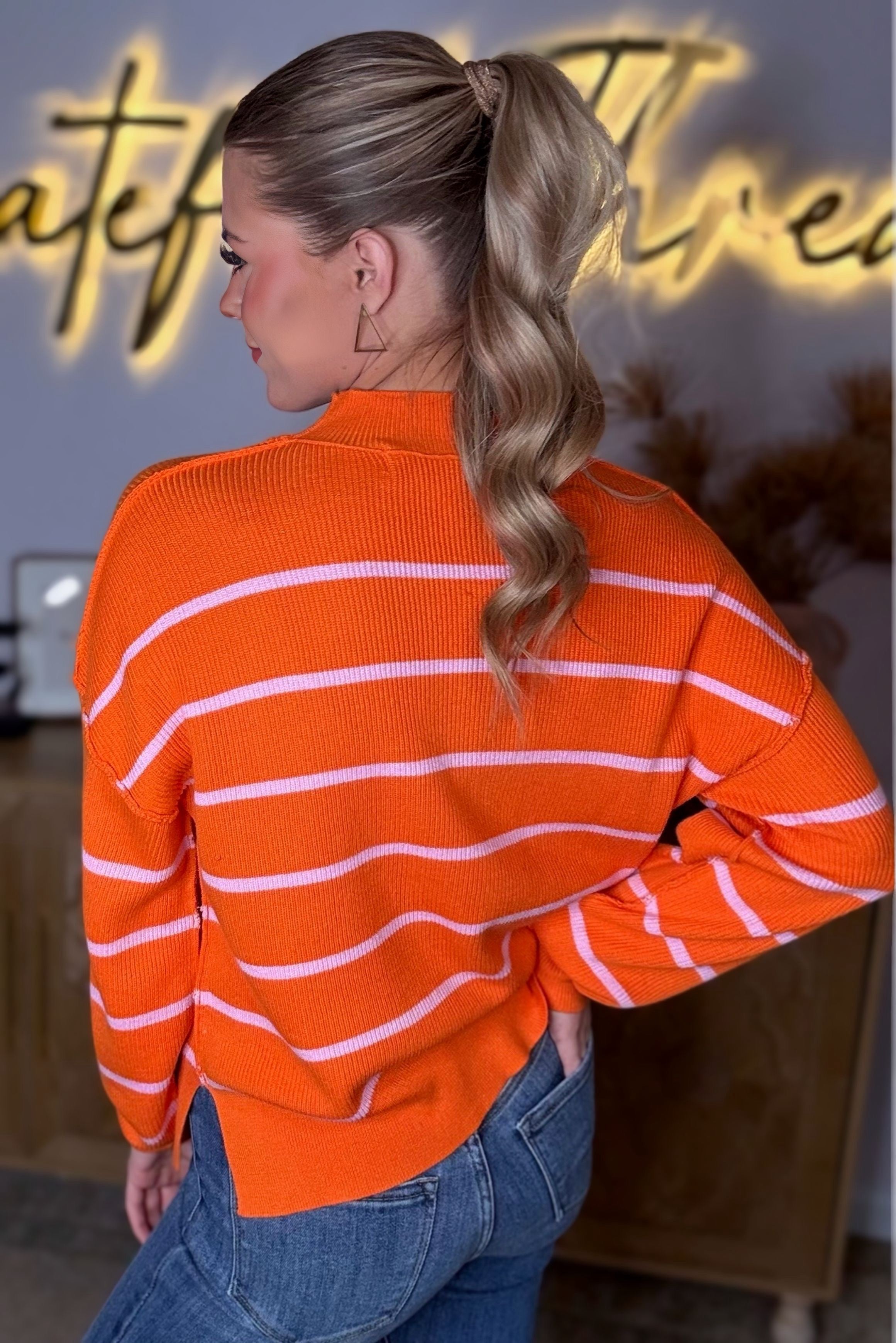 Orange Stripe Ribbed High Neck Drop Shoulder Loose Sweater