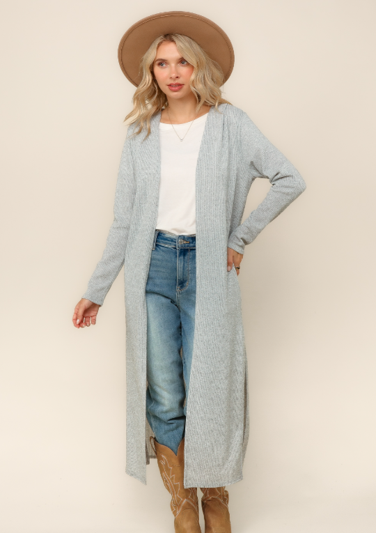 Designed with long sleeves and an open front silhouette, it layers beautifully over your favorite tops, tees, and dresses. The longer length and subtle side slits create a flattering, flowing fit that moves with you while adding just the right amount of cozy coverage.