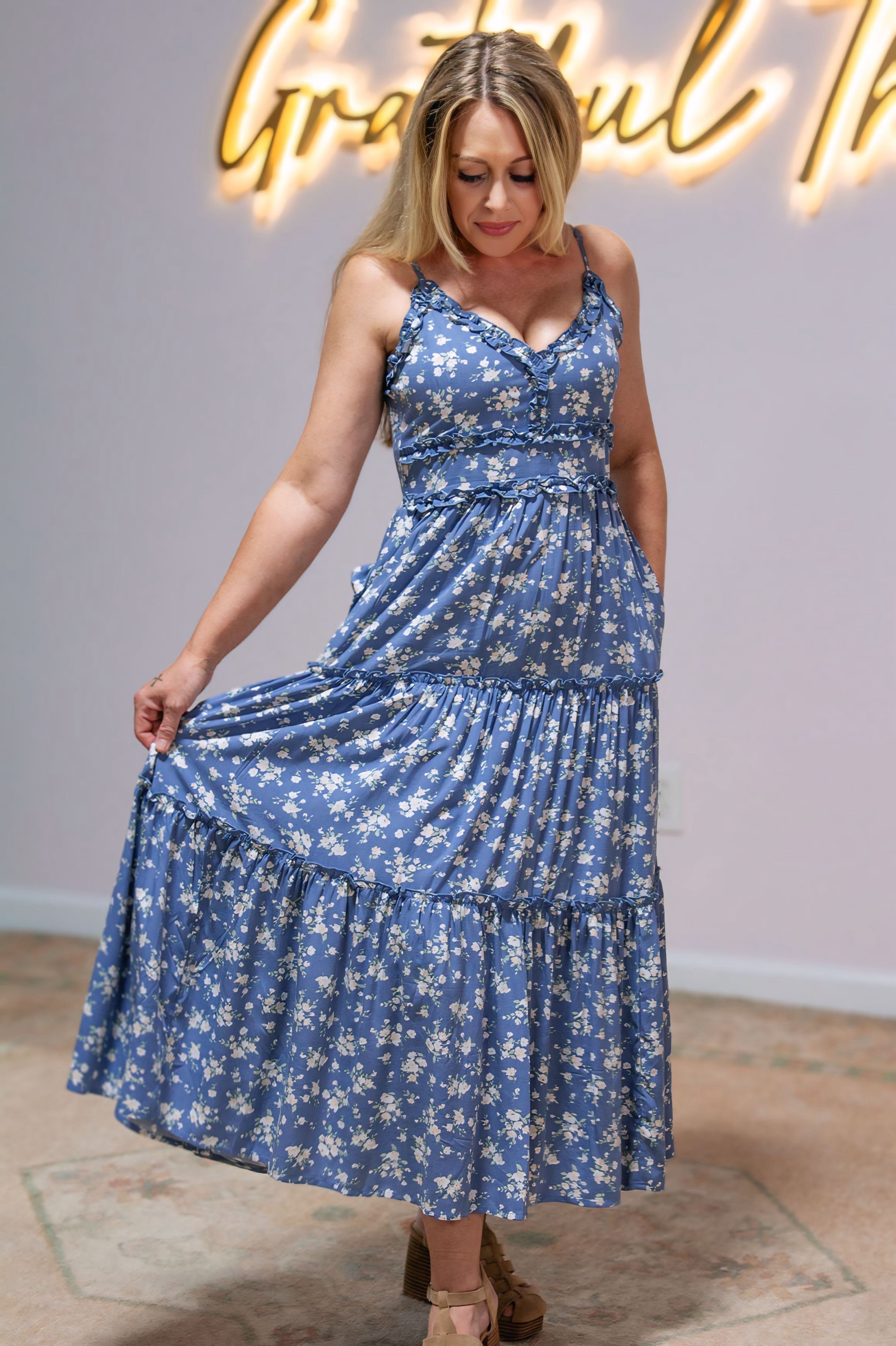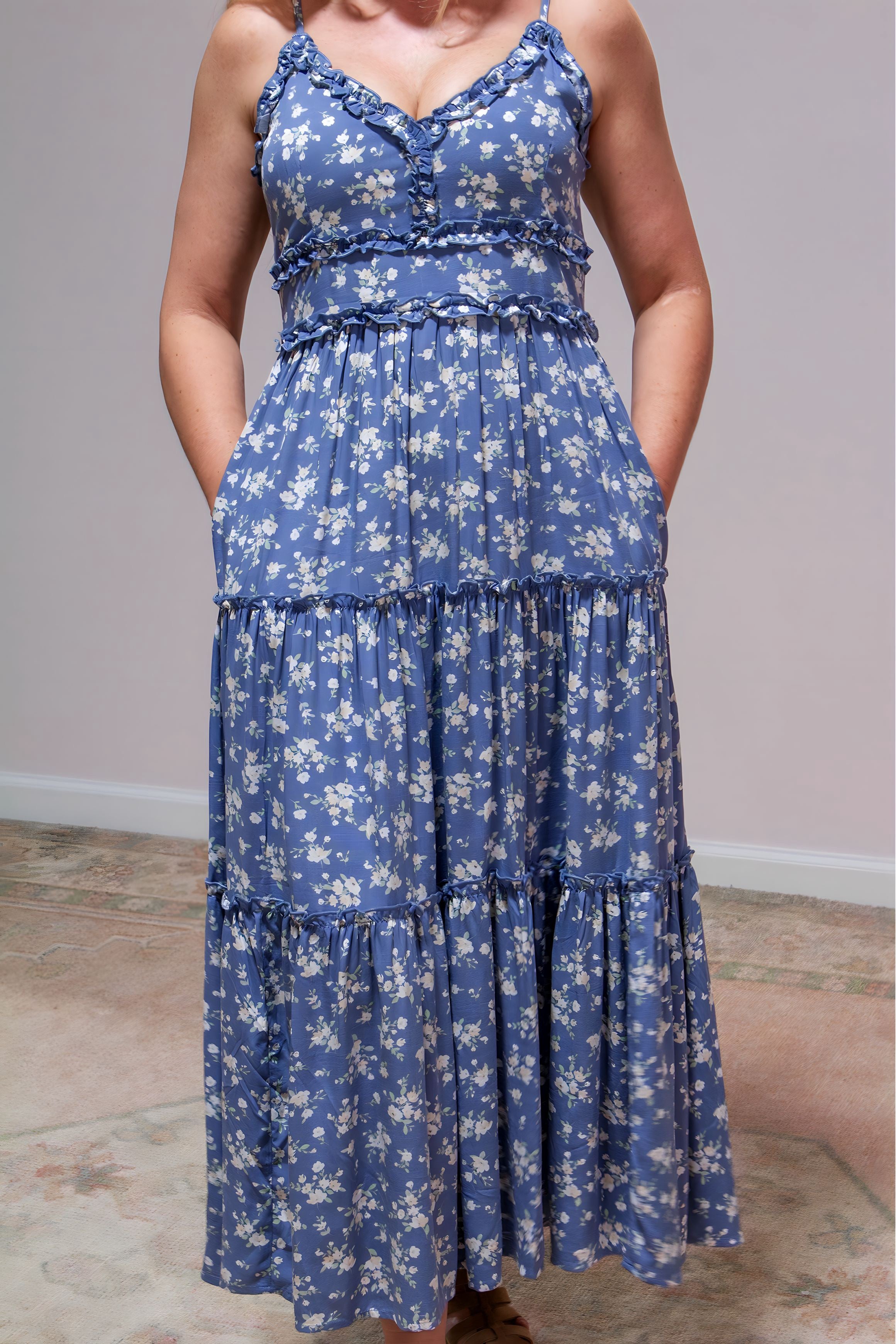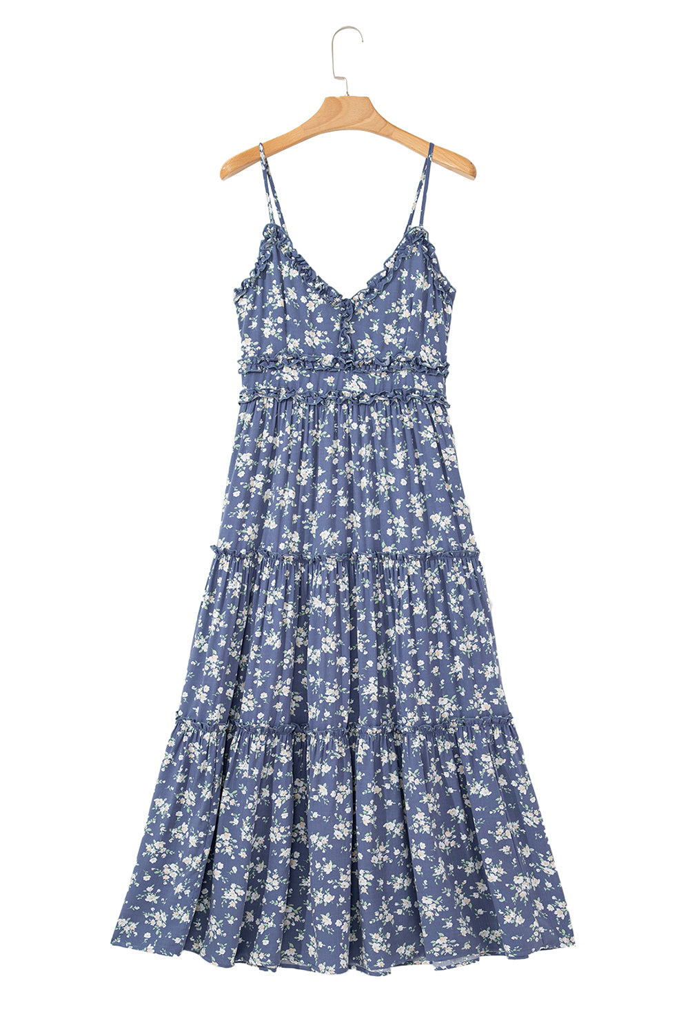 Blue Floral Spaghetti Strap Frilled V Neck Tiered Midi Dress