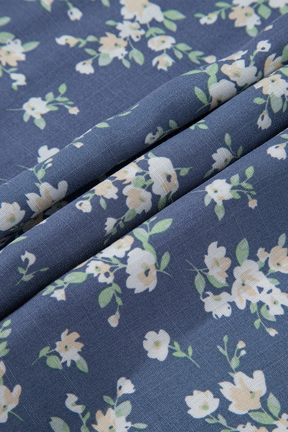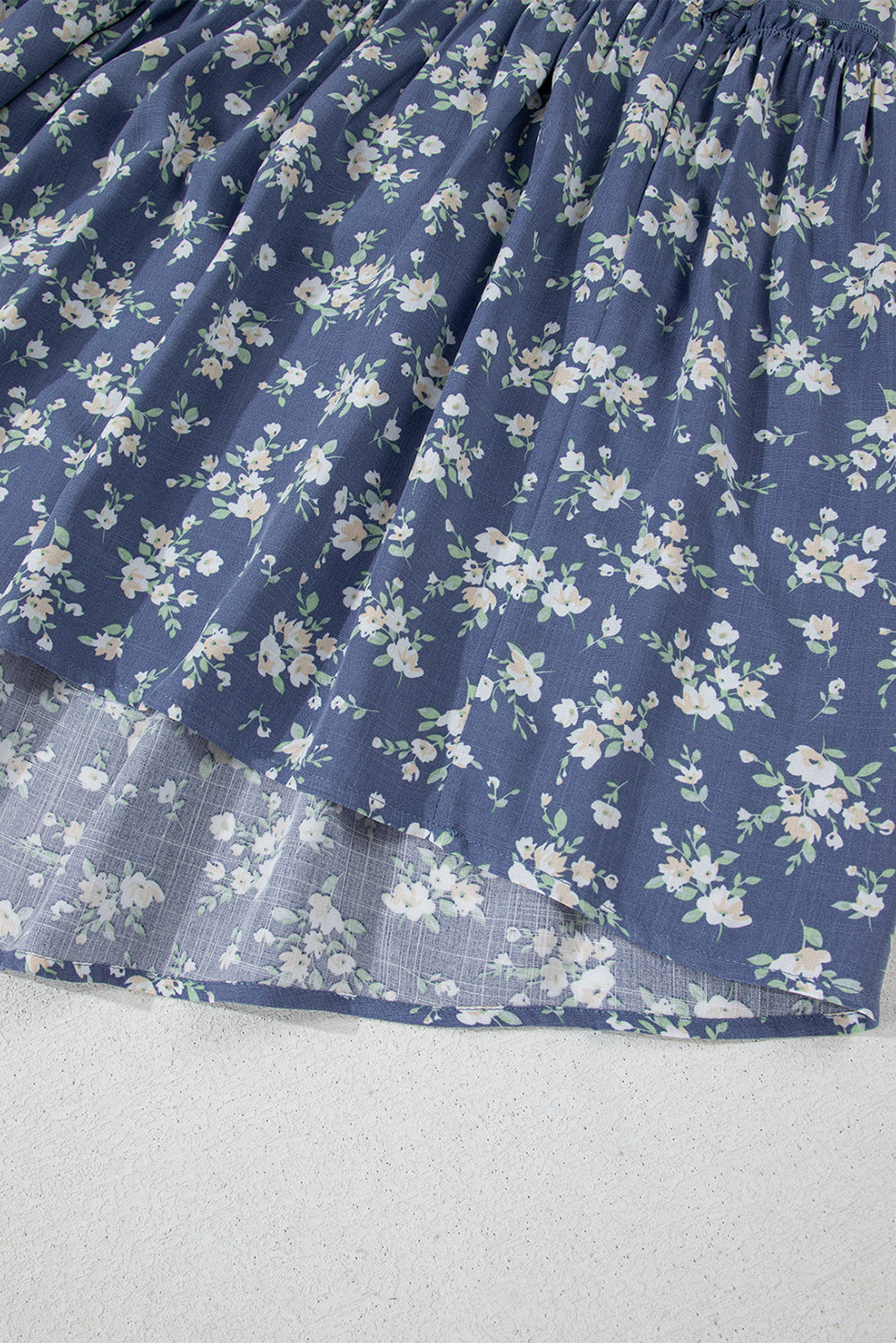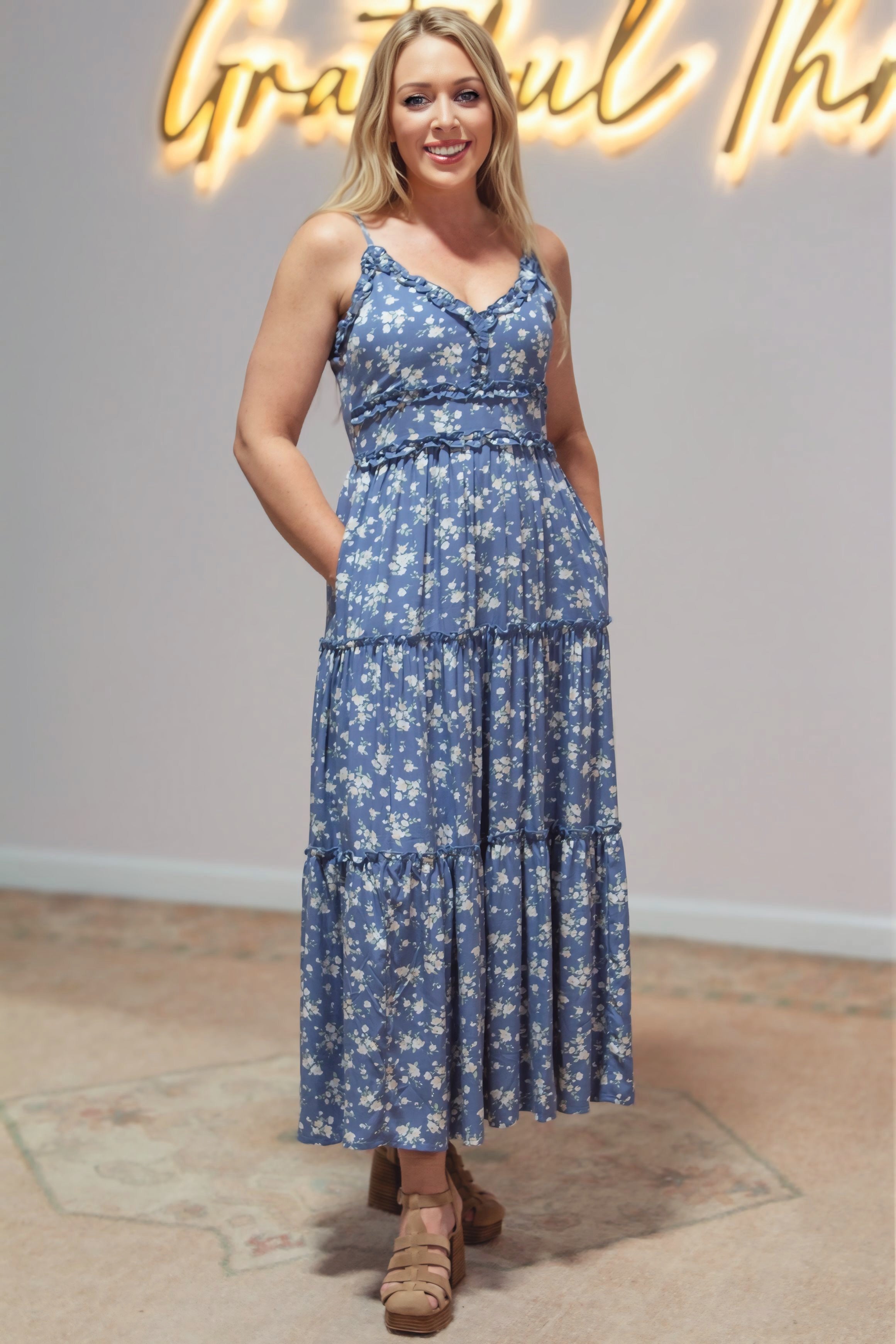 Blue Floral Spaghetti Strap Frilled V Neck Tiered Midi Dress